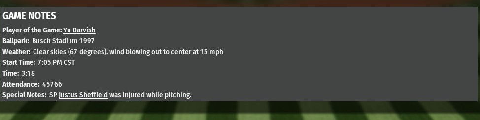 Allen Cordoba led off with a single off St. Louiis starting pitcher Yu Darvish. He stole second, went to third on a sacrifice bunt by Mookie Betts and scored on a Joey Gallo sacrfice fly, as Kansas City took a 1-0 lead and would never trail in a 5-3 win at Busch Stadium (1997). Gallo hit a solo homer off Darvish in the third inning. It's lead down to 2-1, the Pit Masters added two more runs in the fifth on a Brian Mundell homer, also off Darvish. Kansas City added its final run in the seventh after Mookie Betts led off with a single off River Walkers relief pitcher Reyes Moronta. He stole second and moved onto third on a wild throw from catcher J.T. Realmuto. Betts scored when St. Louis second baseman Bo Bichette made a wild throw to first on a ball hit by Willy Adames. Kansas City starting pitcher Shelby Miller allowed one run on six hits over six innings. He struck out two and walked one. Juan Minaya and David Berg kept the Walkers quiet in the seventh and eighth innings, respectively. Drew Anderson recorded all three outs in the ninth for his first save.  |