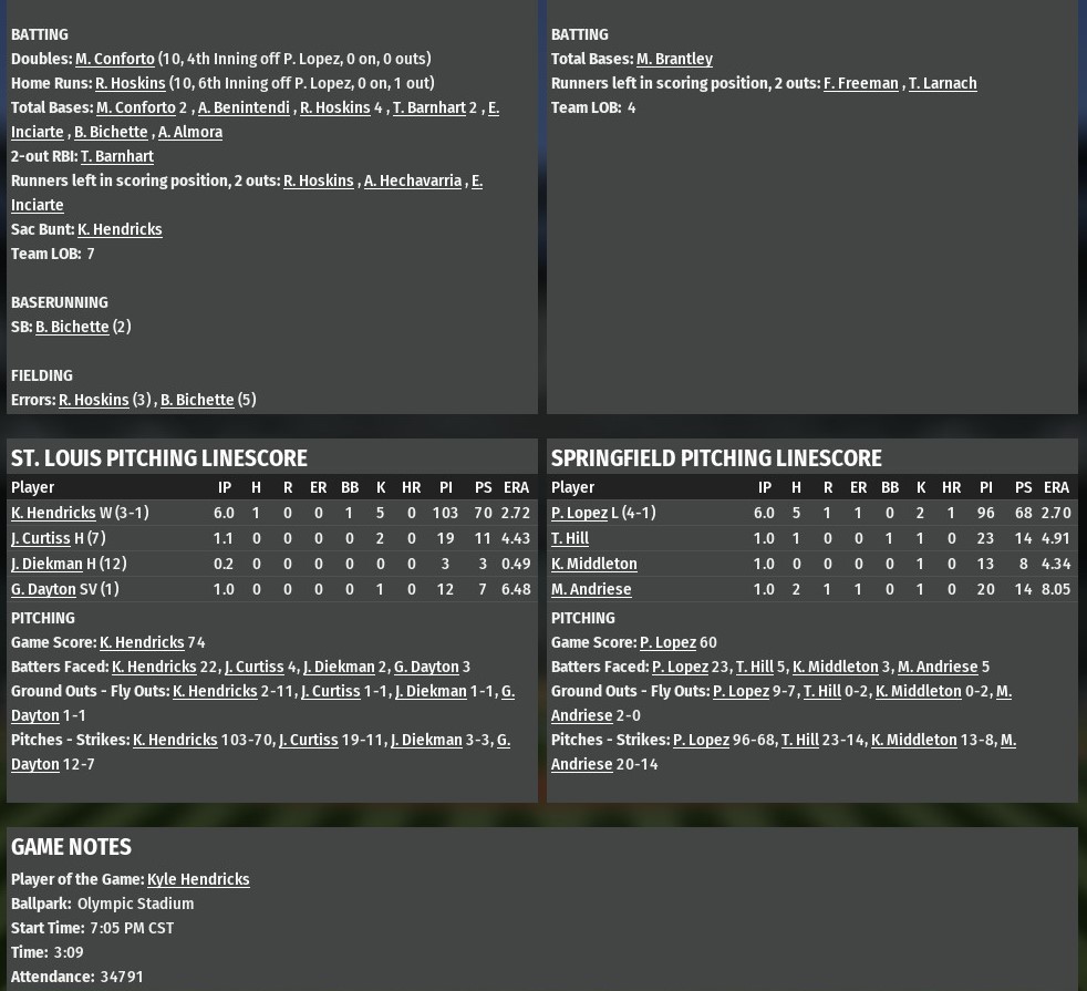 Kyle Hendricks took a no-hitter into the sixth inning after Rhys Hoskins had hit a solo homer in the top of that inning to help give St. Louis a 2-0 win over Springfield at Olympic Stadium. Hendricks did not allow a hit until a pinch-hit single by Michael Brantley with one out in the sixth. Errors by Hoskins at first base and by second baseman Bo Bichette allowed the Prairie Fighters to load the bases with two outs. But Hendricks struck out Trevor Lanarch to get out of the jam. The River Walkers got their second run in the ninth after Bichette led off with a single off Matt Andriese. He stole second and scored on a two-out single from Trevor Barnhart. John Curtiss relieved Hendricks after the sixth inning and pitched a scoreless seventh and recorded the first out of the eighth. Jake Diekman finished off the eighth. The ninth belonged to Grant Dayton who recorded his first save without an incident.  |