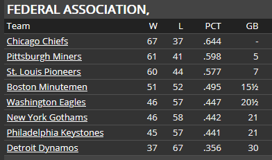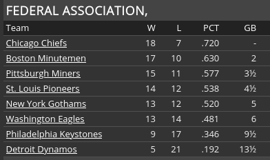5/11 @ St. Louis, W, 10-6 5/12 vs Washington, L, 12-6 5/13 vs Washington, L, 10-6 (11) 5/14 vs Washington, L, 8-4 5/15 vs Philadelphia, L, 3-0 5/16 vs Philadelphia, W, 2-5 5/17 vs Boston, W, 2-3 5/18 vs Boston, W, 6-8 5/19 vs Boston, L, 7-4 5/20 vs Pittsburgh, W, 0-2 5/21 vs Pittsburgh, W, 7-11 5/22 vs St. Louis, L, 6-4 5/23 vs St. Louis, L, 10-3 5/24 vs St. Louis, W, 3-5 ![]() Top Performances: * Bob Martin: .500/.545/.833, 4 2B, 2 HR, 8 RBI * Tom Bird: .421/.522/.421, 4 R * Jim Hampton: .429/.448/.500, 4 RBI * Larry Brown:, 1-0, 0.00 ERA For the week ending 5/23, Bob Martin was named the Federal Player of the Week. The runs/game for the Chiefs is still slightly below average--despite the fact that they are 1st in batting average, 2nd in on-base percentage, and 2nd in slugging percentage, they are only 6th in runs scored. If we want to stay in the race this summer, the scoring needs to become more efficient. ![]() Bob Walls is getting knocked around pretty good, and so he is returning to Fort Wayne and Red Hampton will be recalled to take his place. We need to put our best pitching foot forward in the Gothams series this week.