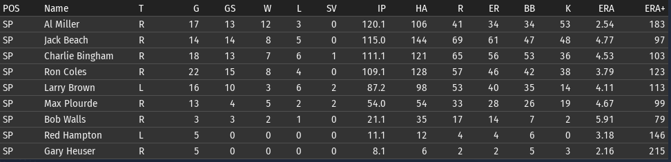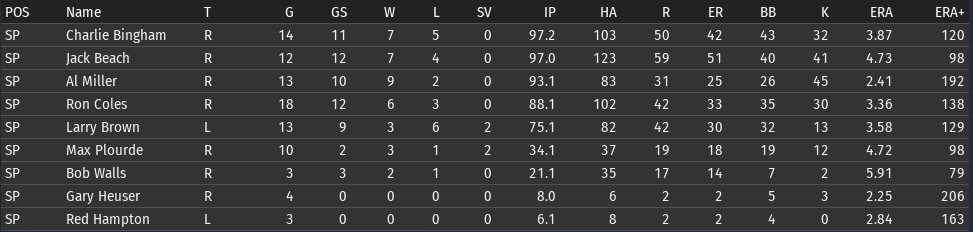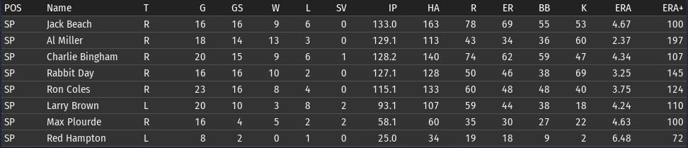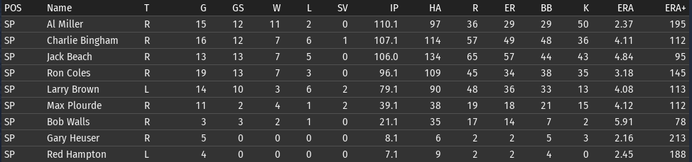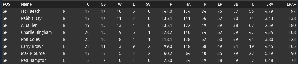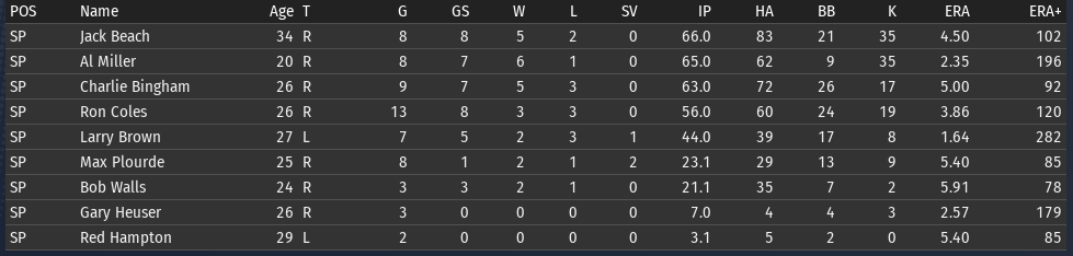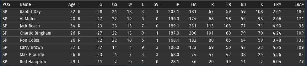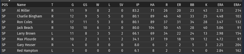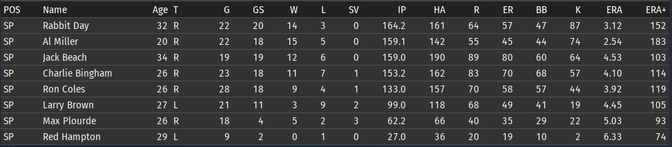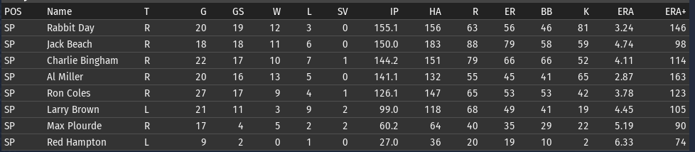 Pete Layton continues to be amazing; his slash line for Chicago: .456/.509/.699 (OPS+ 205). The offense overall is functioning a lot better than it was before the all-star break. Bennie Griffith is having a great month: .394/.459/.576. He is starting to get the majority of the playing time in center. If Griffith can get his OPS+ above 100, then it will be the short stop position that is the only one below average. ![]() Rabbit Day is starting to look more comfortable with his new club (2-1, 3.21 ERA)--though Charlie Bingham is the pitcher having the best month (2-1, 2.16 ERA). Al Miller is having a bit of a rough stretch--if you look back over his last 4 starts, 3 of them have been not so good. One against Boston and two against Washington, which are the two clubs that have given him the most trouble. Opponents batting average by team for Miller: