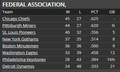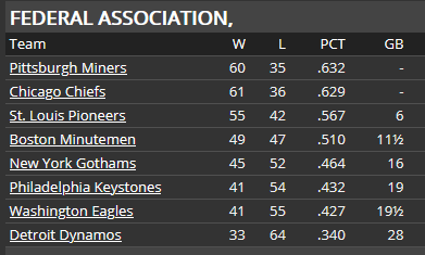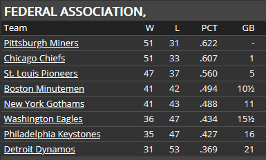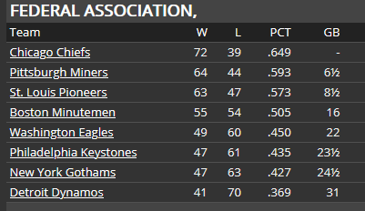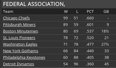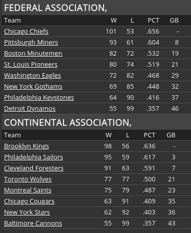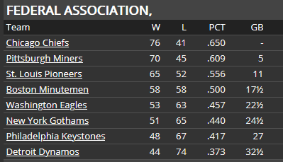 CHIEFS CLAIM FEDERAL PENNANT The Chiefs can trace their history back to 1876 as one of the founding members of the Century League--the precursor of the Federal Association. They won two pennants in the 1880s, but then wouldn't win another until 1917. They won again in 1928, but that has been it--four pennants in 60 years. And now this season, they have won their 5th. Chicago is also sitting at 99 wins with four games left to play. The Chiefs have never won 100 games--the previous high was set by the 1928 pennant winning club at 95. Even more history was made yesterday when Jim Hampton cracked a single to right field for his 2000th hit. Hampton becomes the fourth Chicago player to achieve the 2000 hit mark, joining Joe Masters (2238), Jim Shelton (2184), and Fred Feiden (2019). Hampton will have a chance to take over the career lead from Masters in 1937. Hampton has won two Federal Association batting titles (1928 and 1930) and is a .339 career hitter. And speaking of Joe Masters, manager Jim Gentry has indicated that Masters will start at third base in the final two games of the season next Saturday and Sunday against the St. Louis Pioneers at Whitney Park. It will be a nice send-off in front of the Chicago faithful for Masters who has announced the he will retire at the end of the season. Gentry also mentioned that he doesn't expect Rabbit Day or Al Miller to start any of the remaining 4 games this season, as the Chiefs are now focused on getting ready for the championship series. ![]() ![]()