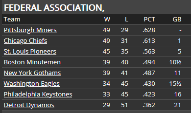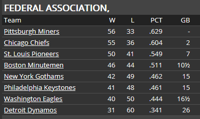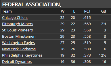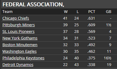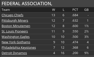 Well, not only did we sweep Pittsburgh, we won the first two games of the Boston series to extend the winning streak to 16 games before losing on Sunday. We now have a 5 game lead in the Fed. There is still a lot of baseball left and a lot can happen--in mid-July the Chiefs were trailing the Miners by 4 games after all. And 7 of the next 10 games are with St. Louis (4 this week in St. Louis). The Pioneers can be a dangerous club, so this is their chance to get back into the race.