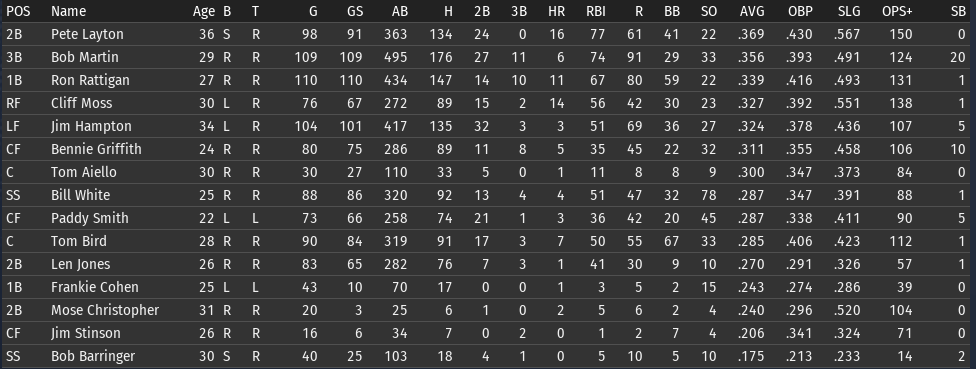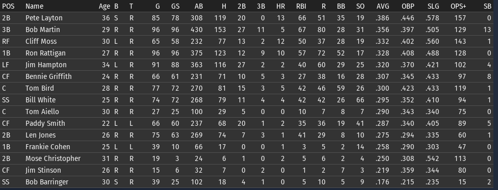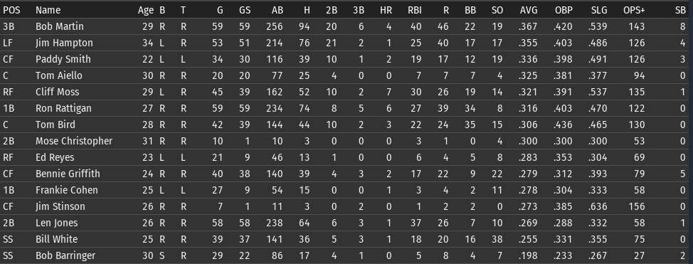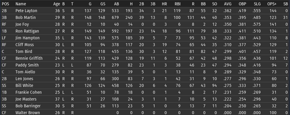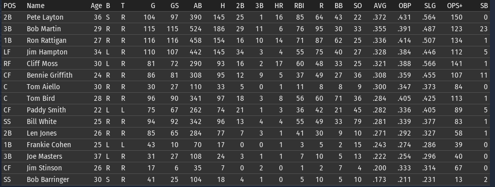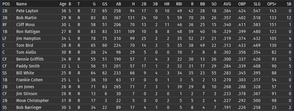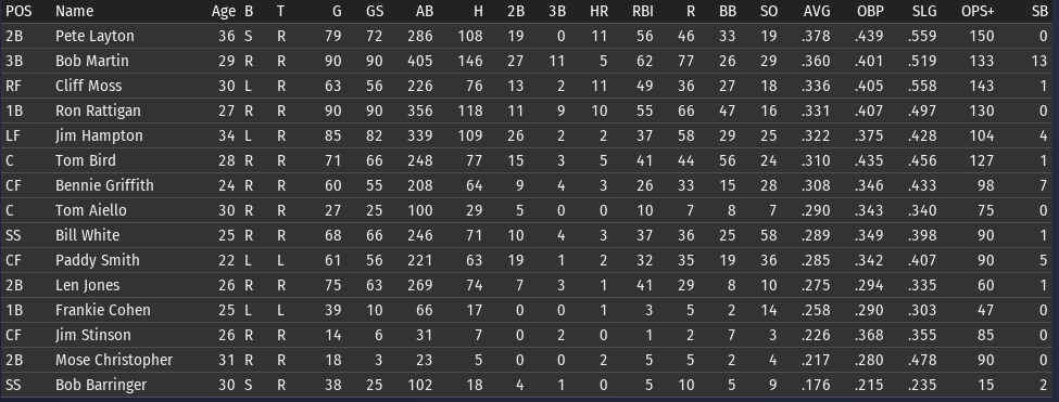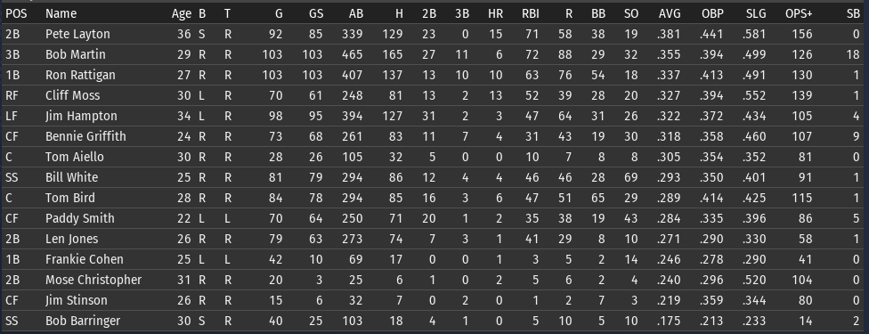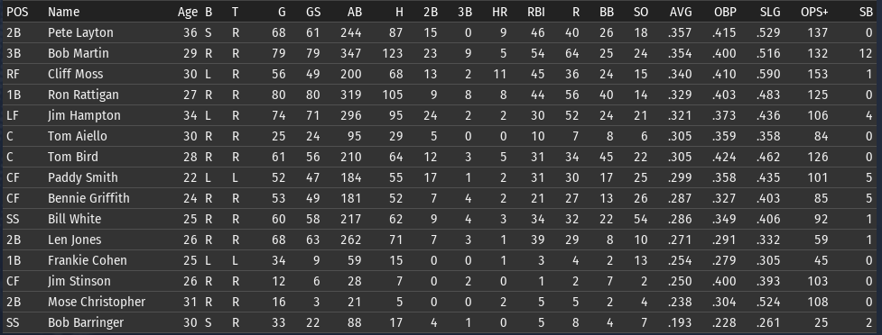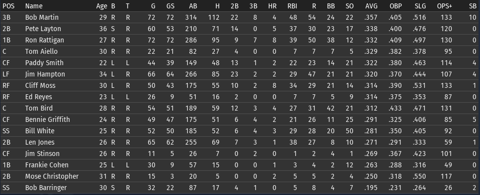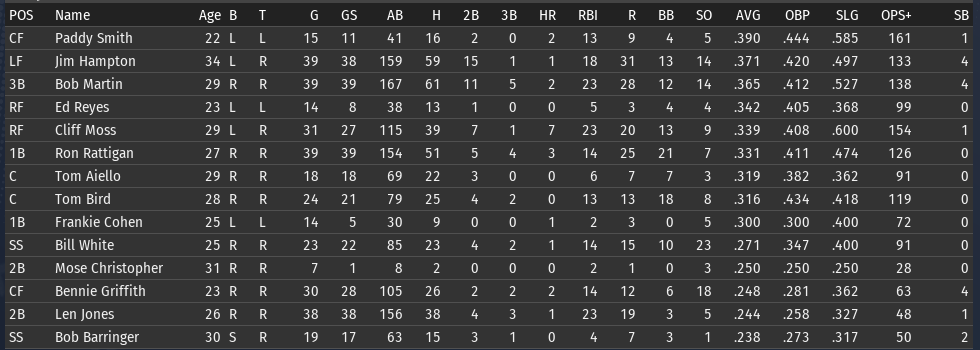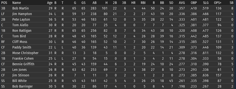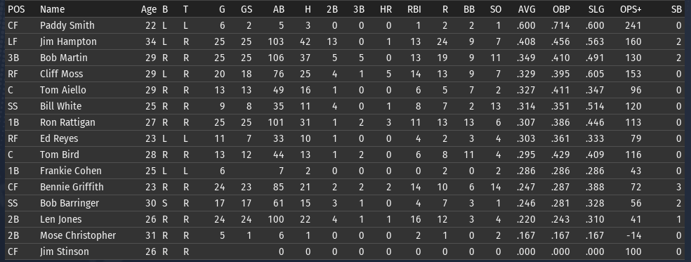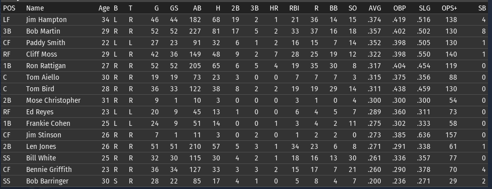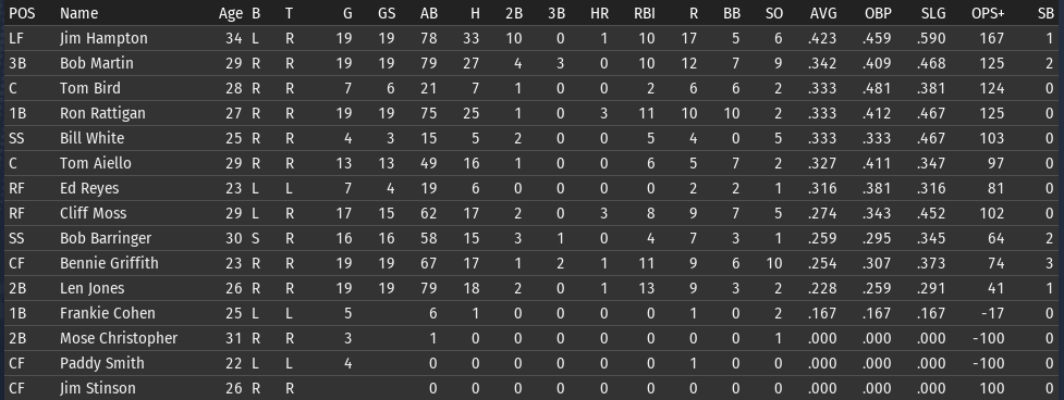 This weeks brings the Keystones in town for 4 games, and the Eagles in for 3. 6/15 Off day 6/16 vs Boston, W, 3-5 6/17 vs Boston, W, 6-8 6/18 vs Boston, W, 3-9 6/19 vs Pittsburgh, L, 0-6 6/20 vs Pittsburgh, L, 7-5 6/21 vs Pittsburgh, W, 2-8 ![]() Top Performances: * Tom Bird: .381/.480/.619, 2 2B, 4 R, 4 RBI * Ron Rattigan: .364/.462/.545, 2 3B, 7 RBI * Bill White: .300/.364/.700, 2 HR, 8 RBI * Al Miller: 2-0, 2.12 Bob Martin had a down week (.259), so he fell out of the lead in the FA batting race. The batting race leader is now once again Freddie Jones of St. Louis. Jones has hit .457 in June to bring his average to .367. And of course, Jones has won the last two batting races. The hope is that inserting Pete Layton into the middle of the lineup will at least raise the offense into the upper half of the Fed. We will need to score more if we intended to hold off the Miners, Pioneers, and Gothams. So to that end, I'm really excited to see how the new lineup works this week. ![]() Ron Coles and Al Miller are doing the heavy lifting for the pitching staff. Larry Brown remains in a tough slump: in 21 June innings, he has given up 32 hits, 21 runs, 9 walks, and has hit 3 batters. Max Plourde will get some starts in Brown's spot over the next few weeks.
