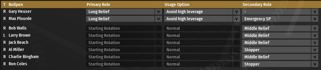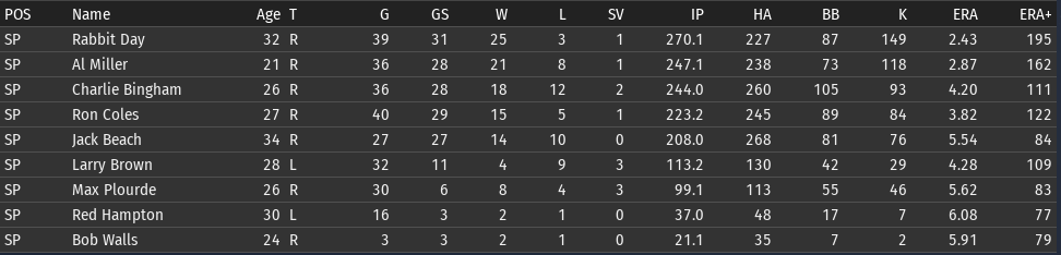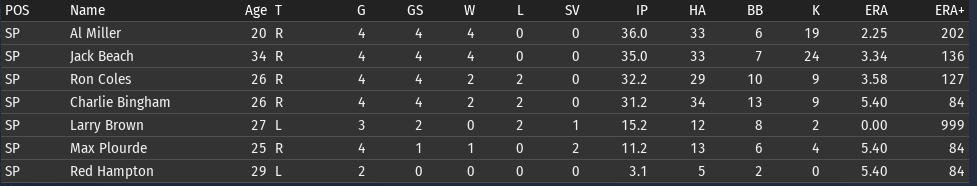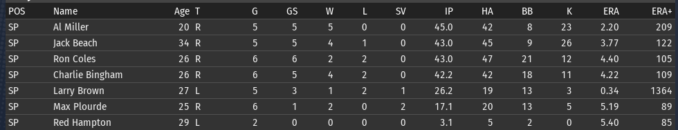 5/4 @ Pittsburgh, W, 6-4 5/5 @ Pittsburgh, W, 7-2 5/6 @ Washington, L, 2-5 5/7 @ Washington, W, 7-1 5/8 @ Off Day 5/9 @ St. Louis, W, 8-7 (11) 5/10 @ St. Louis, W, 5-2 Top Performances: * Cliff Moss: .571/.625/1.286, 2 2B, 1 3B, 2 HR, 6 RBI, 4 R * Jim Hampton: .360/.448/.480, 3 2B, 7 R * Bob Martin: .370/.414/.556, 1 2B, 2 3B, 7 R * Charlie Bingham: 2-0, 0.82 The Chiefs have definitely been benefiting from a full season of Cliff Moss. And Moss loves hitting in Chicago, so his bat is heating up at just the right time. We would love to see Len Jones get his bat going. At the moment, the Chiefs have the best run differential in baseball (+33), and the runs/game have been creeping upwards ever so slowly--sitting now at 5.2 runs/game, which is just above average (5.1) in the Fed. ![]() Al Miller continues the extraordinary start to his career, winning his 5th start of the season. Interestingly, all 5 of his starts have been on the road. So his start this week--likely against Philadelphia next weekend--will be his first start at home. Whitney Park can be less than friendly to pitchers, so we'll see how that goes. I know the Chicago fans will be glad to finally get to see him pitch. ![]() An Aside on Game Mechanics Forgive me for stepping OOC for a moment. There was a big discussion on the league's Slack channel recently about pitcher usage in the 1930s. It was very different than today's. Primarily, there were no dedicated relievers; all pitchers would start as well as relieve. As a reference point, consider Dizzy Dean in 1936: 50 games, 33 games started, 28 complete games, 17 games finished, 24 wins, 13 losses, 11 saves. This kind of usage pattern is difficult to replicate in OOTP, particularly if the AI is left to its own devices. So I've started to experiment with my pitching staff to see if I can get pitcher usage similar to Dean. I currently am using the following setup. Ideally, the 7th (Plourde) and 8th (Heuser) men would only pitch if absolutely necessary.