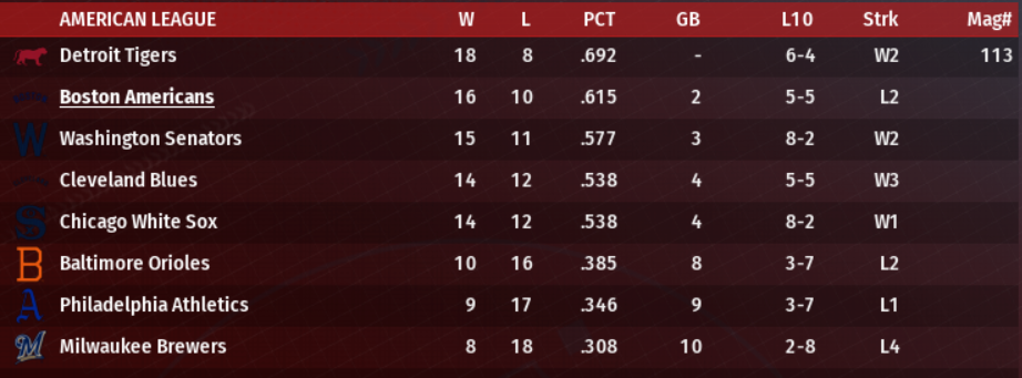 It has been a fun first month leading the Boston Americans. While I am happy with where the team sits right now, I must always be on the lookout for ways to improve things. My pitching staff is firmly anchored by Noodles Hahn and Jesse Tannehill. At the plate, Fred Clarke not only is leading the team he has the top batting average (.439) in MLB.