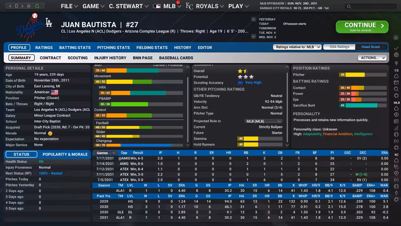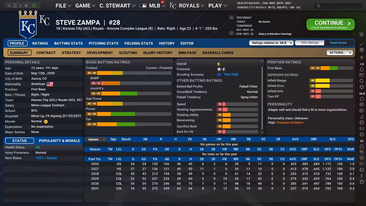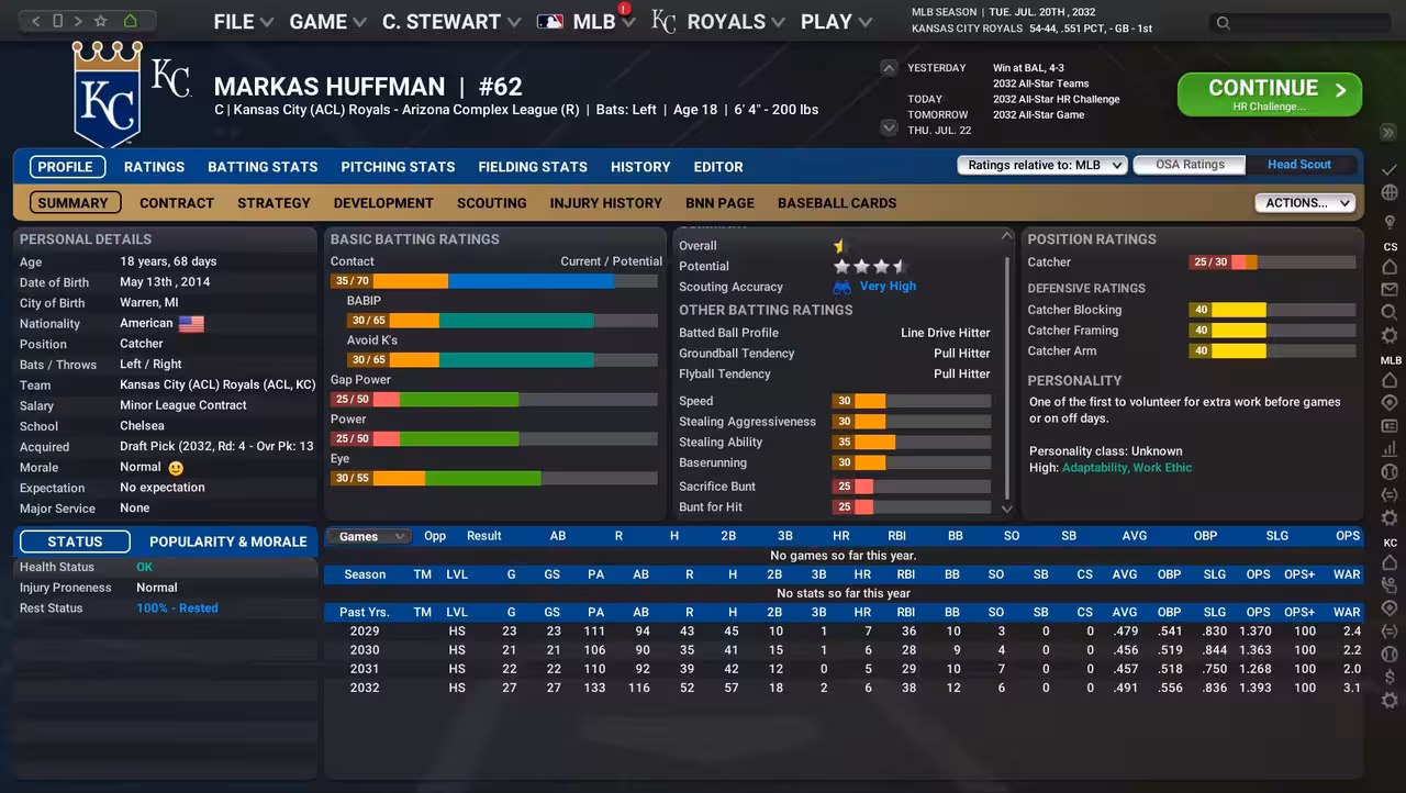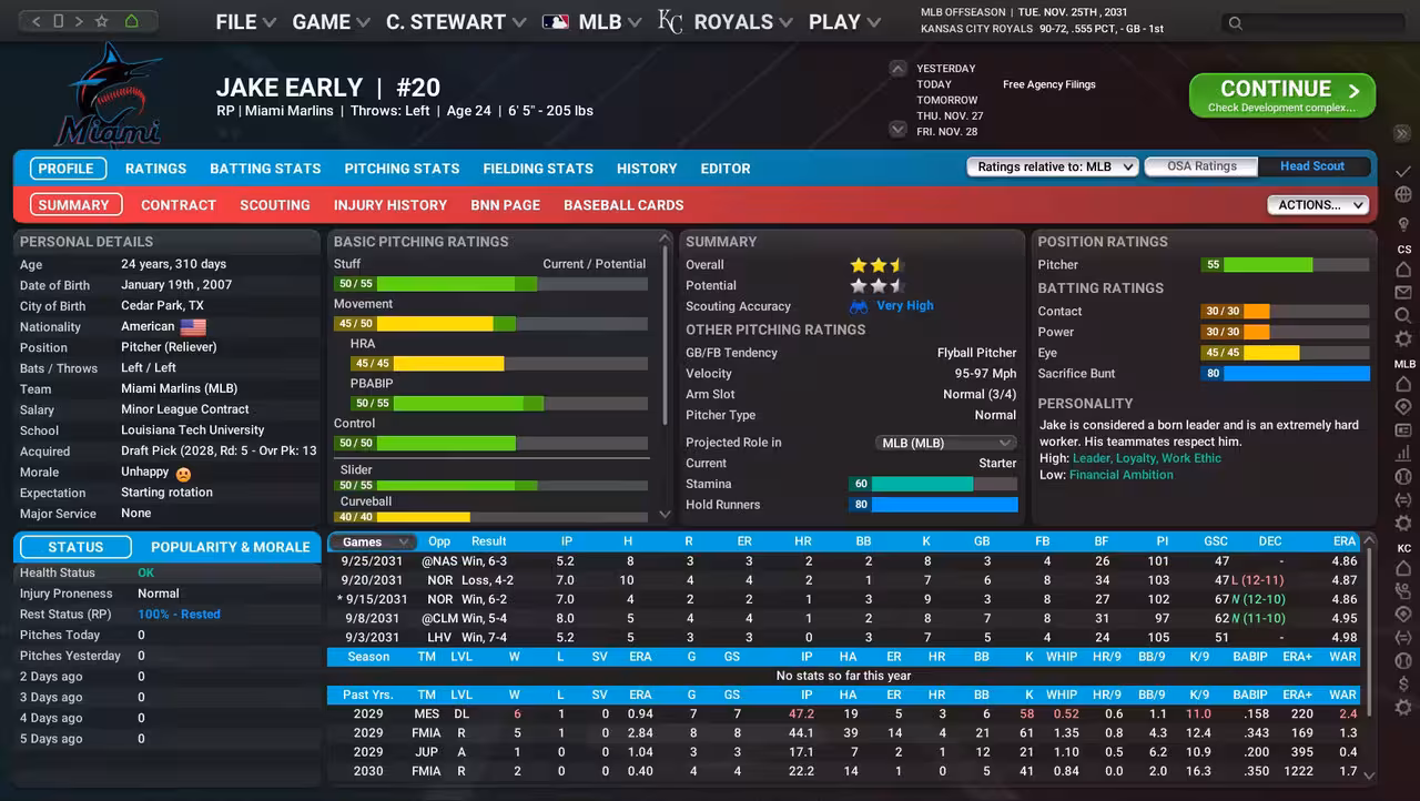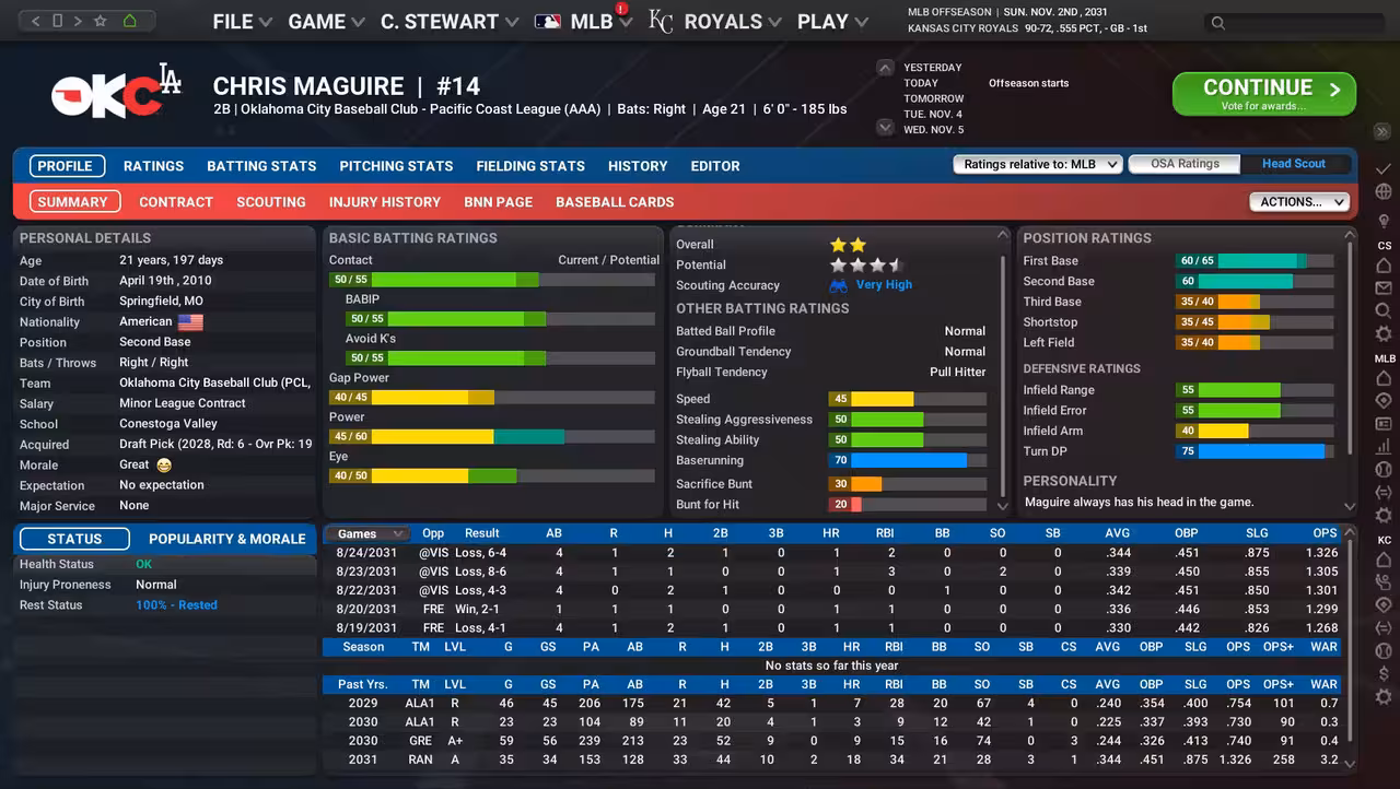 As always, a new offseason came with new goals. Two long-term goals remained for Stewart to work towards, improving fan interest and winning the World Series. Both remain on track for a 2035 deadline. Fresh in 2032, was the challenge to win the Championship in 2034 (a year earlier than the long-term goal), to improve Stolen Bases in 2033 (2032 was an increase from 12th to 11th) and to acquire a Great Glove winner by 2035. None of these challenges are insurmountable although how active the pursuit of stolen bases and Great Glove winners will be remains to be seen. In fact, at the start of 2033, Stewart would speak to Sherman and suggest changing the Stolen Bases goal to an upgrade at Catcher, reflected above. Finances Not for the first time, Royals owner Sherman reflected on a successful year by cutting budgets. Having originally forecast a budget of $212m back in November 2030, the announced budget was only $166m, with player payroll of $55m. This is clearly unviable with Bobby Witt Jr., Jimmy Goodman, and Billy Mumaugh earning $49m between them. The final player budget, therefore, will be higher than $55m but it is clear it will not be a year of spending during Free Agency. This is despite another year of high attendances (21% higher than when Stewart arrived) and fan loyalty that has now increased to Average {insert fan interest link}. Personnel There was only one staffing departure at the end of the season; Rookie Pitching Coach Andy Altemus not receiving an extension to his contact. He was replaced by Jay Rainville who arrived on a one-year contract. Colin Stewart was rewarded for reaching the World Series with another one-year contract, increasing his salary to $1.9m although the lack of stability from single year extensions is a challenge. Minor Leagues Awards Amongst award winners, particular highlights were Dan Jones winning his 5th consecutive Manager of the Year Award at AA while Josh Olaniyan (2026 2nd Round pick) made it back-to-back drafted players winning the Outstanding Pitcher Award at AAA. Rookie (ACL) Mathew Figueroa Manager of the Year Rookie (DSL) Jason Flach Manager of the Year AA Dan Jones Manager of the Year Rookie (DSL) Sa-yoon Kim Outstanding Pitcher Award AA Vince Baron Outstanding Pitcher Award AAA Josh Olaniyan Outstanding Pitcher Award Notable Retirements The 2026 draft class saw 10th round reliever Shea Wendt retire having reached the AA level. The 2027 class (Stewart’s first) had five retirements, including two former minor league Outstanding Pitcher award winners: • 11th Round: AA 2B Manny Marin • 12th Round: R-ACL CF Braylon Payne 2028 ACL Gold Glove CF • 16th Round: A+ RP Billy Turner • 17th Round: AAA RP Jorge Lucino 2030 A+ Outstanding Pitcher Award • 18th Round: AA RP Mike Woods 2029 A Outstanding Pitcher Award The 2028 class lost 10th round pick Haywood Brushett, who never got out of Rookie Ball. 2028 trade acquisition from the Yankees, reliever Nate Brittain also chose to retire from AAA. KC Top 500 Prospects Performance Mike Hoffer was the pick of the prospects, as he graduated to the starting rotation and is primed for a big extension in the offseason. However, it wasn’t isolated success as Eddie Baquerizo, Curt Bogans, and Josh Olaniyan all had strong AAA seasons. On the batting side, Enny Mijhail Van Dyke continues his improvement and will be looking to force his way into the big leagues at Spring Training, while Juan Zubia is ready and almost certain to start on the big-league books in some role. Edgar Mir spent the year in the DSL but looks ready to graduate while Chris Maguire put up 5 WAR in AAA and provides a good riddle for Stewart to solve at 2B. |