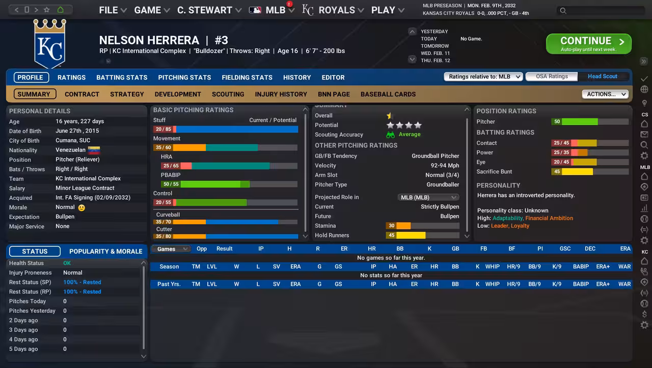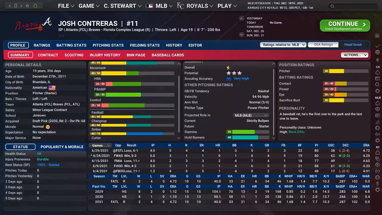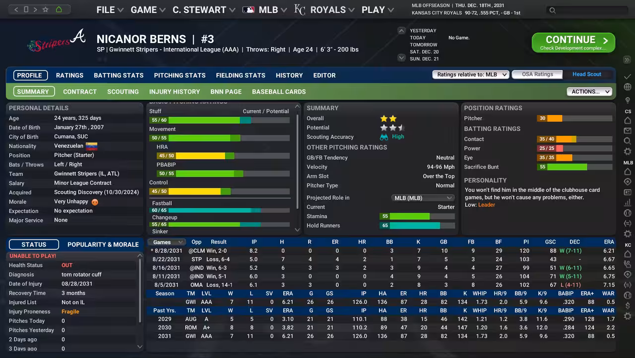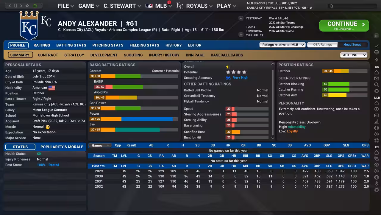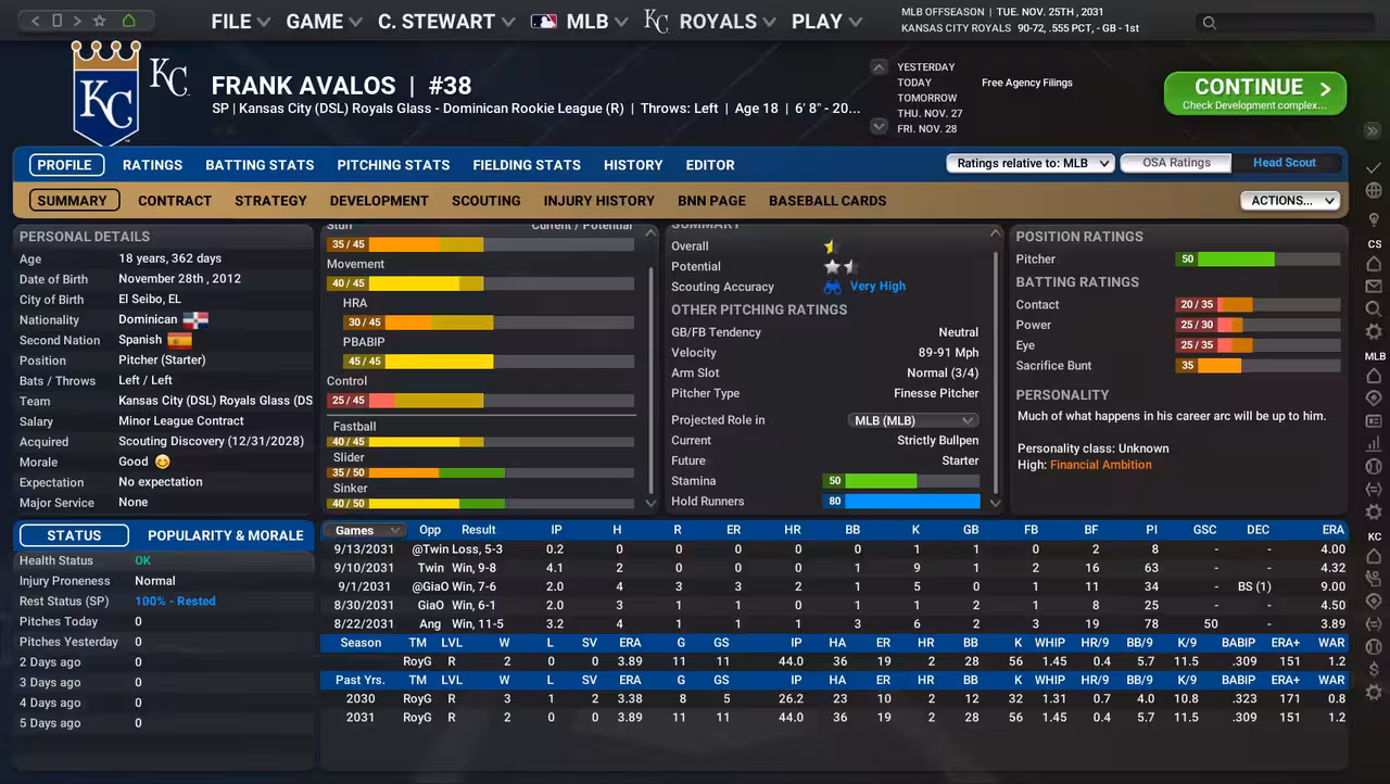 As always, a new offseason came with new goals. Two long-term goals remained for Stewart to work towards, improving fan interest and winning the World Series. Both remain on track for a 2035 deadline. Fresh in 2032, was the challenge to win the Championship in 2034 (a year earlier than the long-term goal), to improve Stolen Bases in 2033 (2032 was an increase from 12th to 11th) and to acquire a Great Glove winner by 2035. None of these challenges are insurmountable although how active the pursuit of stolen bases and Great Glove winners will be remains to be seen. In fact, at the start of 2033, Stewart would speak to Sherman and suggest changing the Stolen Bases goal to an upgrade at Catcher, reflected above. Finances Not for the first time, Royals owner Sherman reflected on a successful year by cutting budgets. Having originally forecast a budget of $212m back in November 2030, the announced budget was only $166m, with player payroll of $55m. This is clearly unviable with Bobby Witt Jr., Jimmy Goodman, and Billy Mumaugh earning $49m between them. The final player budget, therefore, will be higher than $55m but it is clear it will not be a year of spending during Free Agency. This is despite another year of high attendances (21% higher than when Stewart arrived) and fan loyalty that has now increased to Average {insert fan interest link}. Personnel There was only one staffing departure at the end of the season; Rookie Pitching Coach Andy Altemus not receiving an extension to his contact. He was replaced by Jay Rainville who arrived on a one-year contract. Colin Stewart was rewarded for reaching the World Series with another one-year contract, increasing his salary to $1.9m although the lack of stability from single year extensions is a challenge. Minor Leagues Awards Amongst award winners, particular highlights were Dan Jones winning his 5th consecutive Manager of the Year Award at AA while Josh Olaniyan (2026 2nd Round pick) made it back-to-back drafted players winning the Outstanding Pitcher Award at AAA. Rookie (ACL) Mathew Figueroa Manager of the Year Rookie (DSL) Jason Flach Manager of the Year AA Dan Jones Manager of the Year Rookie (DSL) Sa-yoon Kim Outstanding Pitcher Award AA Vince Baron Outstanding Pitcher Award AAA Josh Olaniyan Outstanding Pitcher Award Notable Retirements The 2026 draft class saw 10th round reliever Shea Wendt retire having reached the AA level. The 2027 class (Stewart’s first) had five retirements, including two former minor league Outstanding Pitcher award winners: • 11th Round: AA 2B Manny Marin • 12th Round: R-ACL CF Braylon Payne 2028 ACL Gold Glove CF • 16th Round: A+ RP Billy Turner • 17th Round: AAA RP Jorge Lucino 2030 A+ Outstanding Pitcher Award • 18th Round: AA RP Mike Woods 2029 A Outstanding Pitcher Award The 2028 class lost 10th round pick Haywood Brushett, who never got out of Rookie Ball. 2028 trade acquisition from the Yankees, reliever Nate Brittain also chose to retire from AAA. KC Top 500 Prospects Performance Mike Hoffer was the pick of the prospects, as he graduated to the starting rotation and is primed for a big extension in the offseason. However, it wasn’t isolated success as Eddie Baquerizo, Curt Bogans, and Josh Olaniyan all had strong AAA seasons. On the batting side, Enny Mijhail Van Dyke continues his improvement and will be looking to force his way into the big leagues at Spring Training, while Juan Zubia is ready and almost certain to start on the big-league books in some role. Edgar Mir spent the year in the DSL but looks ready to graduate while Chris Maguire put up 5 WAR in AAA and provides a good riddle for Stewart to solve at 2B. |