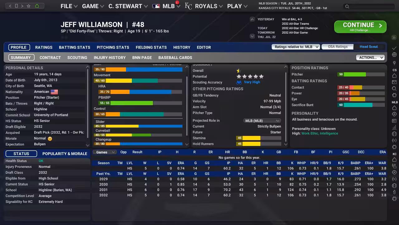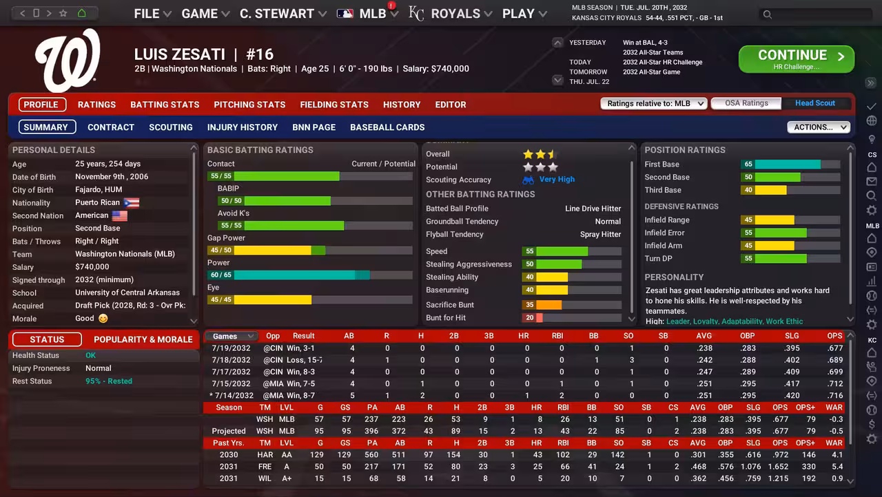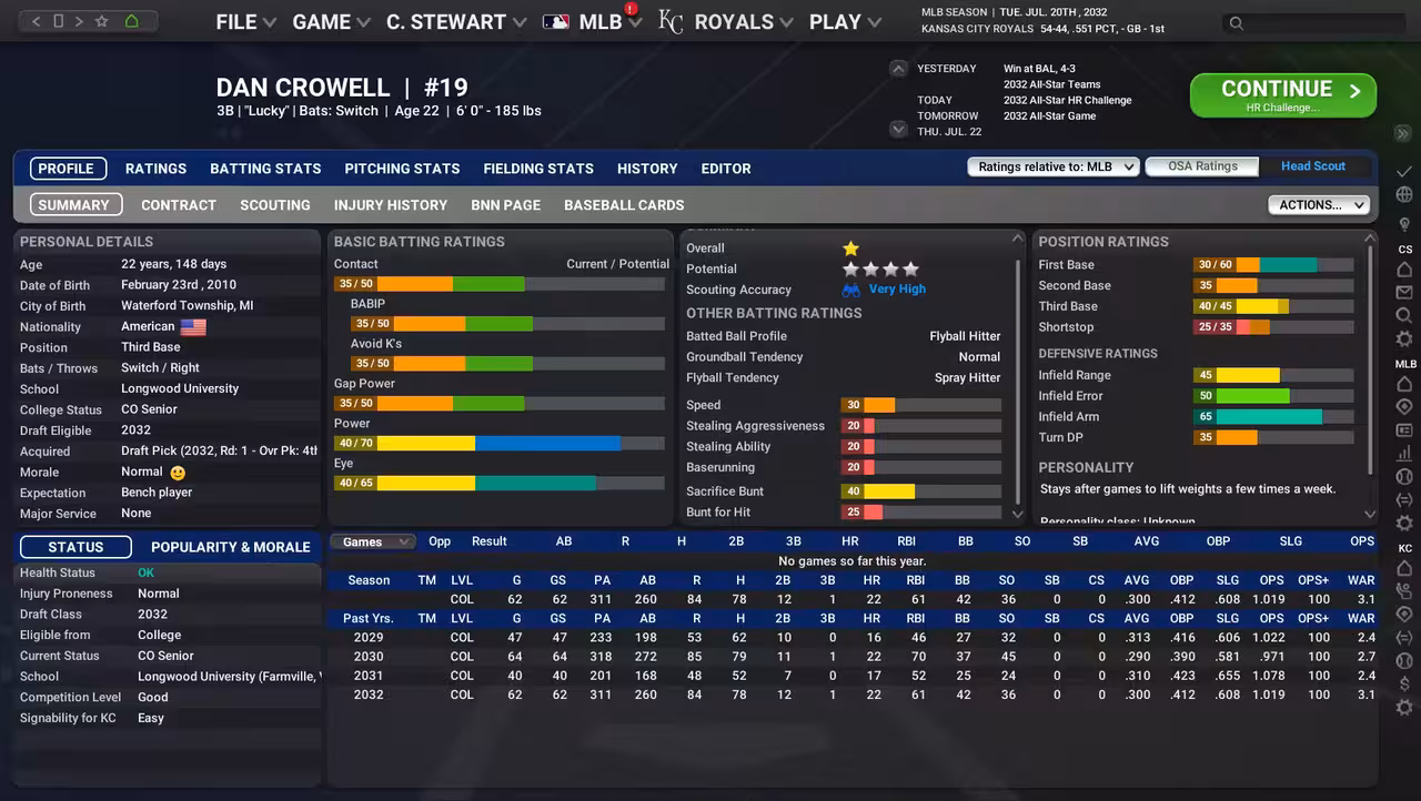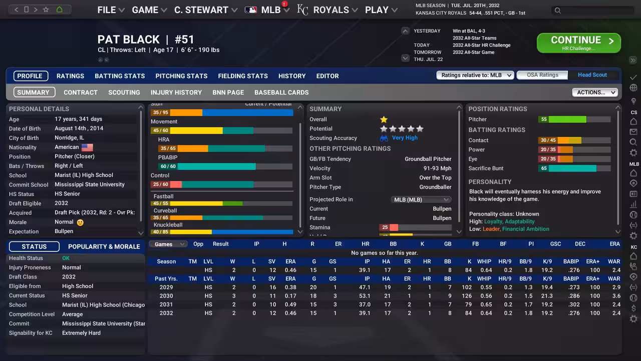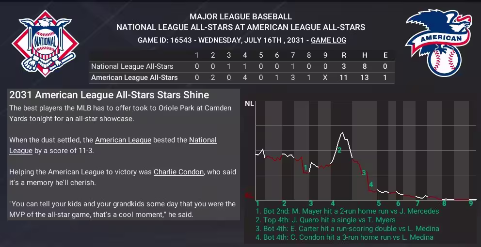 Leading the AL Central puts the Royals in a strong position at the All Star Break but they have some clear areas for improvement. OF Will Gasparino (26 wRC+) has struck out almost 40% of the time and could do with a reset in Omaha although a 40 rating for Avoid K’s puts his long-term viability in question. Likewise, DH Hunter Owen’s (88 wRC+) scouted rating has dropped to a 40 and his strikeout rate is 5% higher than any other season. A power-bat 1B will be something the Royals explore in the run up to the trade deadline. At the other end of the scale, Tim Storer (117 wRC+) has provided elite defence at 2B while hitting 14 HRs and getting on base at a .346 rate. Surprisingly, this wasn’t enough for an All-Star nomination, but the Royals did have two bats selected, outfielders Wyatt Langford (127 wRC+) and Billy Mumaugh (126 wRC+). Langford is having the a contract year, on pace for 4.4 WAR and potentially pricing himself out an extension with the Royals while Mumaugh is justifying his contract extension in his 2nd season in the league. Aiden May (202 ERA+) has been the standout of the starting rotation, earning himself his first All-Star selection behind a 2.89 FIP. Mason Barnett (75 ERA+) has struggled with hits with what is a weaker Royals defence, a profile similar to 2030 giving up an ERA 2 runs (from 2 hits) higher than that year. Injured in his final start before the break, it is tough to see the Royals sticking with him this season, let alone picking up his Team Option for 2033. The bullpen has settled down, anchored by 1st time All Star William Schmidt (135 ERA+) with only fellow stopper, and reigning AL Reliever of the Year, Wen-Hui Pan (83 ERA+) struggling. Pan’s workload over the last two seasons (268 innings over a MLB-season 162 games) may be catching up with him and T.J. Brock will step up to the Closer role for the next month, at least. As always, elite relief arms will be looked at ahead of the deadline. The American League defeated the National League in the All Star Game, Billy Mamaugh going 0-2, but William Schmidt getting the win, pitching a one-hit innings in the 3rd. May and Langford did not appear in the game. League Standings The Yankees (52-44), the White Sox (52-45) and the Blue Jays (52-46) sit in the AL Wild Card spots. It was the Pirates (55-41), the defending World Series Champion Rockies (53-44) and the Giants (52-45) leading the NL Wild Card race. |