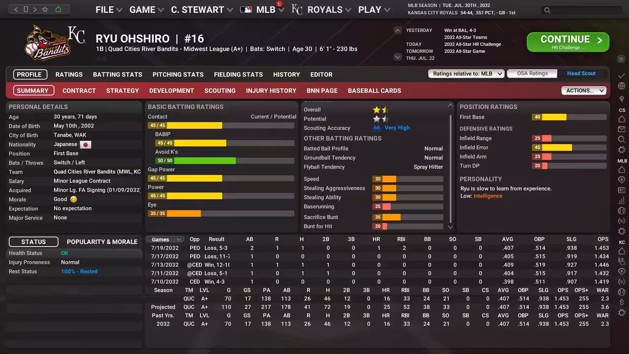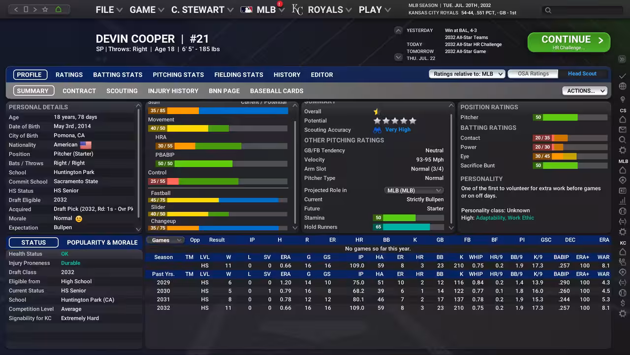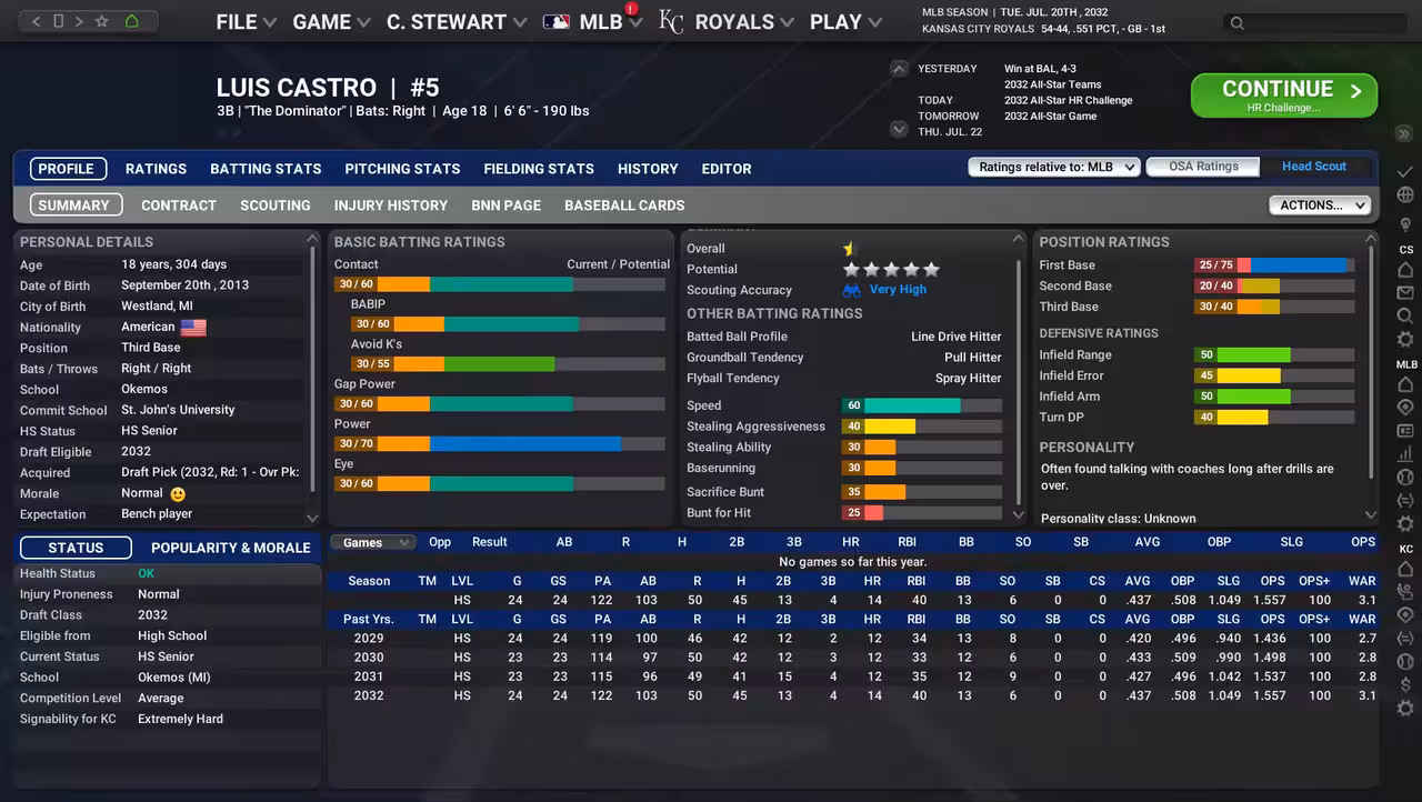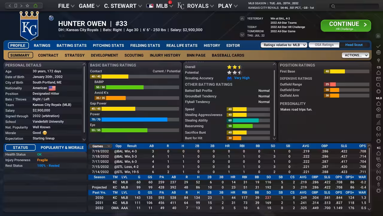 Leading the AL Central puts the Royals in a strong position at the All Star Break but they have some clear areas for improvement. OF Will Gasparino (26 wRC+) has struck out almost 40% of the time and could do with a reset in Omaha although a 40 rating for Avoid K’s puts his long-term viability in question. Likewise, DH Hunter Owen’s (88 wRC+) scouted rating has dropped to a 40 and his strikeout rate is 5% higher than any other season. A power-bat 1B will be something the Royals explore in the run up to the trade deadline. At the other end of the scale, Tim Storer (117 wRC+) has provided elite defence at 2B while hitting 14 HRs and getting on base at a .346 rate. Surprisingly, this wasn’t enough for an All-Star nomination, but the Royals did have two bats selected, outfielders Wyatt Langford (127 wRC+) and Billy Mumaugh (126 wRC+). Langford is having the a contract year, on pace for 4.4 WAR and potentially pricing himself out an extension with the Royals while Mumaugh is justifying his contract extension in his 2nd season in the league. Aiden May (202 ERA+) has been the standout of the starting rotation, earning himself his first All-Star selection behind a 2.89 FIP. Mason Barnett (75 ERA+) has struggled with hits with what is a weaker Royals defence, a profile similar to 2030 giving up an ERA 2 runs (from 2 hits) higher than that year. Injured in his final start before the break, it is tough to see the Royals sticking with him this season, let alone picking up his Team Option for 2033. The bullpen has settled down, anchored by 1st time All Star William Schmidt (135 ERA+) with only fellow stopper, and reigning AL Reliever of the Year, Wen-Hui Pan (83 ERA+) struggling. Pan’s workload over the last two seasons (268 innings over a MLB-season 162 games) may be catching up with him and T.J. Brock will step up to the Closer role for the next month, at least. As always, elite relief arms will be looked at ahead of the deadline. The American League defeated the National League in the All Star Game, Billy Mamaugh going 0-2, but William Schmidt getting the win, pitching a one-hit innings in the 3rd. May and Langford did not appear in the game. League Standings The Yankees (52-44), the White Sox (52-45) and the Blue Jays (52-46) sit in the AL Wild Card spots. It was the Pirates (55-41), the defending World Series Champion Rockies (53-44) and the Giants (52-45) leading the NL Wild Card race. |