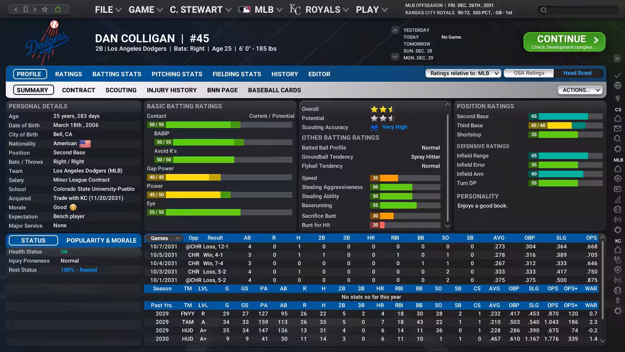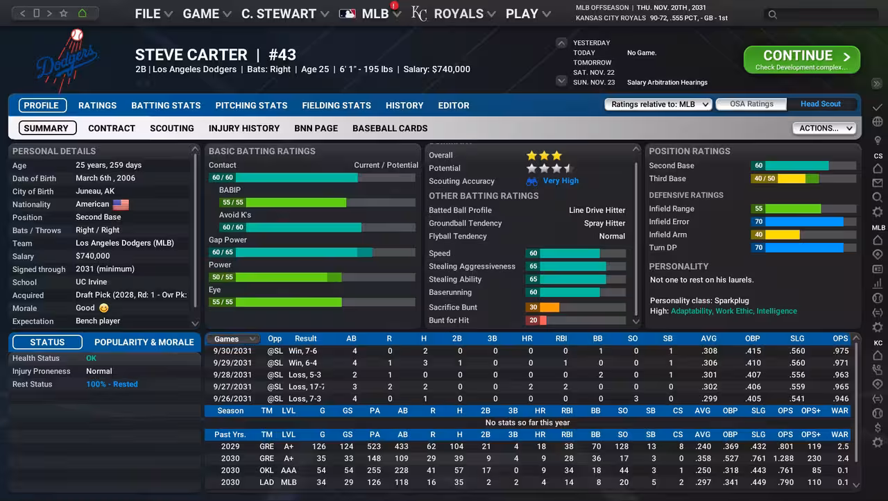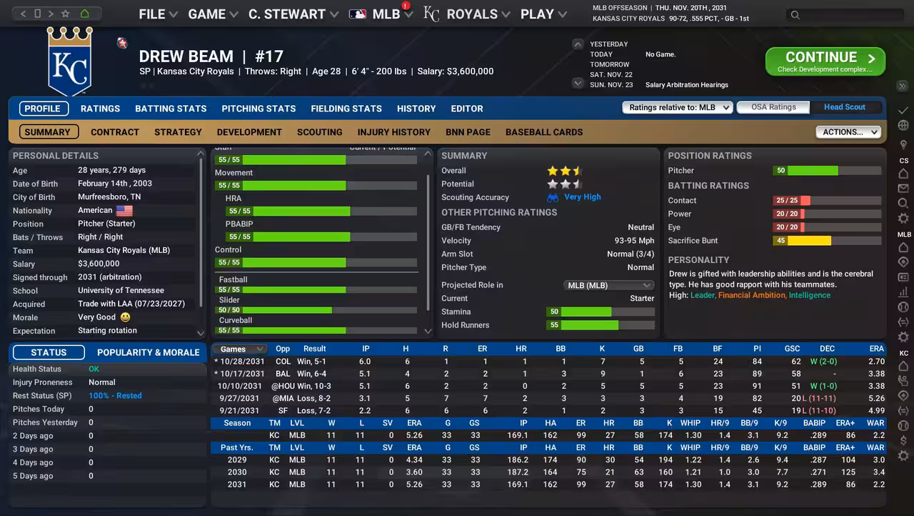Drew Beam was coming into the second year of arbitration and with several high upside pitchers at the top of the system, the Royals decided to move on from his $5m estimated arbitration 2032 contract. Stewart went back to the Dodgers for another high-prospect infielder, 2028 1st Round pick Steve Carter (a plus 2B defender with plus contact and gap power to go with above average power and eye) in exchange for Beam, 2031 trade acquisition Dan Colligan and MiL Free Agent organisational piece Steve Zampa into the deal. Tuesday, November 25th , 2031