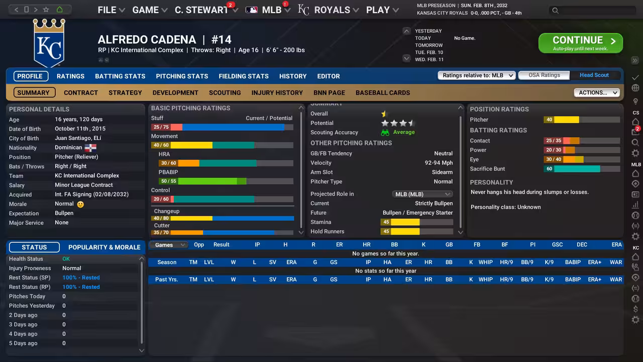 Dominic Fletcher also returns on a $2m contract. The Royals will hope for some development success on their prospect outfielders, but Fletcher provides a fallback option having provided elite defence in 2031. Departures Isaac Paredes used his HR-laden 2031 to sign a 4-year contract with the Angels. Fully guaranteed, the contract is worth $66.3m, far more than the Royals were willing to spend. The fans reacted poorly, dropping fan interest back down to 78. However, the Royals will take a Supplemental 1st Round pick in the 2032 draft. Financial Situation Owner Sherman made no changes to the budget in January. However, there was one additional personnel change with Rookie Pitching Coach Joe Testa leaving the organisation. Andy Altemus joins on a one-year contract as the best of some average options. Preseason & Spring Training The Royals have their best spring of the Stewart era, going 18-9 to lead the AL Central. They did suffer several injuries though, some more impactful than others: Friday, February 20th , 2032