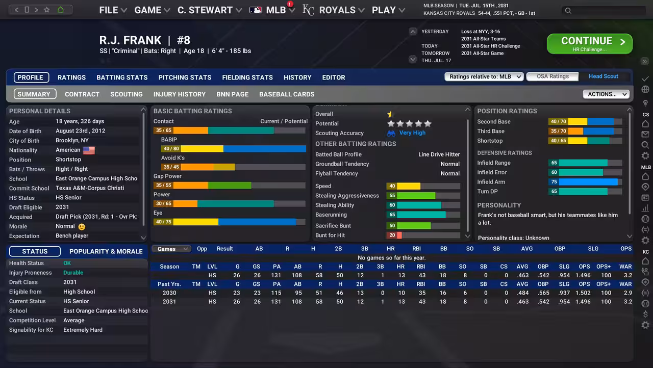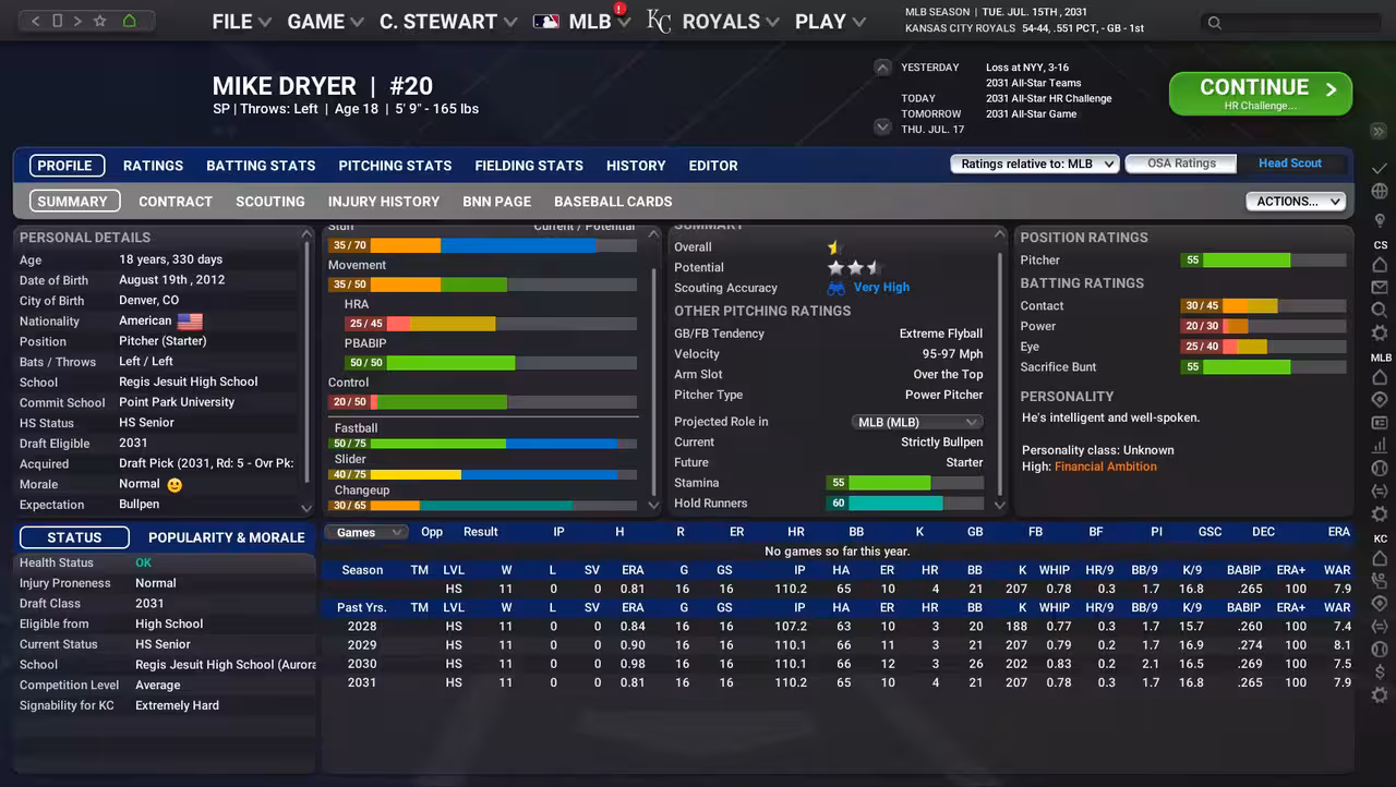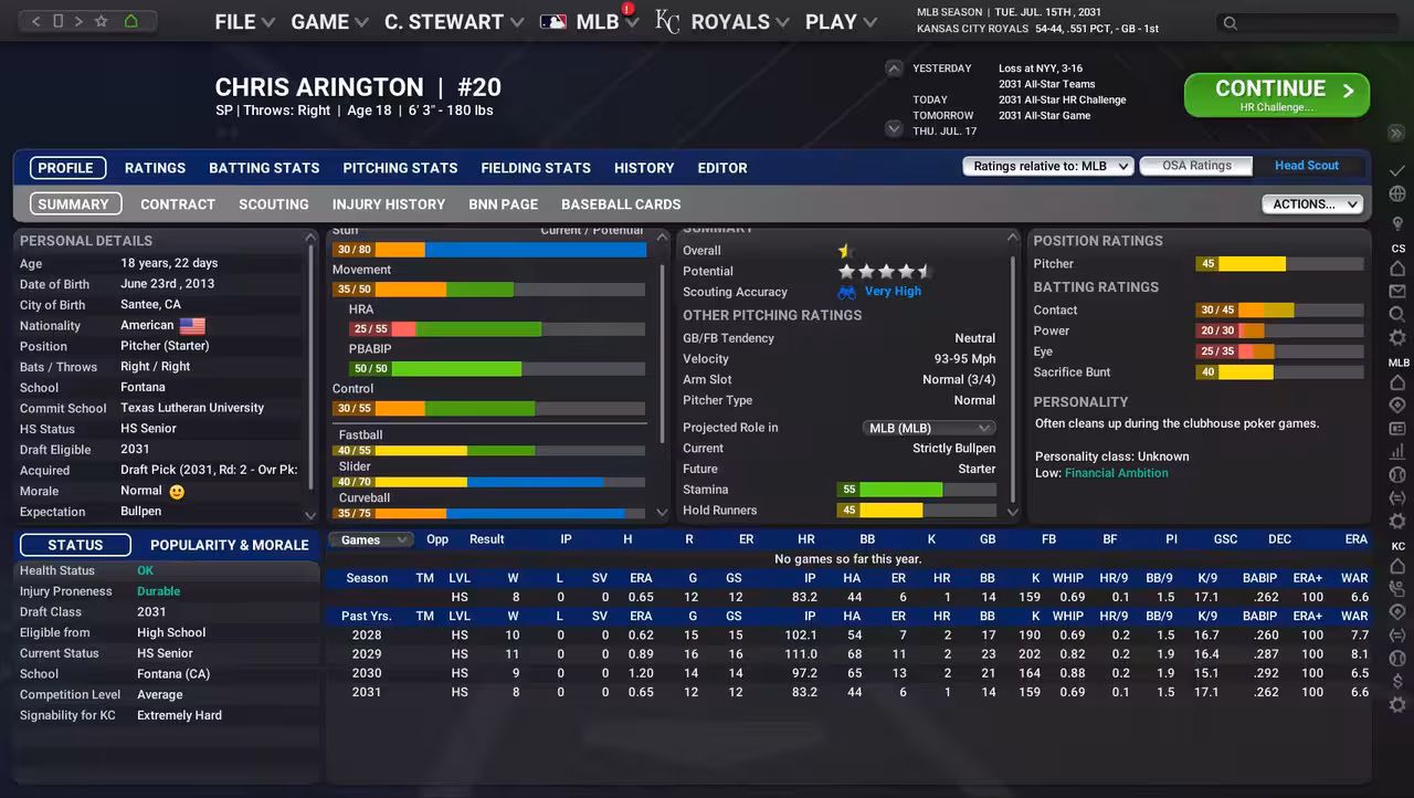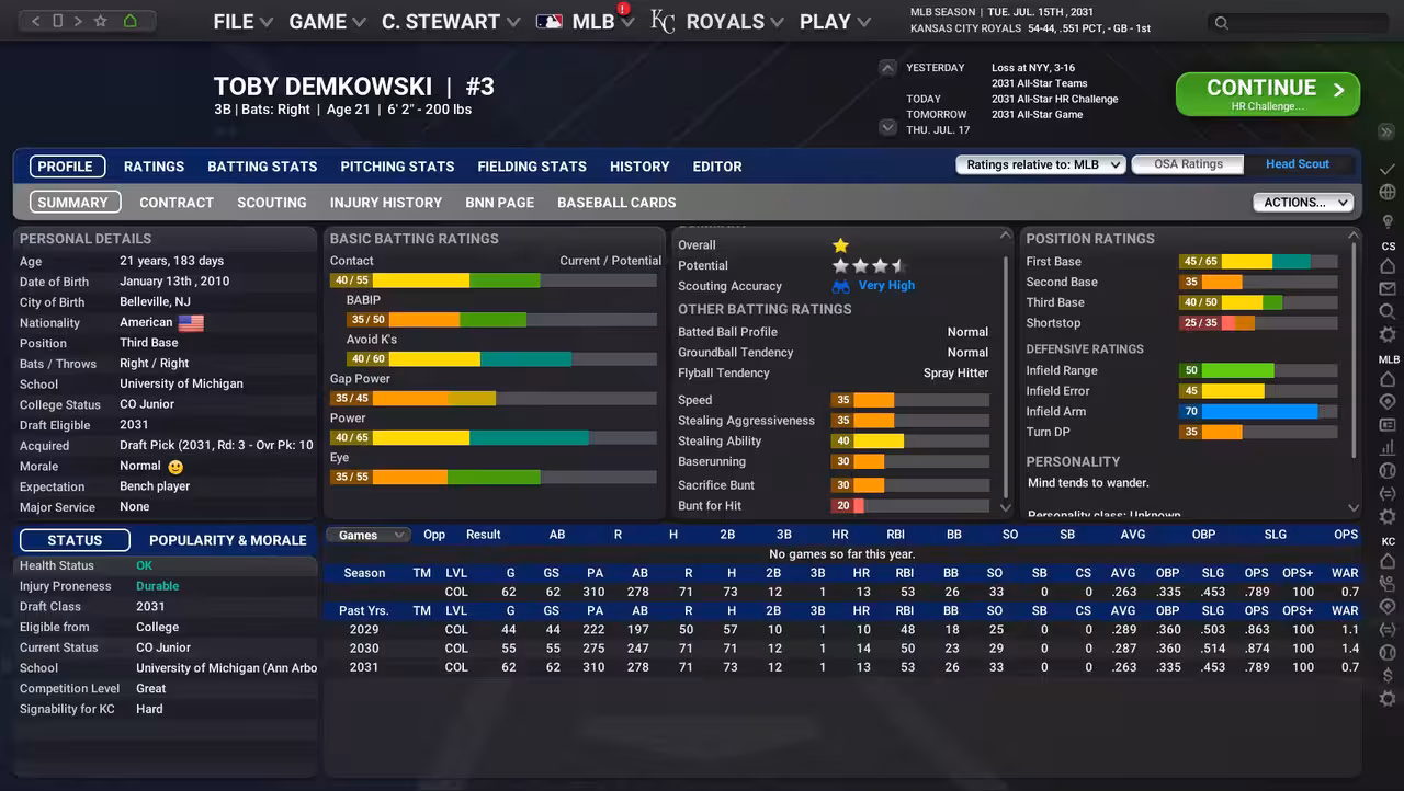 This mixed performance was highlighted when All Star selections came around, the Royals halving their representation. Wen-Hui Pan (1 IP, 1H, 0R) was selected for his first All Star appearance, while Bobby Witt Jr. (0-1, 1E) made his 4th as the American League dispatched the National League 11-3. Once again, the Royals have had an up and down season, winning months followed by .500 months so far. The bats have been quite ‘Royal’ with a strong ability to hit offsetting the failure to hit many balls out of the park. Third in hits, and 5th in average and OBP, hasn’t translated into runs yet, the team sitting 9th in the AL in runs scored with only 104 HRs hit so far this season. The bullpen continues to be one of the best in the business with the 3rd best ERA in the AL although the starters have slipped back in 2031, down to 9th with a 4.51 ERA. The defence remains elite in Zone Rating, and the team has already struck out over 1000 batters (1010, 1st). Letting opponents walk (11th) and giving up HRs (10th) has been a problem they will hope to address over the final third of the season. Jonathan Gerew’s (92 wRC+) bat hasn’t quite matched his 2030 to date but he is close enough to league average that his plus catching is more than acceptable. Dave Holcombe (86 wRC+) has struggled a little more but a walk rate of over 10% helps to keep innings alive. Luke Adams (68 wRC+) has been the loser from Jeremy Rogerson’s (98 wRC+) emergence at 3B as it has seen Isaac Paredes (128 wRC+) moved to 1B, where his bat has been strong even if his glove is a big downgrade on Adams. Nick Loftin (-60 wRC+) was hurt in the 7th game of the season, and won’t be back until late September. Gregory Barrios (92 wRC+) has been the everyday replacement and has shown some improvement on previous years. Surprisingly he has not been strong defensively, and neither has Kiyotake Takenake (59 wRC+), who was called up after his strong Spring but has really struggled and this, his age 30 season, may be his only time in the Big Leagues. Rogerson has only been league average but is a strong defender and the Royals have trust in his bat to come through in time. Bobby Witt Jr. (116 wRC+) started the season slowly but a .387 OPB in June has him back on track and rewarded with his 4th All Star appearance. Hunter Owen (119 wRC+) leads the Royals with 25 HRs from the DH position, slugging at a .510 rate. The Royals centerfield moves over the offseason backfired as, after Sheng-En Lin (68 wRC+) got hurt prior to the season, Cristhian Vaquero (58 wRC+) got hurt in the first game of the season and missed 7 weeks. MiL FA signing Dominic Fletcher (59 wRC+) was called up and, while his bat has been cold, his 7.3 ZR demonstrates his worth to the team. Wyatt Langford (87 wRC+) has not been the bat needed by the Royals and his $10m contract for 2032 is not looking attractive for the Royals at this point and could see movement ahead of the trade deadline. Jimmy Goodman (162 wRC+) has missed time and that probably cost him an All-Star nomination as he approaches 200 PA for the season with a .335/.444/.525 line. Will Gasparino (218 wRC+) has been excellent in minimal PA, while Matthew Etzel (100 wRC+) just keeps coming back for more and this time has been league average. Mason Barnett (122 ERA+) has been solid again over his first 20 starts, striking out 25% of batters he faces with a 1.11 WHIP. In his contract year, he is probably pricing himself out of a Royals extension. Cade Townsend (107 ERA+) has been even more dominant when it comes to strikeouts (31%), while leading the innings count (115.2) for the Royals. Drew Beam (102 ERA+) is part of 25% strikeout club with a FIP under 4 at 3.89 while Aidan May (90 ERA+) was league average as a 5th starter before getting injured just before the All-Star Break. Marcos Paz (103 ERA+ in relief) will take his place to start the second half of the season. The big question is what to do with Chase Burns. His return from injury has not gone well; while he has come back with strong strikeout number (10.1 K/9), he is walking over 10% of batters with a HR rate of 2.4/9 which is unsustainable. The Royals will be buyers when it comes to the Starting Rotation approaching the Trade Deadline. The bullpen continues to be a strength for the Royals, although this year has been a tale of feast and famine. The feast comes from Yusuke Matsumura (327 ERA+), David Hagaman (197 ERA+), Isaac Morton (168 ERA+), and All-Star Wen-Hui Pan (144 ERA+). Frank Mozzicato (121 ERA+) was also good before missing three weeks. The famine comes from Raimon Gomez (89 ERA+) and MacKenzie Gore (71 ERA+) while Humberto Trujillo has just been called up but had a tough first outing! Extra arm Sheng-En Lin (96 ERA+) has been league average, giving useful innings when needed. Trades The Royals didn’t make any trades at the All-Star Break but did make some internal changes to try to keep momentum going as they enter the final stretch of the season. 2029 1st Round pick Billy Mumaugh (1.326 OPS AAA) had to come up as he had destroyed AAA hitting. Gasparino was somewhat unlucky to be the man to be sent down but could return if the right deal can be found for Langford. Mumaugh’s performances since joining the Royals have been sensational and the Royals took the risk and signed him to a long-term contract (11 years, $167m, $20m max.) as they called him up to the Majors. 2028 1st Round pick Tim Storer (114 OPS+) was also summoned from AAA; while he hasn’t had quite the hot bat of Mumaugh he offers elite defence and replaced Kiyotake Takenaka. Both players become the first from their respective Royals draft classes to be called up by the Royals. The final move ahead of the restart was MacKenzie Gore being sent placed on waivers and Colin White (2026 7th Round) was promoted from AAA. White had been lost in the Rule 5 Draft but SF released him at the beginning of June. Injuries Friday, March 28th , 2031 CF Cristhian Vaquero was injured whil