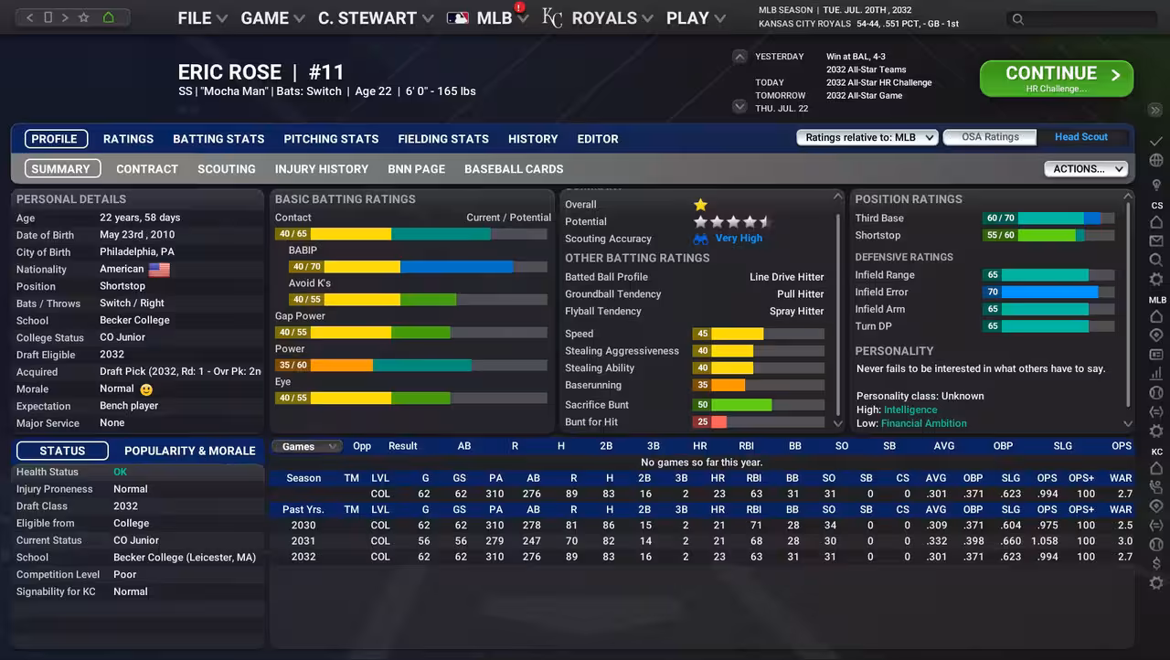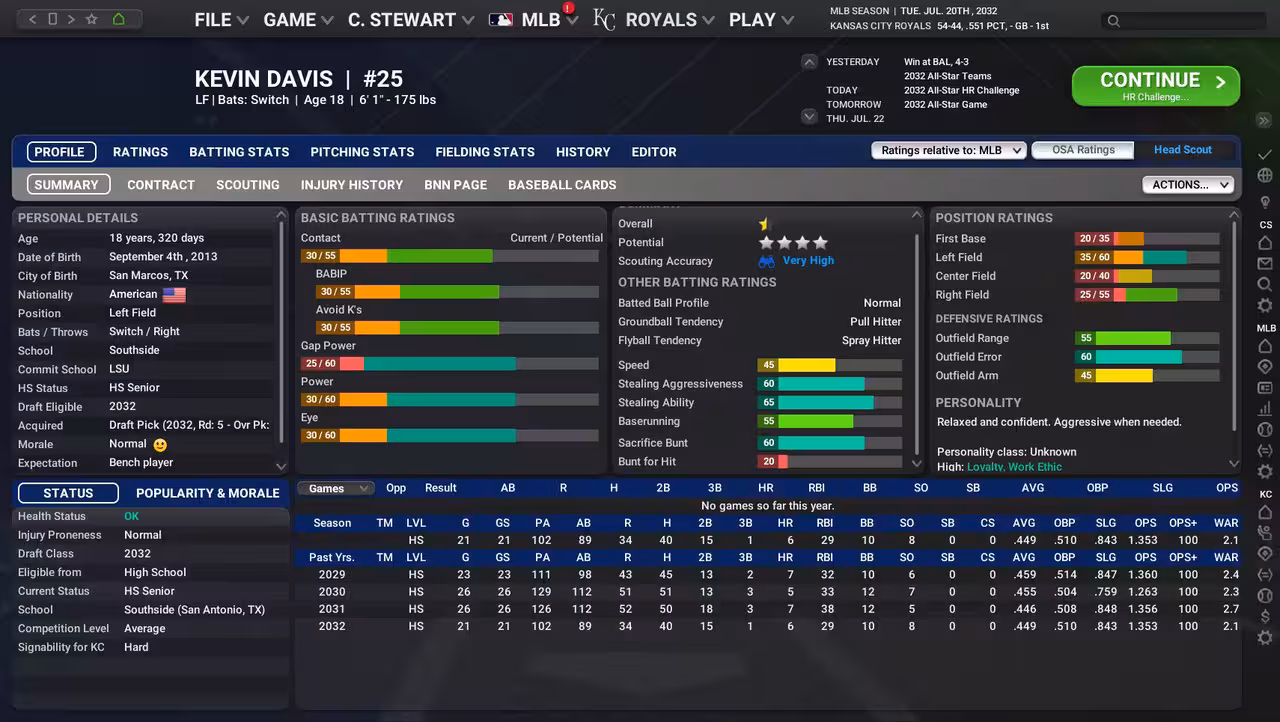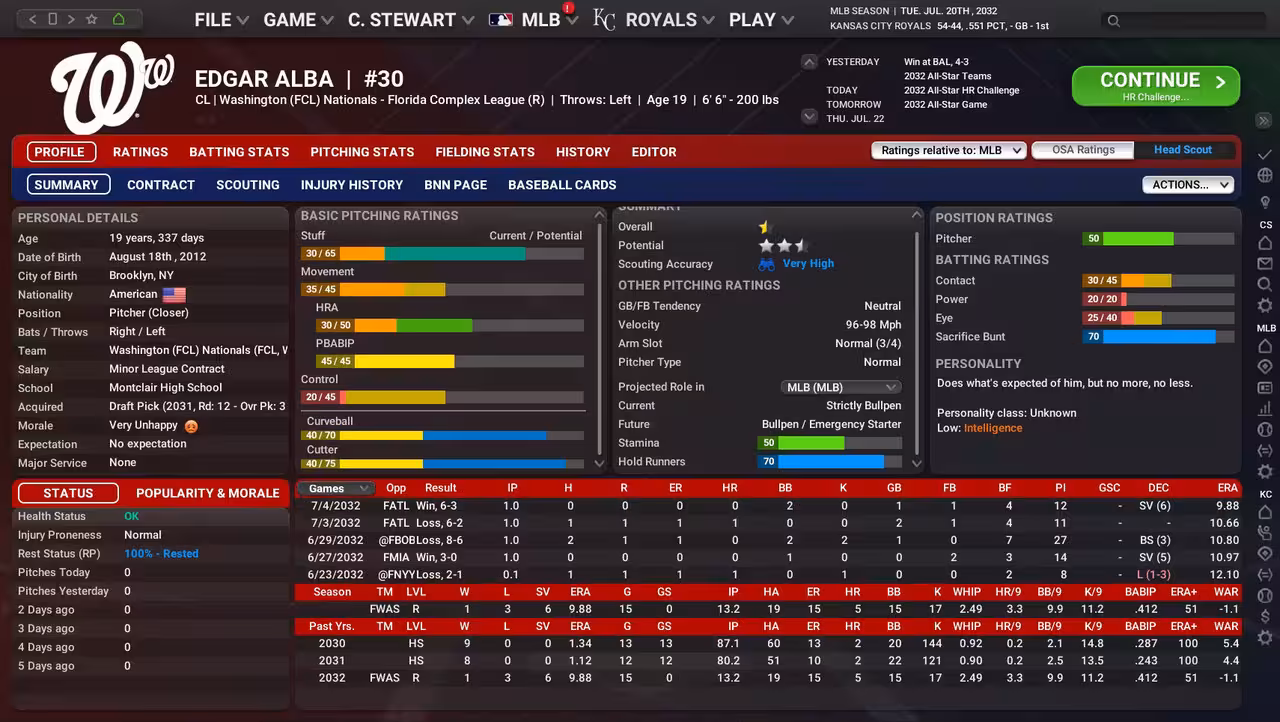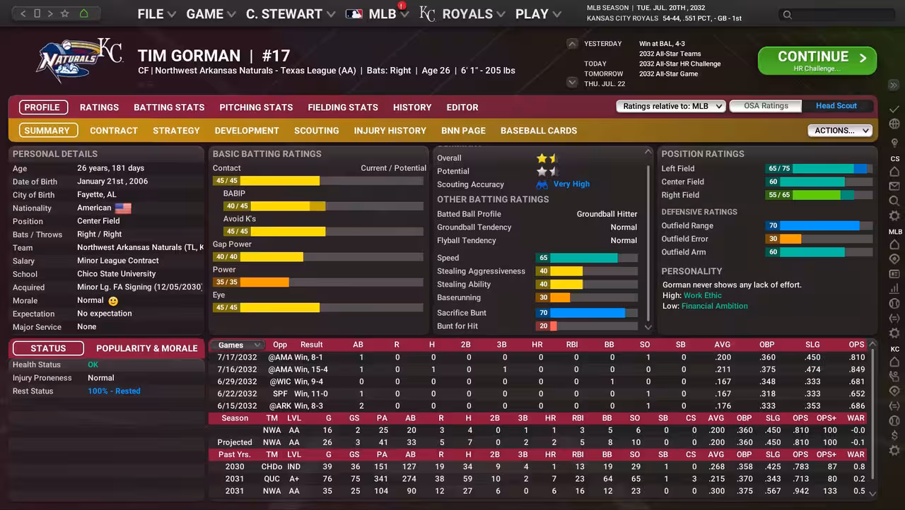 This mixed performance was highlighted when All Star selections came around, the Royals halving their representation. Wen-Hui Pan (1 IP, 1H, 0R) was selected for his first All Star appearance, while Bobby Witt Jr. (0-1, 1E) made his 4th as the American League dispatched the National League 11-3. Once again, the Royals have had an up and down season, winning months followed by .500 months so far. The bats have been quite ‘Royal’ with a strong ability to hit offsetting the failure to hit many balls out of the park. Third in hits, and 5th in average and OBP, hasn’t translated into runs yet, the team sitting 9th in the AL in runs scored with only 104 HRs hit so far this season. The bullpen continues to be one of the best in the business with the 3rd best ERA in the AL although the starters have slipped back in 2031, down to 9th with a 4.51 ERA. The defence remains elite in Zone Rating, and the team has already struck out over 1000 batters (1010, 1st). Letting opponents walk (11th) and giving up HRs (10th) has been a problem they will hope to address over the final third of the season. Jonathan Gerew’s (92 wRC+) bat hasn’t quite matched his 2030 to date but he is close enough to league average that his plus catching is more than acceptable. Dave Holcombe (86 wRC+) has struggled a little more but a walk rate of over 10% helps to keep innings alive. Luke Adams (68 wRC+) has been the loser from Jeremy Rogerson’s (98 wRC+) emergence at 3B as it has seen Isaac Paredes (128 wRC+) moved to 1B, where his bat has been strong even if his glove is a big downgrade on Adams. Nick Loftin (-60 wRC+) was hurt in the 7th game of the season, and won’t be back until late September. Gregory Barrios (92 wRC+) has been the everyday replacement and has shown some improvement on previous years. Surprisingly he has not been strong defensively, and neither has Kiyotake Takenake (59 wRC+), who was called up after his strong Spring but has really struggled and this, his age 30 season, may be his only time in the Big Leagues. Rogerson has only been league average but is a strong defender and the Royals have trust in his bat to come through in time. Bobby Witt Jr. (116 wRC+) started the season slowly but a .387 OPB in June has him back on track and rewarded with his 4th All Star appearance. Hunter Owen (119 wRC+) leads the Royals with 25 HRs from the DH position, slugging at a .510 rate. The Royals centerfield moves over the offseason backfired as, after Sheng-En Lin (68 wRC+) got hurt prior to the season, Cristhian Vaquero (58 wRC+) got hurt in the first game of the season and missed 7 weeks. MiL FA signing Dominic Fletcher (59 wRC+) was called up and, while his bat has been cold, his 7.3 ZR demonstrates his worth to the team. Wyatt Langford (87 wRC+) has not been the bat needed by the Royals and his $10m contract for 2032 is not looking attractive for the Royals at this point and could see movement ahead of the trade deadline. Jimmy Goodman (162 wRC+) has missed time and that probably cost him an All-Star nomination as he approaches 200 PA for the season with a .335/.444/.525 line. Will Gasparino (218 wRC+) has been excellent in minimal PA, while Matthew Etzel (100 wRC+) just keeps coming back for more and this time has been league average. Mason Barnett (122 ERA+) has been solid again over his first 20 starts, striking out 25% of batters he faces with a 1.11 WHIP. In his contract year, he is probably pricing himself out of a Royals extension. Cade Townsend (107 ERA+) has been even more dominant when it comes to strikeouts (31%), while leading the innings count (115.2) for the Royals. Drew Beam (102 ERA+) is part of 25% strikeout club with a FIP under 4 at 3.89 while Aidan May (90 ERA+) was league average as a 5th starter before getting injured just before the All-Star Break. Marcos Paz (103 ERA+ in relief) will take his place to start the second half of the season. The big question is what to do with Chase Burns. His return from injury has not gone well; while he has come back with strong strikeout number (10.1 K/9), he is walking over 10% of batters with a HR rate of 2.4/9 which is unsustainable. The Royals will be buyers when it comes to the Starting Rotation approaching the Trade Deadline. The bullpen continues to be a strength for the Royals, although this year has been a tale of feast and famine. The feast comes from Yusuke Matsumura (327 ERA+), David Hagaman (197 ERA+), Isaac Morton (168 ERA+), and All-Star Wen-Hui Pan (144 ERA+). Frank Mozzicato (121 ERA+) was also good before missing three weeks. The famine comes from Raimon Gomez (89 ERA+) and MacKenzie Gore (71 ERA+) while Humberto Trujillo has just been called up but had a tough first outing! Extra arm Sheng-En Lin (96 ERA+) has been league average, giving useful innings when needed. Trades The Royals didn’t make any trades at the All-Star Break but did make some internal changes to try to keep momentum going as they enter the final stretch of the season. 2029 1st Round pick Billy Mumaugh (1.326 OPS AAA) had to come up as he had destroyed AAA hitting. Gasparino was somewhat unlucky to be the man to be sent down but could return if the right deal can be found for Langford. Mumaugh’s performances since joining the Royals have been sensational and the Royals took the risk and signed him to a long-term contract (11 years, $167m, $20m max.) as they called him up to the Majors. 2028 1st Round pick Tim Storer (114 OPS+) was also summoned from AAA; while he hasn’t had quite the hot bat of Mumaugh he offers elite defence and replaced Kiyotake Takenaka. Both players become the first from their respective Royals draft classes to be called up by the Royals. The final move ahead of the restart was MacKenzie Gore being sent placed on waivers and Colin White (2026 7th Round) was promoted from AAA. White had been lost in the Rule 5 Draft but SF released him at the beginning of June. Injuries Friday, March 28th , 2031 CF Cristhian Vaquero was injured whil