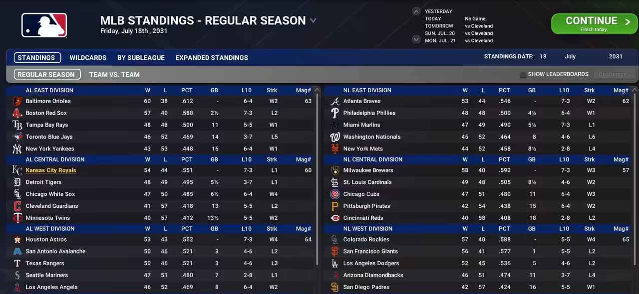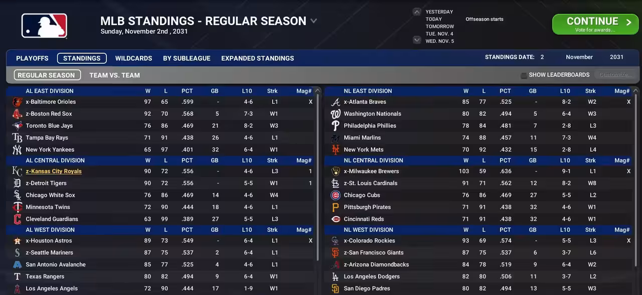 The Royals fall into the NL Central title, securing back-to-back pennants for the first time since 1984, 1985. They finish 90-72, one game up on the Astros to secure a bye into ALDS. Trades Wednesday, July 23rd, 2031