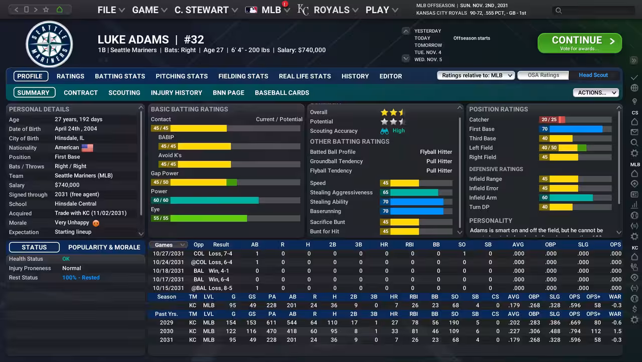 The priority of the Development Lab this offseason was to try to lower the fragility of a large number of the higher rated prospects in the Royals system. Having one development lab for the whole organisation is beginning to feel a little challenging and so from next season, offseason spots will be increased to 12 – with 4 open to 40-man players, 4 open to players in A-ball, and 4 open to Rookie ball. First Round Tim Storer Generate Batspeed No Improvement Sheng-En Lin Strength and Conditioning Improvement Fragile to Somewhat Fragile Dave Holcombe Strength and Conditioning No Improvement Marcos Paz Strength and Conditioning No Improvement William Schmidt Strength and Conditioning No Improvement Mike Hoffer Improve Control No Improvement Second Round Jimmy Goodman RF Successful Outfield: Range <5; Error <5; Arm <5 Billy Mumaugh LF Outstanding Outfield: Range <5; Error 5; Arm <5 Luis Gotay CF No Improvement Sheng-En Lin CF No Improvement Edgar Mir 2B No Improvement Marquis Foggie SS No Improvement Awards It was a successful Awards season for the Royals, with four players honoured by the league. Alongside manager Stewart winning the AL Manager of the Year, outfielders Wyatt Langford and Jimmy Goodman won a Great Glove and Platinum Stick respectively. It was two in a row for Royals relievers as Wen-Hui Pan took home the Reliever of the Year Award in the AL. In addition, Jeremy Rogerson (Rookie of the Year) and Isaac Paredes (Most Valuable Player) received votes in their respective awards. AL Great Gloves LF Wyatt Langford KC NL Great Gloves AL Platinum Sticks RF Jimmy Goodman KC NL Platinum Sticks AL Manager of the Year Colin Stewart KC NL Manager of the Year Charles Kulle COL AL Reliever of the Year Wen-Hui Pan KC NL Reliever of the Year Chad Sparkman SD AL Rookie of the Year Kevin Bales NYY NL Rookie of the Year Jesus Veliz MIL AL Cy Young Connor Phillips SEA NL Cy Young Ricky Tiedemann LAD AL MVP Coby Mayo BAL NL MVP Steve Melendy PHI Pre-Arbitration Extensions & Trades The first day of the offseason brought some huge news for Royals fans. [However, in the OOTP world this simply meant that he opted out of the original contract and so now has a four year contract paying $33m in 2032 and 2033, and then $28m in 2034 and 2035. The Royals would have taken a run at re-signing Witt Jr. and, with the budget slashed by owner Sherman, the we will take this as a successful resigning, albeit on a hugely team friendly deal.] Sunday, November 2nd , 2031