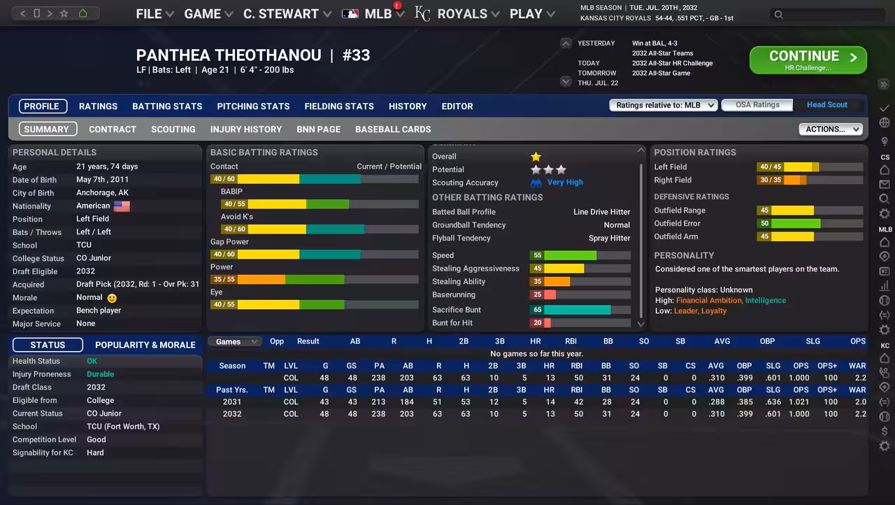 International Amateur signings Juan Zubia and Edgar Mir highlighted a strong batting performance from Royals prospects, with Zubia earning a move to AAA for the rest of the season. He is joined in promotion to AAA by Chris Maguire, Ian Gordon and Enny Van Dyke, creating something of a logjam at that level. Further down 2031 3rd round pick Toby Demkowski moved up from A to High-A after batting over 1.000 with the Fireflies. The pitching side is highlighted by the full AAA starting rotation pushing for promotion to the Big Leagues. Mike Hoffer won June AAA Pitcher of the Month to lead the charge and will be waiting patiently to hear the news on Mason Barnett’s injury. Further down, 2030 3rd round Jb Jointer won the ACL Pitcher of the Month and may soon be ready for the move to A ball. 2032 Draft The Royals ascent to be an annual competing team has made finding quality college players a harder challenge in the draft. As a result, for the second year Kansas City prioritised potential with High School picks making up most of their draft class. With the 31st pick, the selected 21-year-old TCU outfielder Panthea Theothanou. A weak defender, Panthea has potential to display plus contact and gap power, with above average power and eye. He will start in A ball, which will challenge him. The rest of the Royals picks in the first 5 rounds were: