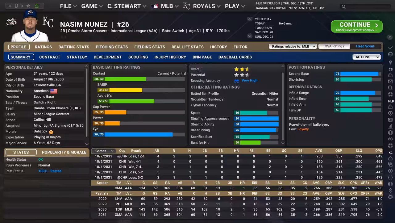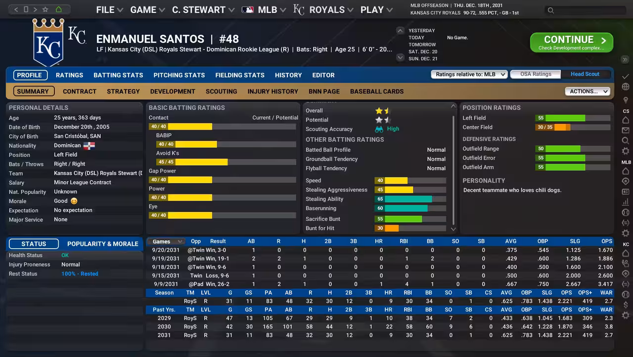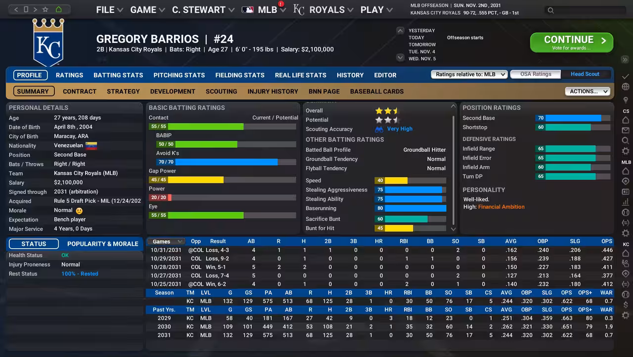 The team’s success was built on a much-improved batting line up to complement a typically strong pitching performance. A Top-5 offence in terms of hits, strikeouts, and batting average is not a new experience in recent times but adding in a Top-6 slugging percentage and extra-base hits made all th difference. On the pitching side, the bullpen was typically strong (top 3 AL) although the starting rotation faded in the second half of the season (4.49 ERA – 9th). Leading the league in strikeouts is now an annual rite and keeping opponents hits (1st) and average (1st) to a minimum showed the dominance of the performance. The defence stood up too, finishing 2nd in both defensive efficiency and zone rating. Catchers The class of 2027 Catching tandem of Jonathan Gerew and Dave Holcombe combined to offer strong defence with Gerew offering a league average bat (7th best Catcher with FRM >0). Holcombe struggled with the bat, and will need to show more in 2032. Infield Isaac Paredes (128 wRC+) moved to everyday 1B in 2031, despite his lack of height being a risk (definitely an OOTP 1B only). A 2.1 ZR with the 6th best wRC+ amongst first basemen make this a very successful move. His 35 HRs (8th) and 119 RBIs (5th) were both Top Ten Royal seasons. A Free Agent, the 32-year-old is looking for $19m for four years, so will likely be signing a lucrative off season contract elsewhere. Luke Adams (59 wRC+) was the loser in the infield merry-go-round and he struggled in the 200 PA he made during the season. A tough decision might be needed with him eligible for the second year of arbitration. Nick Loftin missed virtually the whole season with his knee giving Gregory Barrios (73 wRC+) the chance at a full season at 2B. He failed to take advantage with a below average bat to go with a pedestrian 1.2 ZR. Entering his second year of arbitration, he is definitely on the block this offseason. Kiyotake Takenaka (59 wRC+) spent some time in the big leagues before the All-Star Break but didn’t produce enough to retain his place. Jeremy Rogerson (118 wRC+) made the third base his own in 2031, a 3.5 ZR making him a Top-5 3B across the league. Bobby Witt Jr. (121 wRC+) was a Top-5 SS but, for the third time in five seasons, missed significant time – this time post-concussion syndrome ruling him out of the final 6 weeks of the regular season and the post-season. His 4.4 WAR was enough to take him to 2nd on the All-Time Royals list, his highest spot in a host of Top-10 categories he now features in for the Royals. Hunter Owen (116 wRC+) had another 30+ HR season; with 130 in 3˝ seasons the Royals are likely to try to accommodate him for the 3032 season despite his lack of defensive flexibility as he approaches the Top 10 all-time list for the Royals. Tim Storer (111 wRC+) and Jake Adolphus (135 wRC+) both spent time near the end of the season with Storer doing a great job in what proved to be an audition for the potentially vacant Shortstop position. Adolphus has the defensive skills to make it in the big leagues but doubts remain over his bat with only his gap power seen as average or above by the Royal’ scouting team. Outfield Wyatt Langord (82 wRC+) struggled throughout the regular season and would have been traded for the right deal at the trade deadline. However, he came up clutch (154 wRC+) in the postseason securing a second post-season series MVP award. The emergence of young hitting outfielders for the Royals mean he will be back on the block over the offseason ahead of his final year of contract. Will Gasparino (217 wRC+) and Matthew Etzel (100 wRC+) both took some At-Bats in LF; with Gasparino the more likely to be seen come opening day in 2032 but Etzel proving his bat can play at the MLB level. Dominic Fletcher (66 wRC+) was signed as a Minor League Free Agent and was only called up when Cristhian Vaquero was injured on opening day. However, despite not hitting at all he still managed almost 1 WAR, proving the importance of an elite CF, recording the 5th highest ZR in all of baseball. Looking for 4 years at $4m, the fragile 34-year-old is optimistic at best but the Royals will circle round during the off season. Billy Mumaugh (137 wRC+) and Jimmy Goodman (152 wRC+) are the future for the Royals outfield. Both players are signed through the 2040 season and Royals fans are rightly excited for the decade ahead. One left hander and one right hander is a nice complement, and with both showing strong slugging ability (.516 and .530 respectively) the two draftees could provide the power the line up has been missing over the first few years of Stewart’s tenure. Sheng-En Lin (55 wRC+) struggled massively with the bat and the Royals may prefer to have him as a full time reliever in 2032, taking the field in emergencies or as a defensive corner outfielder. 40 Man Roster Braylin Tavera (97 ERA+ AAA) was the only 40-man batter not to take an AB in the big leagues in 2031. The Royals front office have lost trust in Tavera after his failed attempts and would love to get something back for a player with a plus eye and some development according to their scouts. Offseason / Early 2029 Overview CATCHER Starter: Jonathan Gerew Back up: Dave Holcombe INFIELD 1B Isaac Paredes Free Agent 2B Gregory Barrios Trade / Free Agent 3B Jeremy Rogerson SS Bobby Witt Jr. Player Opt Out INF Luke Adams Trade / Free Agent INF Jake Adolphus INF Tim Storer DH Owen Hunter Arbitration OUTFIELD LF Wyatt Langford On the Block CF Dominic Fletcher Free Agent RF Jimmy Goodman CF Sheng-En Lin OF Billy Mumaugh Starters Mason Barnett (122 ERA+) had another great season for the Royals, his 4.3 WAR (17th best in 2031) taking him to 6th on the All-Time Royals list while recording another top ten season for Opponents Average (9th - .217), giving him four of the top ten. Extending him was an owner goal but another 6 years at $20 for a 30-year-old is not a risk the Royals are willing to take. They will make a QO and will either welcome one more se