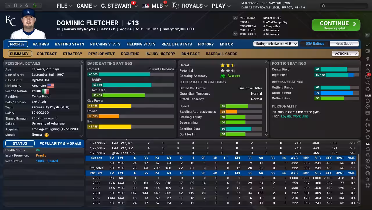The Royals drop into a tie for the lead in the AL Central (with the White Sox) and 4 games back from the AL (and baseball) leading 33-19 Yankees. They Phillies are leading over in the west, a 33-21 record making them the only other team in baseball with a .600+ winning record. Kansas City Results The Royals suffer a losing month, going 13-14 with some feeble offensive performances. Divisionally, it was a Guardians month as Kansas City opened up the month dropping two-three at Cleveland before matching that with a 2-1 home series victory at the end of the month. Four series on the road vs AL teams made for a tough month, with the Royals beating the Blue Jays (29-25) and the Avalanche (25-29) 2-1 but dropping three-four to the Mariners (27-26) and ending the month getting swept in a three-game series by the Rays (29-25). Getting swept 0-3 at home by the .500 Rangers was disappointing but the AL West bottom dwelling Angels (22-33) were swept to ensure an even home record. In the only interleague Series, the Royals hosted the 26-27 Cubs and took the series 2-1. Kansas City Team Statistics Two months into the season and the usual story of a stronger pitching corps versus batting core is true in Kansas City. However, two areas of concern/frustration are defense and stolen bases – one which has dropped from its usual AL-leading position, while the other has regressed despite a strategic tweak to make what is a reasonably quick, base stealing team more aggressive. It was Will Gasparino (-52 wRC+) with the cold bat in May, albeit it from a very limited sample size, while Bobby Witt Jr. (99 wRC+) has started to come around with a league average month, although with a poor defensive month. Tim Storer (132 wRC+) continued his great start to the season with 7 HRs in the month pacing a .558 slugging %. Steve Carter (-2.2 ZR) will have to have his defensive assignments carefully managed while Sheng-En Lin (-1.1 ZR) has struggled covering SS on occasion and learning on the fly. Roles reversed in the starting rotation in May as Mason Barnett (100 ERA+) was back to league average (albeit with a walk rate of 10% that warrants review) while J.J. Paniagua (68 ERA+) struggled through his 6 starts, giving up 8 HRs, and four games with 4+ runs. In the bullpen, Nicanor Berns (63 ERA+) has not been able to lower his walk rate and will be given a rest in Omaha, but William Schmidt (147 ERA+) had a better FIP (3.35) as part of a bullpen that is generally firing well. Jonathan Fleri (0.98 ERA AAA) has excelled at AAA and, having not given up a single HR across 18 innings (something he struggled with in the Spring), earns the recall in place of Berns. Transactions & Injuries Monday, May 10th , 2032 3B Jeremy Rogerson was injured while throwing the ball. The diagnosis is not yet known. Tuesday, May 11th , 2032 3B Jeremy Rogerson diagnosed with a forearm strain, is day-to-day for 3 weeks. Sunday, May 16th , 2032 C Dave Holcombe was injured while running the bases. The Diagnosis: oblique strain. He's expected to miss about 2 weeks. Wednesday, May 19th , 2032 SP Marcos Paz was injured while pitching. The diagnosis is not yet known. Sunday, May 23rd , 2032 SP Marcos Paz diagnosed with a strained oblique, will miss 5 weeks. Sunday, May 30th , 2032 Traded 34-year old CF Dominic Fletcher to the Toronto Blue Jays, getting $500,000 in cash in return. Losing Paz for over a month was a disappointment for the fragile pitcher, with the Royals choosing to promote vastly experienced Luis Garcia (2031 MiL FA) to fill in, and he had a 5.2-inning, 5 Hit no decision first outing. The Royals decided to take no chances with 3B Jeremy Rogerson when he strained his forearm, sending him to the IR and taking the chance to recall Hunter Owen from his rehab assignment. Backup Catcher Holcombe’s fragility was exposed as he sustained an injury running the bases. Experienced Miguel Palma (2031 MiL FA) came up and appeared in 3 games. After going 9-19 in April, Dominic Fletcher went 3-35 in June which was more aligned to his 2031 bat. His glove was still trending in the wrong direction (a -2.3 ZR over two months) and the Royals decided to get out of his $2m contract. The Blue Jays were willing to take all of his contract and an additional $500k in cash, which the Royals happily accepted. Around the League Transactions Sunday, May 2nd , 2032 Chicago Cubs: Signed 2B Kahlil Watson to a 2-year contract extension worth a total of $15,200,000. Thursday, May 13th , 2032 Cincinnati Reds: Signed free agent 1B Brooks Baldwin to a 1-year contract worth a total of $1,040,000. Friday, May 14th , 2032 Colorado Rockies: Signed LF Yanquiel Fernandez to a 3-year contract extension worth a total of $38,400,000. Saturday, May 15th , 2032 St. Louis Cardinals: Signed free agent RP Cionel Perez to a 1-year contract worth a total of $12,200,000. Wednesday, May 26th , 2032 New York Yankees: Signed C Dalton Rushing to a 3-year contract extension worth a total of $28,500,000. Sunday, May 30th , 2032 The Cleveland Guardians traded 21-year old minor league RHP Davon Willie and 23-year old minor league RHP Greg Campbell to the San Diego Padres, getting 34-year old minor league 3B Jared Triolo and 23-year old minor league 1B Ignacio Borges in return. Monday, May 31st , 2032 The Milwaukee Brewers traded 21-year old minor league SS Jim Provost and 21-year old minor league 1B Chris Paul to the Cleveland Guardians, getting 29-year old minor league 3B Jose Ramos in return. Injuries Tuesday, May 4th , 2032 Cleveland Guardians: SP Adam Macko diagnosed with a torn labrum, will miss 4-5 months. Atlanta Braves: CF Michael Harris II diagnosed with a fractured rib, will miss 3-4 weeks. Miami Marlins: RP Dylan Volantis diagnosed with a ruptured finger tendon, will miss 4-5 months. Wednesday, May 5th , 2032 Atlanta Braves: CL Miguel Sime Jr. diagnosed with an arthritic elbow, will miss 3-4 months. Thursday, May 6th , 2032 Arizona Diamondbacks: SS Jansel Luis diagnosed with a fractured ti