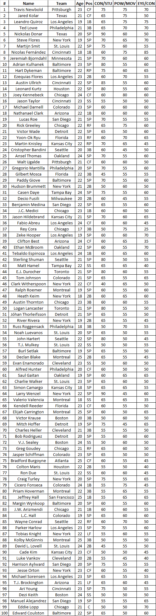 Jared Kolar out of Nebraska was drafted 1st overall. Martijn Smit, originally from the Netherlands, was the top pitcher. The top high schooler - Heath Keim - was drafted 11th. We're starting to possibly see a trend with high schoolers getting drafted a bit lower than usual which I'll keep an eye on. Round 1, Pick 1 - Texas Rangers: CF Jared Kolar, age 21 Round 1, Pick 2 - St. Louis Cardinals: SP Martijn Smit, age 21 Round 1, Pick 3 - Arizona Diamondbacks: 1B Nathanael Clark, age 21 Round 1, Pick 4 - New York Mets: SP Larry Wenzel, age 21 Round 1, Pick 5 - San Francisco Giants: 1B Leland Lockhart, age 21 Round 1, Pick 6 - Minnesota Twins: SP Jeremiah Bjorndahl, age 21 Round 1, Pick 7 - Kansas City Royals: SP Martin Knisley, age 21 Round 1, Pick 8 - Cincinnati Reds: SP Austin Ullrich, age 21 Round 1, Pick 9 - Houston Astros: SP Leonard Kurtz, age 21 Round 1, Pick 10 - Florida Marlins: 3B Gilbert Mosca, age 21 Round 1, Pick 11 - New York Yankees: 2B Heath Keim, age 18 Round 1, Pick 12 - Montreal Expos: 3B Priam Hoverman, age 21 Round 1, Pick 13 - Cleveland Indians: 3B Charles Heller, age 21 Round 1, Pick 14 - Philadelphia Phillies: 3B Russ Roggensack, age 18 Round 1, Pick 15 - Los Angeles Angels: SP Zeke Hooper, age 18 Round 1, Pick 16 - Pittsburgh Pirates: SP Davey Feeney, age 22 Round 1, Pick 17 - Baltimore Orioles: SP Burl Setlak, age 18 Round 1, Pick 18 - San Diego Padres: SP Benjamin Medina, age 21 Round 1, Pick 19 - Chicago White Sox: 3B Austin Thornton, age 22 Round 1, Pick 20 - Colorado Rockies: SP L.C. Hall, age 18 Round 1, Pick 21 - Tampa Bay Devil Rays: SS Matt Hamel, age 21 Round 1, Pick 22 - Detroit Tigers: SP Jóhan Thorleifsson, age 21 Round 1, Pick 23 - Seattle Mariners: SP John Hartert, age 21 Round 1, Pick 24 - Atlanta Braves: SP Rutherford Jennings, age 21 Round 1, Pick 25 - San Diego Padres: SP Manuel Alejandrez, age 18 Round 1, Pick 26 - Boston Red Sox: SP Fabian Ingle, age 18 Round 1, Pick 27 - Chicago Cubs: RF Rick Greeley, age 21 |
