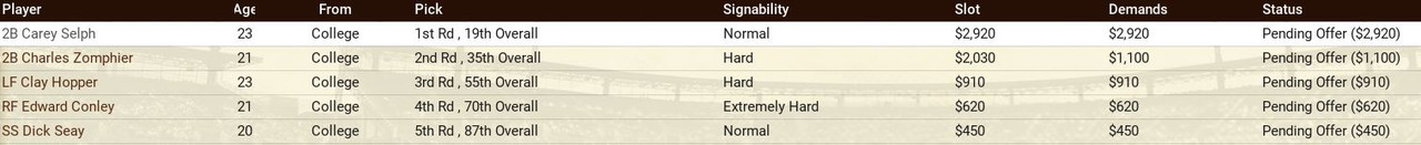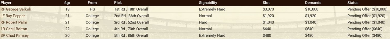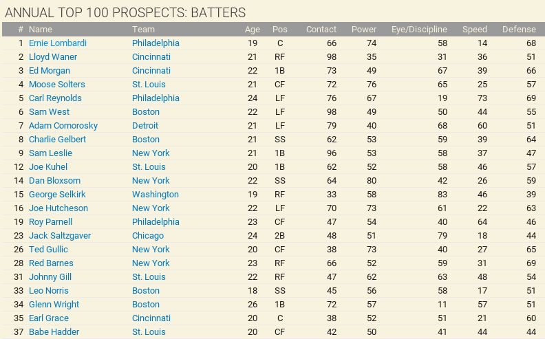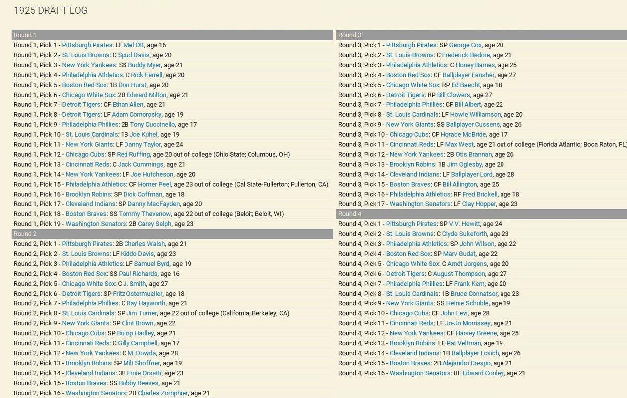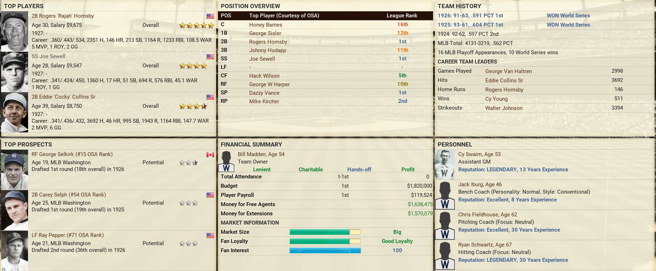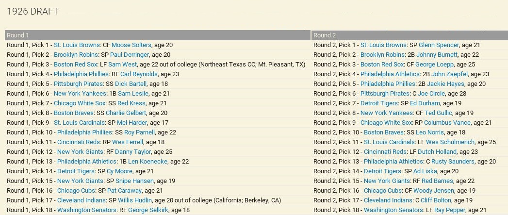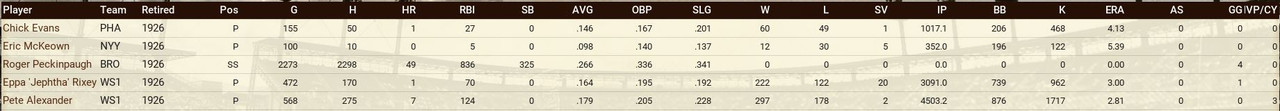 Retirements: Senators lose Rixey and Alexander. ![]() Draft: Satchel Paige gets drafted by Pittsburgh in the 4th Round ![]() Washington Draft ![]() Trade We trade Phil Todt (1B, .100 BA) and Luke Williams (1B, .250 7 RBIs) to the Philadelphia Athletics in exchange for Honey Barnes (C) and a 4th Round Pick