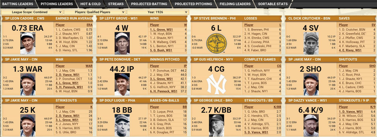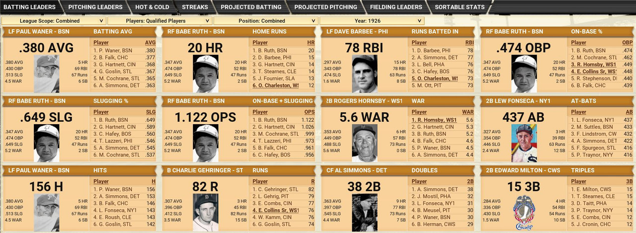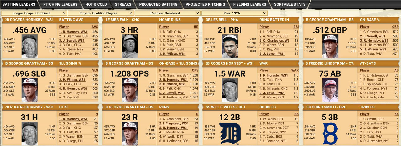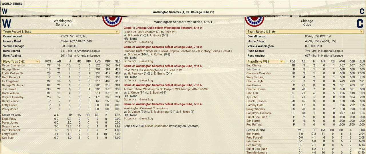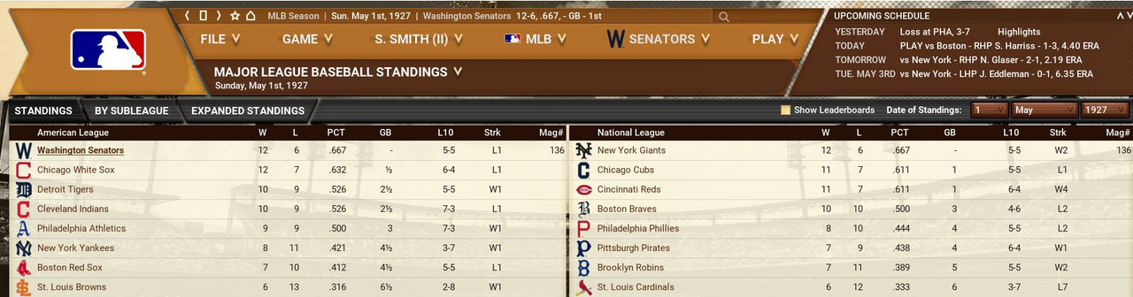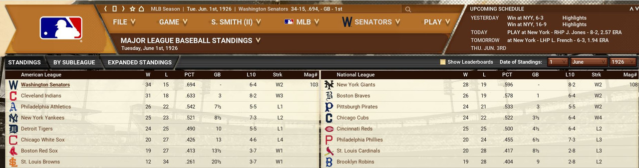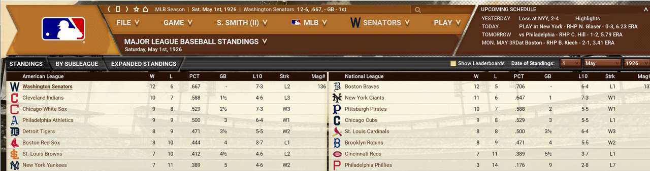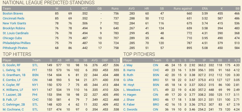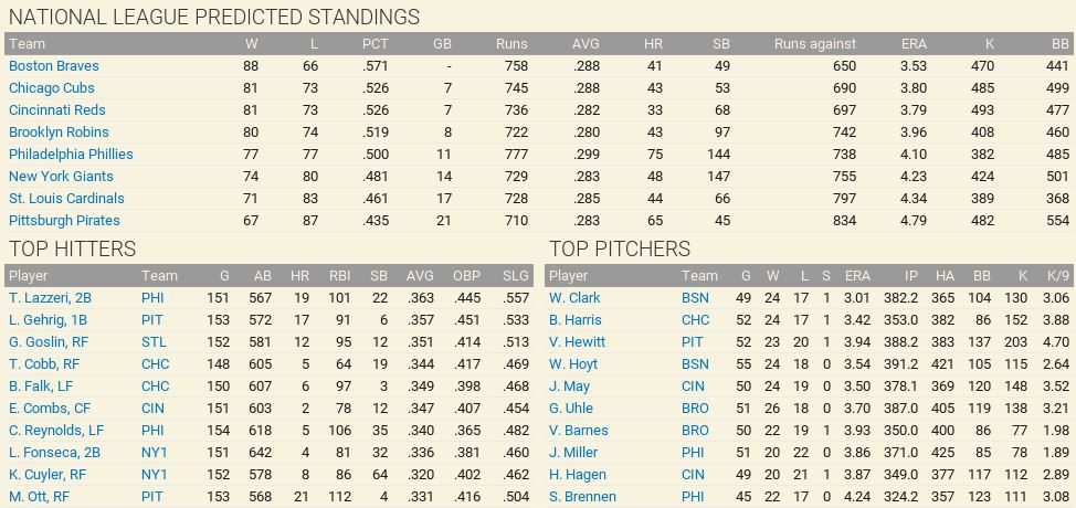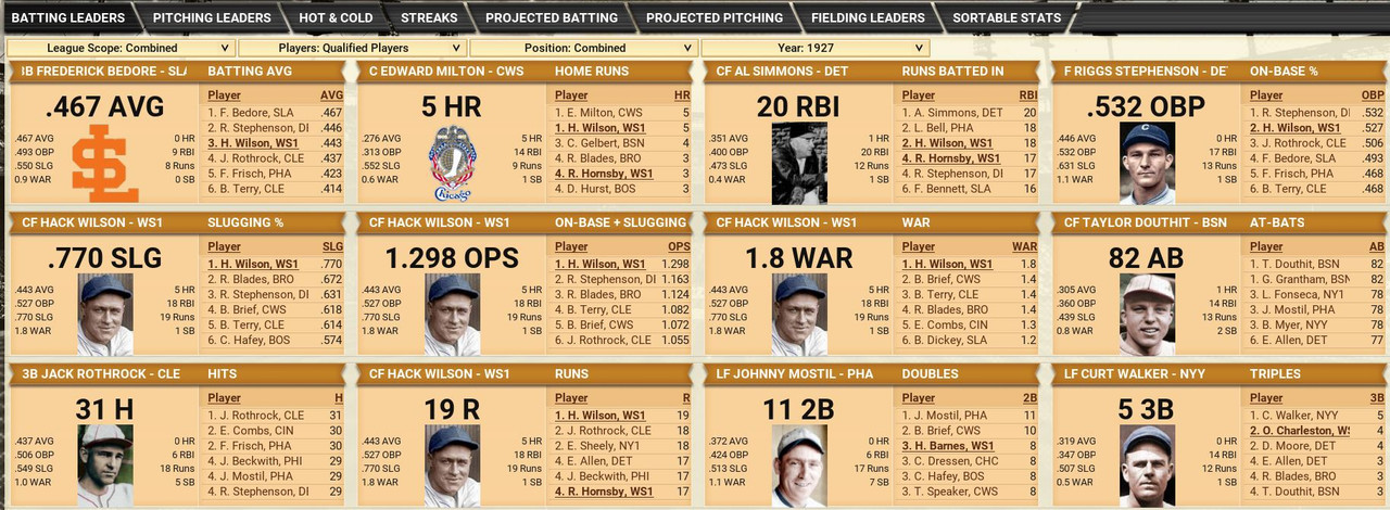 With only the first month of the season in the books, both Leagues are itching to see which team will jump out and establish the tone for the rest of the season. Early favorite see the Senators and White Sox in the American and New York, Cincinnati, and Chicago in the National. Standings ![]() Batting Stats ![]() Pitching Stats ![]() Washington Senators Report Record 112-6: 1st Place Hack Wilson is named Batter of the Month (.443, 5 HR, 18 RBIs)