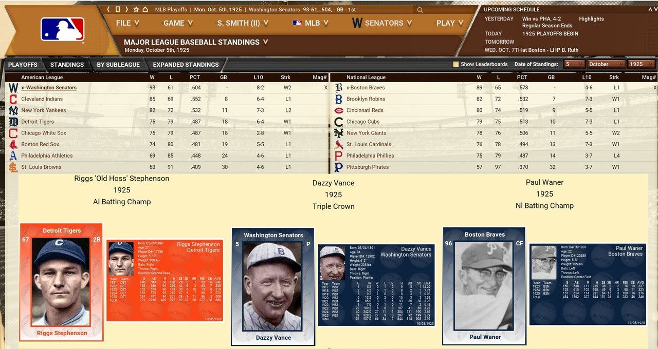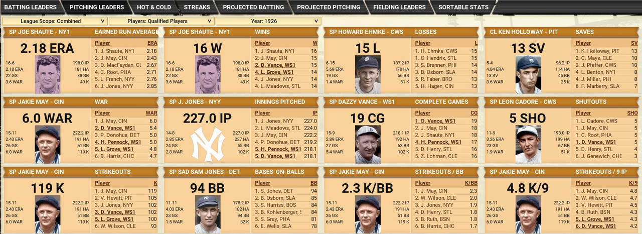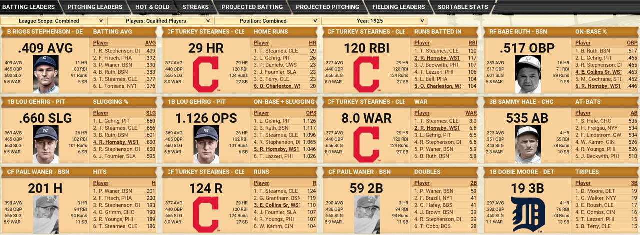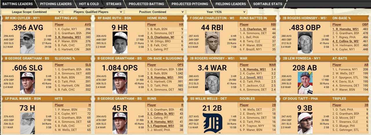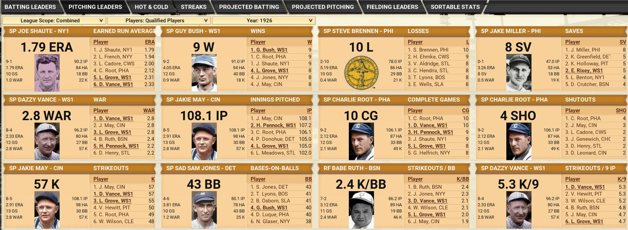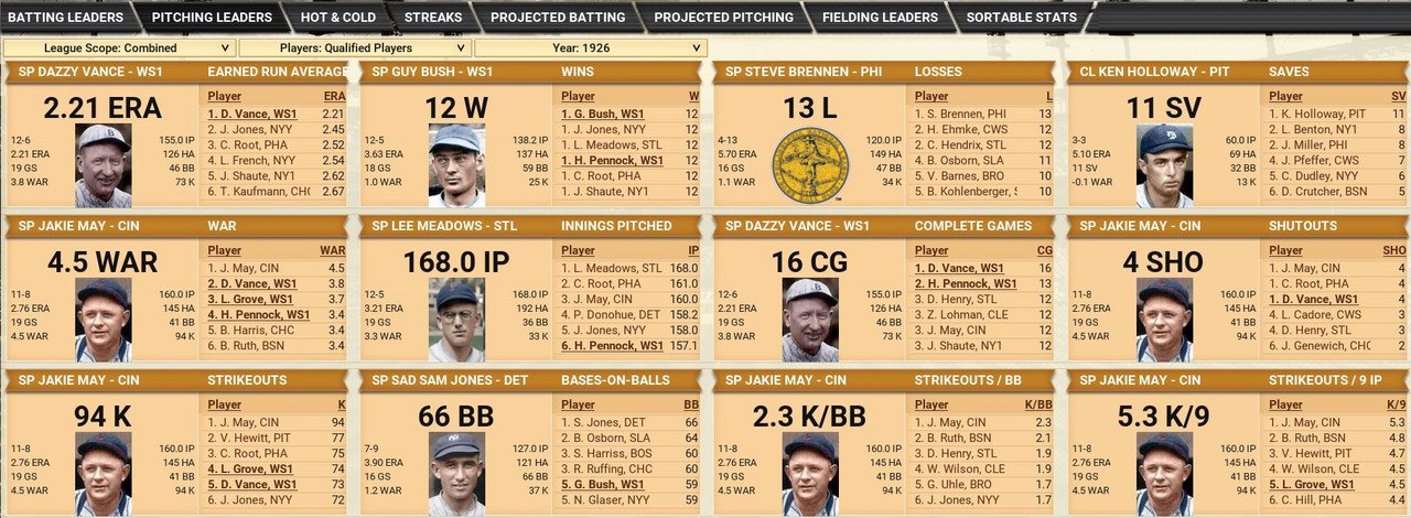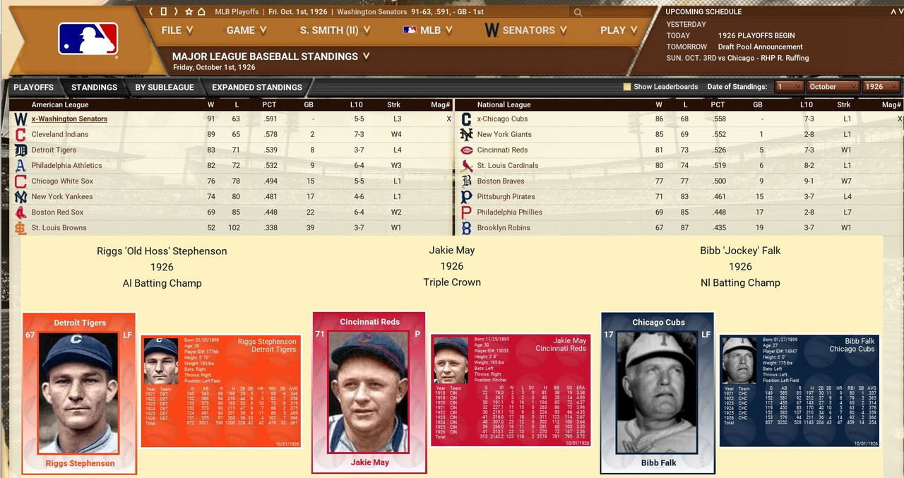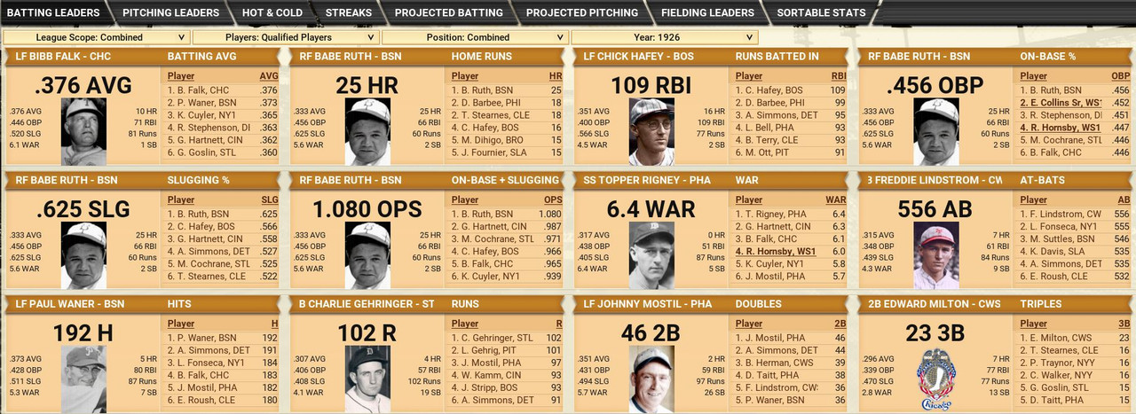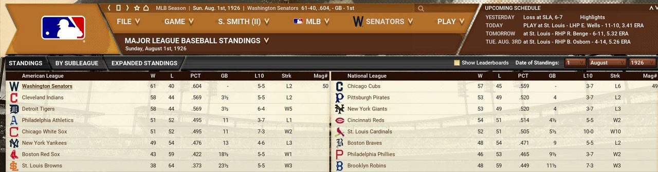 With only the first month of the season in the books, both Leagues are itching to see which team will jump out and establish the tone for the rest of the season. Early favorite see the Senators and White Sox in the American and New York, Cincinnati, and Chicago in the National. Standings ![]() Batting Stats ![]() Pitching Stats ![]() Washington Senators Report Record 112-6: 1st Place Hack Wilson is named Batter of the Month (.443, 5 HR, 18 RBIs)