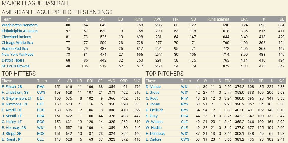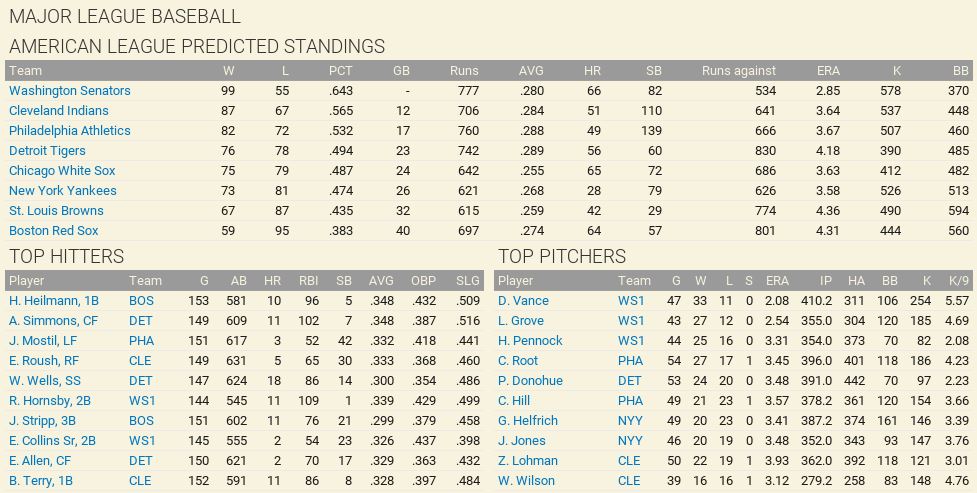 Time for another baseball season. Which teams have made the right moves? Who worded the hardest and the most improved? Will there be repeat in the upcoming World Series? Stay tuned to find out. Predicted Standings ![]() ![]() The Top 40 Batters ![]() Pitchers ![]() 1927 Washington Senators