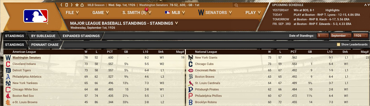 The New York Giants reeled off 13 straight wins to sit at the top of the National League. Over in the American League, the Washington Senators woke up and increased their lead to 5.5 games over Detroit. Standings ![]() Batting Stats ![]() Pitching Stats ![]() Washington Senators Report Record 78-52: 1st Place Herb Pennock was named Pitcher of the Month (6-1, 2.40 era)
