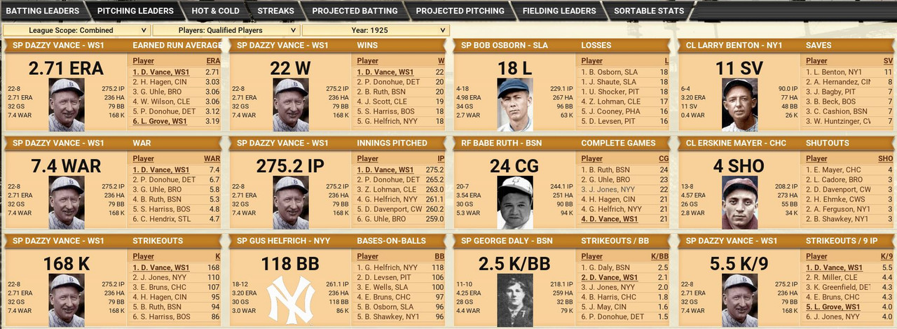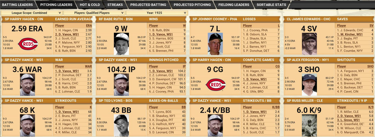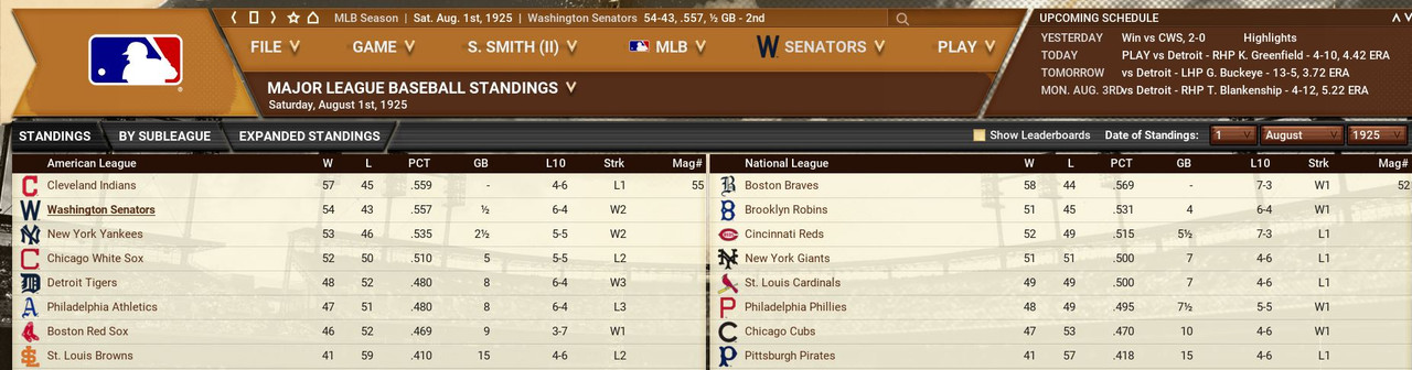 The American League sees a bunch of the top 5 teams within 3 games. Over in the National League, the team that looks to beginning to run away ,are the Boston Braves, behind Babe Ruth (9-0, 2.93) Standings ![]() Batting Stats ![]() Pitching Stats ![]() Washington Senators Report Record 25-18: 1st Place Senators were cruising until the last of the month, 4 game losing streak.