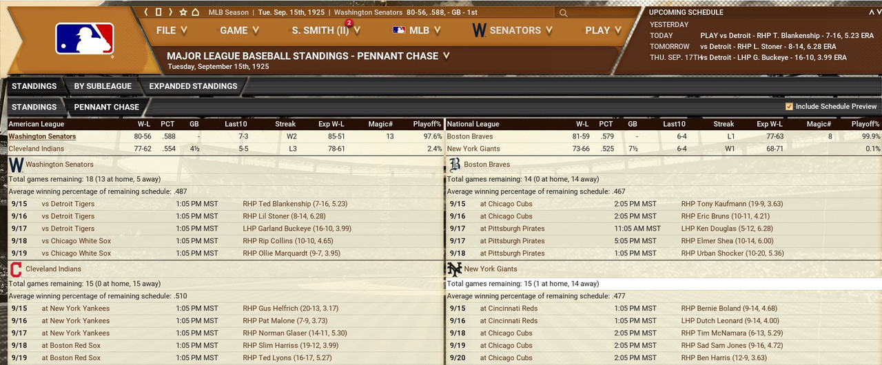 We are coming down the home stretch of the season with around 15 games remaining. Looks like a rematch of the 1923 World Series in the making.