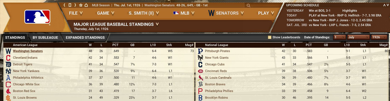 The Boston Braves are cruising with the help of Babe Ruth. He is 13-1, 2.94 era as a pitcher and .392 with 6 HR 35 RBIs as a batter. The race is tight in the American League, both Washington and Cleveland are back and forth. Standings ![]() Batting Stats ![]() Pitching Stats ![]() Washington Senators Report Record 42-29: 1st Place Dazzy Vance (6-0, 2.09) is named Pitcher of the Month