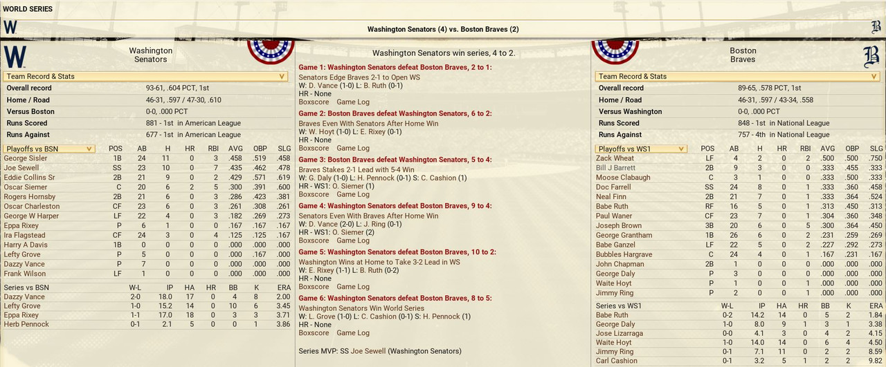 The Washington Senators will take on the Boston Braves in the World Series that will be a rematch of the 1923 contest, in which Boston defeated the Senators 4-3.