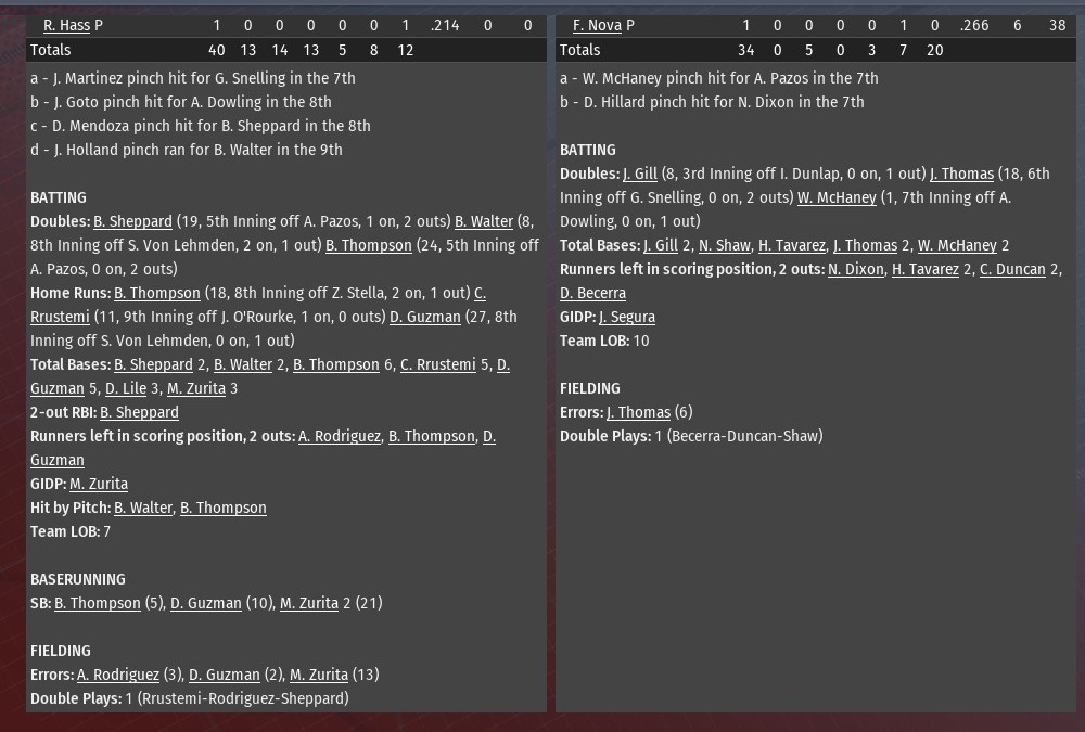 Fort Wayne built a 3-0 lead through the opening seven innings against St. Louis starting pitcher Alex Pazos, the Mad Men then pummeled the River Walkers' bullpen for eight in the eighth and two in the ninth as they rolled to a 13-0 win at Busch Stadium (2006). The win was the third in a row for the Mad Men, after dropping the opener of the four-game series. Marco Zurita connected for a two-run single off Pazos in the top of the fourth, putting Fort Wayne ahead 2-0. Ben Thompson and Brian Sheppard then banged out back-to-back doubles with two outs in the fifth to make it 3-0. It didn't get ugly until the eighth, when the Mad Men scored eight times. A one-out solo homer from Darlin Guzman off reliever Stephen Von Lehmden got things rolling. Von Lehmden allowed the next four Fort Wayne batters to reach base. Two got aboard via intentional walk and Bill Walter had an RBI double. Zachary Stella took over for St. Louis, and allowed the first three batters he faced to get aboard. Included were a two-run single by Daylen Lile and a three-run home run by Ben Thompson. Castrioti Rrustemi completed the scoring for the Mad Men, hitting a two-run homer off Justin O'Rourke in the ninth. O'Rourke hit the next batter, Bill Walter, leading to a brawl which cleared the benches. Mad Men starting pitcher Isaiah Dunlap tossed five shutout innings, allowing three hits. He struck out three and walked two. Gary Snelling and Alexander Dowling both worked an inning to get the game to the eighth. Rich Haas, who came up through the St. Louis farm system, stymied the River Walkers over the final two innings. |