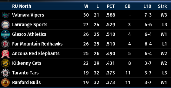Sunday, June 1, 2059 SLIGO SURGES INTO RU WEST LEAD The Sligo Rovers (32-19) blew everybody away in May with a fine 19-9 record to surge into the Ruthlandian West lead with a 4-game margin over runners-up Volusia (28-23) and Colfax (28-23)... Forest City (26-25) is in the fourth spot in the standings... for the previous 6 seasons the Rovers were bridesmaids, coming in second each time... this year Sligo is seeking its first pennant since 1940... the Vigilantes stumbled to 13-15 in the month, while the Blasters and Firebirds were even at 14-14. Ruthlandian West Outlook: Sligo has unbelievably good pitching with a 2.50 team ERA for the first two months of the campaign... the offense is just lackluster... looks for the race to get closer... it's doubtful the Rovers can sustain this kind of pace on the mound... although they had the lead at the end of April, defending division champion and preseason pick Volusia has not played up to its capability yet... Sligo will have to beware of them... the others in the race don't have the pitching to compete with the Rovers and the V's and will fight it out for the third spot... Colfax, Middlefield, Fort Benton and Forest City will be in the battle for the first division spots, but Rocky Rapids and Stoner at the bottom of the RU West, will have to wait until next year. [B] Last edited by Eugene Church; 02-11-2019 at 01:20 PM. |