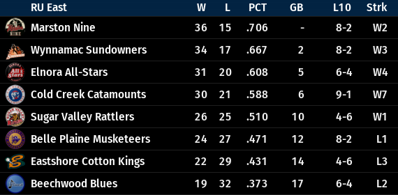 Sunday, June 1, 2059 MARSTON AND MACS DUEL IN RU EAST At the end of the first two months of action in the Ruthlandian East Division , it's a tight duel between the Marston Nine and the Wynnamac Sundowners... the Nine (36-15) have a 2-game edge over the Macs (34-17)... also hanging around close are the third place Elnora All-Stars (31-20) and fourth place Cold Creek Catamounts (30-21)... Marston and Wynnamac were forecast to be contenders, while the All-Stars and Catamounts are doing better than expected... well-regarded Eastshore (22-29) has fallen to the wayside, slipping down to the 7th spot in the standings. Both Marston and Wynnamac bolted past the April leader Elnora with standout months in May... the Nine had a brilliant month with a 22-6 mark and the Macs were almost as good at 20-8... the All-Stars dipped a little to 15-13, while the Catamounts did well with a 17-11 record... fifth place Sugar Valley (26-25) did well in April, but fell back with a 13-15 mark in May... the Rattlers lost a lot of ground and are now 10 games off the pace. Ruthlandian East Outlook: Marston is playing splendid baseball and has posted the best record in the IPA... and rightly so... the Nine are hitting over .300 as a team, can score and have very good pitching with decent firepower... right now they are the best team in the IPA... the race will probably narrow down to just the Nine and Sundowners... the Macs have the second-best record in the IPA and will really test Marston... they have a solid, good all-around ballclub... both teams have Pro Cup potential, too... the Sundowners are the defending division champion and will not give up the title lightly... Marston finished 6th last year ((73-81)... Wynnamac has won the RU East 5 times in the last 7 seasons... Elnora and Cold Creek hit well, but can't match the other teams on the hill... the All-Stars and Catamounts will fight it out for the third and four spots in the RU East... no one else figures to challenge them. Last edited by Eugene Church; 02-10-2019 at 04:45 PM. |