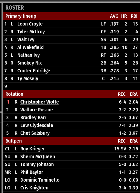 Thursday, May 1, 2059 RED CAPS QUICK OUT OF THE GATE IN TU NORTH The Oxford Red Caps (16-7), the prohibitive favorite to capture the Tycobbian North this year, have rocketed to the top of division and have the best record in the Islandian Pro Alliance for the opening month of April... they are being chased by runner-up Hartsdale (15-9), third place Blue Lake (14-9) and last year's champion Arlon (12-11), tied with White River (12-11) for fourth place in the standings... trailing behind in the 6th spot are the North Hills Hawks (10-13), 7th-place Fairfax (9-14) and last place Mahaska (5-18). Oxford has won the Tycobbian North 3 times in the last 7 years... the most recent pennant came in '57... and the Red Caps are already rolling toward another division title with a great first month of the new season, tied with Elnora of the RU East for the top mark in the IPA (16-7)... this year the club has stepped its pitching staff up to another level... the team ERA is 3.20 (5th)... this is the best ERA in the team's history... coupled with its fine batting attack, Oxford looks hard-to-beat this season... the top starters are Meldon Eddington (4-0/2.48), Wiley Beckford (4-0/1.88), Dingo Willmon (4-0/4.02), R. C. Russell (1-2/2.08) and ace Maury Statler (1-3/4.41), who had a tough April... the high-powered attack hasn't gotten going yet, but it still put up a lot of runs... the Red Caps scored 113 runs (6th), batted .259 (14th) and rapped 23 out of the park (12th) in a slow month... budding star LF Showboat Lynn (.329/6 HR/17 RBI/19 R/1 SB) led the offense with help from superstar 1B Buddy Blackford (.300/2 HR/16 RBI/9 R) and SS Roger Bajon (.292/1 HR/11 RBI/11 R)... Blackford was honored last year with the TU Golden Bat and Most Valuable Player Award... together Blackford and rookie Lynn totaled 93 homers... this could a Pro Cup year in the making... that's how good Oxford is. Last year the Hartsdale Hellcats wound up fifth in the standings (77-77)... the Hellcats have been stuck there for 5 consecutive seasons... the last pennants came in back-to-back years 2046 and 2047... Hartsdale won the Pro Cup in '46... the mound staff has been truly amazing so far this season with a microscopically low 2.40 ERA (1st)... the bullpen is even better at 2.14 (4th)... offensively the club has been a little less than average with a .252 BA (20th), 93 runs (21st-tied) and 19 homers (20th-tied)... so far, so good... the second place Hellcats (15-9) are clinging close to first place Oxford, just a game behind them... if they continue to pitch anywhere near this good, they will seriously challenge the Red Caps for the TU North title... the pitching has been superb with starters Lew Clydesdale (5-0/1.80), Christopher Wolfe (3-1/1.14), Tommy Johnson (3-0/3.44), Cris Knighten (1-1/2.16) and Bradley Barr (1-1/1.06)... veteran closer Roy Krieger (0-1/3.06 ERA/9 saves/12 G) heads up a solid bullpen... the offense has been adequate, paced by 1B Al Wakefield (.322/6 HR/19 RBI/17 R), who is enjoying his best season ever... so is SS Walt Ivy (.330/3 HR/11 RBI/16 R/1 SB)... 2B Smokey Nix (.286/1 HR/7 RBI/12 R) and and backup OF Nathan Ivy (.400/2 HR/10 RBI/8) have been productive bats, too... maybe this year Hartsdale is first division bound... or better. It's been 10 years since the Blue Lake Blue Sox won more games than they lost... for the previous 3 seasons they have been mired in 8th place... sadly, the last playoff appearance was in 2030... boy, the Blue Lake fans need a good season... could this be it?... it's a dream month for them... the team is hitting like crazy with a .290 BA (1st), scoring well with 103 runs (10th) and cracking a few homers (16 HR/26th-tied)... and would you believe the team ERA is a marvelous 2.85 (2nd) with the #1 bullpen (1.27 ERA)?... would you believer Blue Lake (14-9) is in third place, just 2 games out of first?... leading the starting rotation are Weldon Eddington (2-1/1.49), Bobby Layne (2-0/1.05), Eddie Lucas (2-2/3.83) and Jeff Galvan (1-2/2.14)... after losing 2 starts, Dookie Denham (4-2/4.02 ERA/1 save/9 G) switched to closer and has excelled with 4 victories and a save... the Blue Sox batters are led by C Daryl Monaghan (.338/2 HR/12 RBI/15 R/1 SB), CF Steve Schueler (.380/0 HR/7 RBI/13 R/2 SB), 1B Billy Blue (.344/2 HR/11 RBI/11 R) and 2B John Gilbert (.279/0 HR/11 RBI/8 R)... maybe the Blue Sox will rid themselves of the blues in 2059. Two contenders, Luxora (12-11) and White River (12-11), are currently deadlocked in 4th place in the TU North standings, 4 games off the pace of Oxford... Luxora won the division last season and lost in the Pro Cup Finals to champion Crystal Lake in 5 games... the Zorros' slow start is caused by lousy hitting... 40 points lower than last year... the Z's are batting only .223 (32nd), but have scored 93 runs (21st-tied), mainly because of 22 home runs (13th-tied)... the mound corps has been fine with a 3.60 ERA (8th)... nobody is hitting well for average except for RF Omar Solis (.338/3 HR/8 RBI/8 R)... the top power guy is C Francisco Queiro (.279/5 HR/16 RBI/10 R)... and LF Marvin Harrelson (.247/3 HR/12 RBI/16 R/2 SB) has been productive, too... 1B Wayne Tibbs (.259/2 HR/14 RBI/11 R) batted .323 last year with 28 home runs, but has started slowly this year... 2B Ryo Nijo (.188/3 HR/8 RBI/5 R) and SS Felipe Alvares (.156/1 HR/4 RBI/7 R) have both been terrible so far this season... in '58 Nijo hit .280 with 18 roundtrippers and Alvares batted .303 with 10 home runs... on the positive side of the ledger Luxora pitching has held up, led by Mack McKitrick (4-1/2.30), Wallace MacPherson (2-3/2.79), Paolo De Freitas (1-1/2.96) and Juliano Machado (2-3/4.29)... the bullpen has been fine with Bartolo Baptista (0-0/3.21 ERA/6 saves/11 G) in the closer role... the Zorros should be fine once the offense perks up... Luxora could be in the hunt this year again... the Z's will not go away without a fight. 5th in the Tycobbian North standings are the White River R