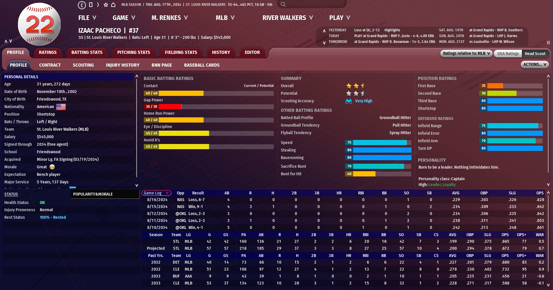 The St. Louis River Walkers have recalled shortstop Izaac Pacheco from AAA Memphis and sent infielder Eric Granger down to the Redbirds.