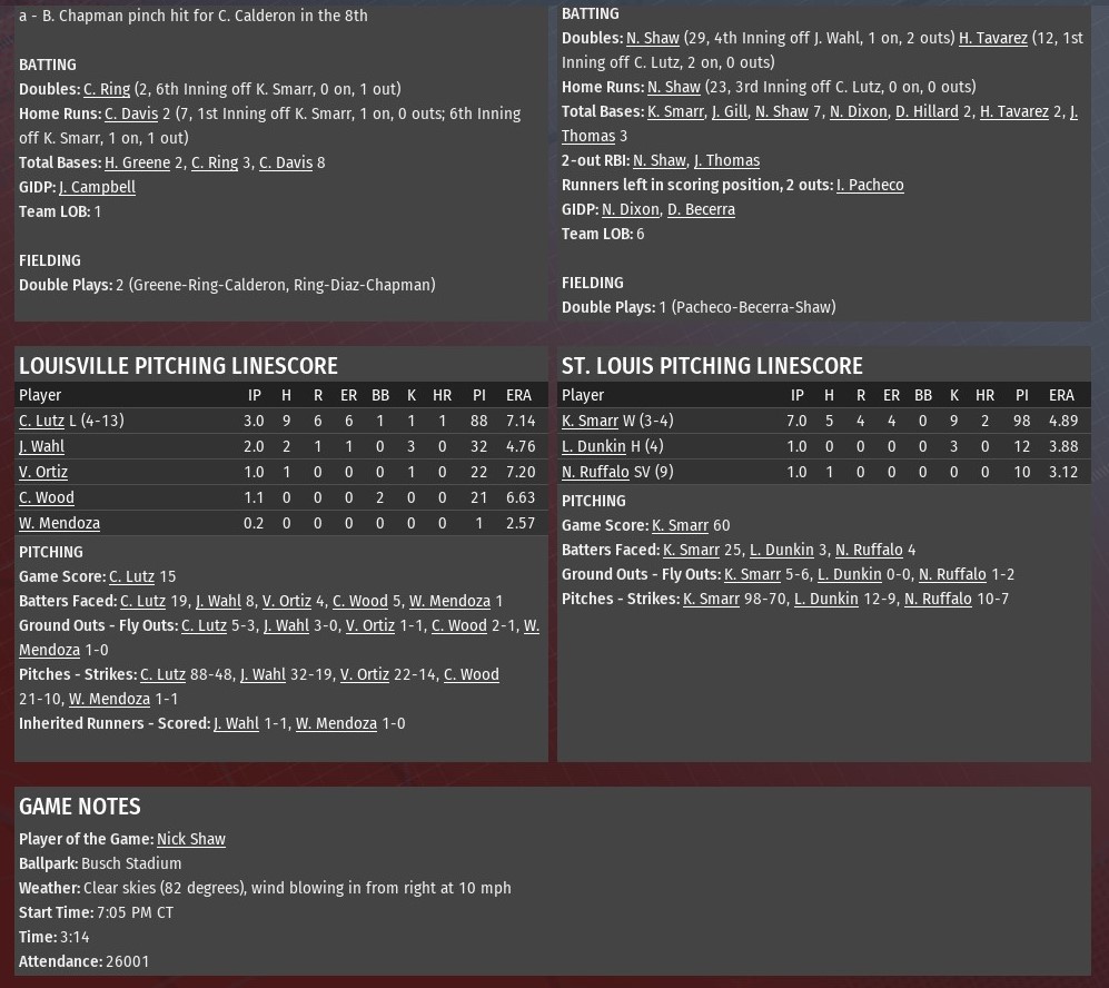 St. Louis wiped out an early 2-0 deficit by scoring three runs in the bottom of the first inning, it later took control by scoring twice in both the third and fourth as the River Walkers went on to defeat Louisville 7-4 at Busch Stadium (2006). The win allowed St. Louis to avoid getting swept by the Sluggers in the three-game series. It also halted a five-game losing streak. Chase Davis homered twice in the game for the Sluggers, including a two-run shot in the first off Walkers starter Kyle Smarr. St. Louis, however, quickly got to Sluggers starter Chris Lutz in the bottom of the inning. The River Walkers put their first five batters on base. Hector Tavarez drove in a run with a double, and Nick Shaw tied it with a single. Jared Thomas completed the run with another single, as St. Louis went up 3-2. The Walkers added a pair of runs off Lutz in the third. Nick Shaw led off the inning with his 23rd homer of the season. Jared Thomas followed with a single. A Jovan Gill single moved him to third, and Izaac Pacheco picked up the RBI when he hit into a fielder's choice. St. Louis got its final two runs in the fourth. Lutz gave up a lead-off single to Nathaniel Dixon before leaving the game. Nick Shaw scored Dixon with a two-out double off Joe Wahl. Jared Thomas scored Shaw when he followed with a single. Smarr (3-4) worked seven innings, allowing four runs on five hits. He struck out nine and didn't issue a walk. Luke Dunkin and Nick Ruffalo both recorded scoreless innings of relief. Ruffalo earned his ninth save. |
