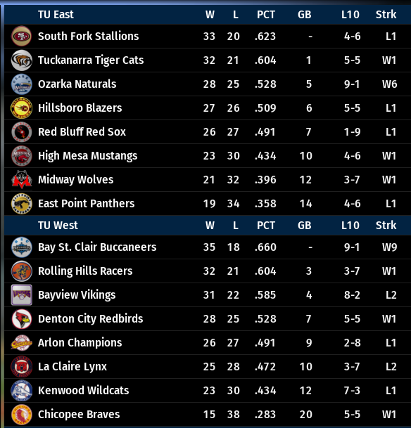 Thursday, July 1, 2060 IPA HITS MIDSEASON MARK There is a whole bunch of good old-fashioned pennant races going at the midseason mark in the Islandian Pro Alliance... seven of the eight divisions are still very much in doubt... the only exception is the Ruthlandian East race where Wynnamac is seven games ahead and is looking very much like the pennant winner. BULLS HANGING TOUGH IN RU NORTH A quick survey of the races around the IPA still shows unheralded Ranford still ahead in the Ruthlandian North... the Bulls are showing staying power... they had a good June with a 16-10 mark... but the Glasco Foxhounds are snapping at their heels after a spectacular 19-7 month... the Bulls are just two games up... Far Mountain tanked it last month with a terrible 11-15 record to drop 8 games off the pace... the LaGrange Gators are running in the fourth spot after posting a 15-11 in June... preseason favorite Valmara has tumbled into oblivion... the Vipers are in last place, 20 games behind. 3-TEAM FIGHT IN RU SOUTH The Ruthlandian South may be settling down a bit into a three-team fight between the current leader, Grand City, last year's champ and preseason pick, St. John, and the Waleska Westerners... the upstart Valka Blackhawks have dropped back to sixth place after sticking close to the top in the first two months of play... the bottom fell out as the Blackhawks slumped badly to 8-18 last month... both Grand City and St. John prospered in June with 16-10 records... Waleska was not quite as good and lost ground at 14-12... the Cybercats have a one-game edge over the Crusaders and are three better than the Westerners. MACS SHINE BRIGHT IN RU EAST After two excellent months number one Wynnamac cooled down a little in June to just 14-12 in the Ruthlandian East, but the Sundowners are still seven games in front... all of the division challengers did about the same... the runner-up Elnora Clippers were also 14-12... third place Marston was even at 13-13... and fourth place Cold Creek suffered with a 12-14 mark. 5 CHALLENGERS IN RU WEST The Ruthlandian West Division has tightened up the last month... five clubs are within four games of each other... the Volusia Vigilantes climbed ahead of the Rocky Rapids Snappers, but not by much... the V's had a solid 17-9 month in June and jumped into first place... the Snappers dipped to 12-14 and are tied with preseason choice Sligo for second place... the Rovers were very disappointing in April (9-16), but have gotten back on track in May (17-11) and June (17-9)... Fort Benton is on the rise after playing poorly in the first month (9-16)... since then the Defenders are 15-13 and 16-10... they are now deadlocked in fourth place with the Stoner Silver Sox, four games behind... after a solid 15-10 in April, Stoner has slumped to 13-15 and 12-14 the last two months. 5 CONTENDERS IN TIGHT TU NORTH Nobody has much of a lead in the Tycobbian Union... last year's flag winner and this year's favorite, Oxford, got it going in June with a 17-9 record, but they are being pressed closely by Luxora (15-11) and Mahaska (13-13), both just one game back of the Red Caps... White River (15-11) is just two games out... and Blue Lake (13-13) is only three games behind... ranked as a major player this season, the Fairfax Frogs have pretty much croaked... ranked the second best team in the preseason poll, the Frogs are struggling in the sixth spot and trail by eight games... but they are showing some signs of life with a good 15-11 month in June. NINJAS NAB SOME ROOM IN TU SOUTH Last year's Pro Cup titlist, Ginza, is playing very well so far in the Tycobbian South race... the Ninjas created some space in the race with a 16-10 mark in June... they are four games better than second place Turon... the Typhoons did alright last month at 14-12... third place Southport is right with them and five games back of Ginza after notching 15-11 for the month... after a fine opening month in April (16-9), the fourth place Arroyo Grande Suns have drifted down slowly... in June they were only 11-15 and now have fallen to eight games out in the pennant race. TUCKS TOPS IN TU EAST The Tuckanarra Tiger Cats are favored to win the Tycobbian East and thus far, they have done well with winning records all three months, including 16-10 last month... they have passed early leader South Fork by three games... the Stallions have stumbled since a terrific 18-7 start in April... they were only 12-14 in June... only one other club putting up a fight... the Ozarka Naturals are in third place, 7 games off the pace... the Nats were 13-13 last month. BUCS, RACERS, REDBIRDS, BEST IN TU WEST June was a great month for somebody to take command of the Tycobbian West, but nobody could do it... first place Bay St. Clair went 12-14... Rolling Hills 13-13... Denton City 13-13... and poor Bayview could only muster 9-17... the Buccaneers still hold on to the top spot with a two-game edge over the Racers, the second choice in the preseason poll... the Bucs were picked to finish fifth this year... last year's title winner was the Redbirds... they were rated third best this season... Denton City is six games behind in the third spot in the standings... the Bayview Vikings are fourth in the TU West and are seven games out... preseason pick Kenwood has languished so far and is tied for fifth place, eight games back, but the Wildcats are showing some signs of life, going 16-10 in June. Ruthlandian Union Standings Thursday, July 1, 2060 Last edited by Eugene Church; 06-09-2019 at 10:32 PM. |