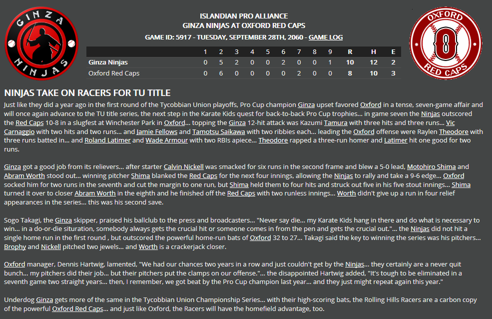 Thursday, September 30, 2060 HISTORY REPEATS, GINZA IN TU TITLE SERIES AGAIN Defending IPA Pro Cup champ Ginza is at it again... the Karate Kids upended favored Oxford again in the seventh game of the Tycobbian Union Division Championship Series... the Ninjas' Pro Cup journey continues as they go up against the Rolling Hills Racers in the second round of the IPA postseason. Tycobbian Union Division Championship Series - Game 7 Last edited by Eugene Church; 06-29-2019 at 06:08 PM. |