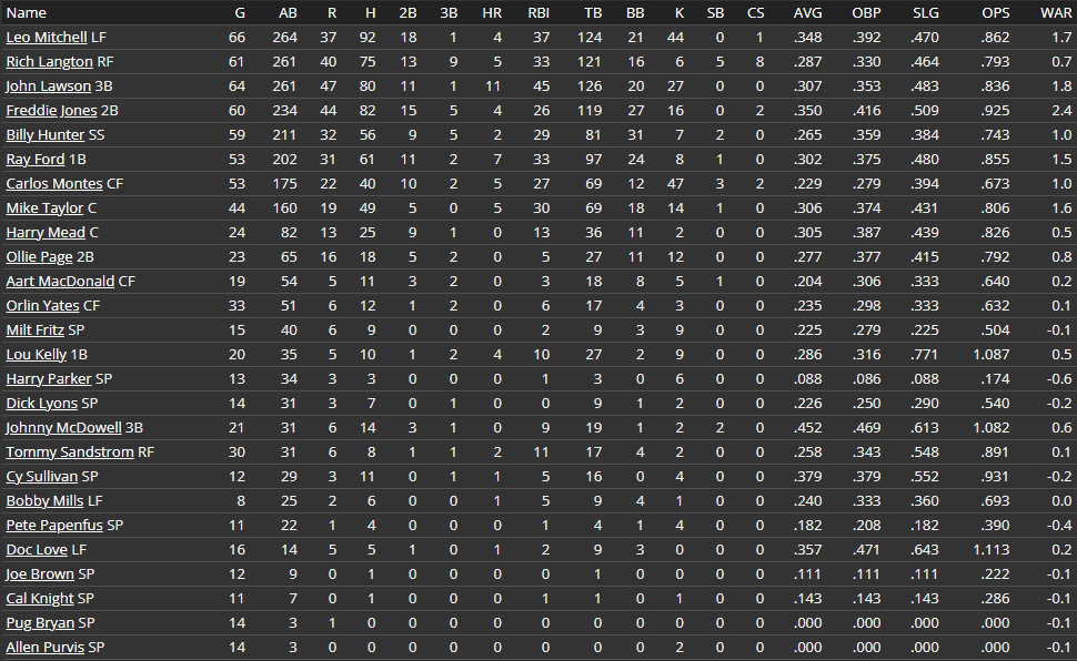Seasonal Record: 53-56 (t-5th, 10 GB) Stars of the Week Rich Langton : 26 AB, 11 H, 0 HR, 8 RBI, .423 AVG, 1.154 OPS Ray Ford : 28 AB, 11 H, 1 HR, 7 RBI, .393 AVG, 1.040 OPS John Lawson : 30 AB, 10 H, 0 HR, 3 RBI, .333 AVG, .894 OPS Schedule 8-21: Win at Wolves (9-8) 8-22: Loss at Wolves (0-7) 8-23: Loss at Foresters (7-8): 14 innings 8-24: Win at Foresters (5-3) 8-26: Win at Sailors (17-1) 8-27: Loss at Sailors (2-3) Recap You guessed it! Another 3-3 week! We managed to win one and lose one against each team we played, with three of the games being of the one run variety. We continue to make things difficult for ourselves, but hey! That 17-1 win! What a game! Would have been fun to save one of those runs for the 3-2 loss directly after, but 23 hits and 14 runs in the last three innings are pretty cool! A lot more cool then our 14 inning loss, and the playoffs are now double digit games away from us. The draft signing deadline also passed, so our four unsigned players will officially enroll into their new schools. Bill Mangrum will attend Texas Presbyterian, Dave Gilbert Texas Panhandle, Hack Mills Eastern Oklahoma, and Gordon Miller Coastal State. All four will be eligible again in 1942, and I'll keep an eye on them. College should help them all secure higher selections, and sometimes these impossible guys develop into very interesting prospects. Lyons and Lonardo were our two start pitchers, but both had a seven run start and a good start. Lyons allowed 19 hits, 10 runs (7 earned), and 3 walks in 13 innings while Lonardo allowed 24 hits, 8 runs, 2 walks, and 3 strikeouts in 14.2. Neither were as bad as Harry Parker, who was roughed up for 10 hits and 8 runs with a walk and 3 strikeouts in just two and a third. At least Milt Fritz picked up a complete game victory, 8 hits with 3 runs, 2 walks, and a strikeout. The pen, however, was almost perfect, just a single run allowed in 17.2 innings pitched. Leverett was charged with the run, but he allowed just a single hit with 4 walks and 2 strikeouts in 6.1 strong innings. Peter the Heater was scoreless again, 6 hits, 3 walks, and 7 strikeouts in 6 innings pitched. The pitching really hurt this week, and I expect more of the same in the last month or so. Rich Langton had a great week, 11-for-26 with a steal, 2 doubles, 2 triples, 5 runs, 4 walks, and 8 RBIs. Ray Ford had a similar 11-for-28 week with a double, triple, homer, walk, 7 runs, and 7 RBIs. Freddie Jones turned things around, 9-for-26 with a homer, 3 RBIs, 4 runs, and 7 walks. John Lawson was 10-for-30 with 5 doubles, 3 RBIs, and 7 runs scored. Aart MacDonald had a nice return to Chicago, 6-for-19 with 3 doubles, 4 runs, 4 walks, and 5 RBIs while going just 1-for-4 in stolen base attempts. Mike Taylor will miss a few games with an elbow contusion, but was 6-for-19 with a double, triple, 2 runs, 3 walks, and 4 RBIs. The offense wasn't bad by any means, but with the lack of pitching it didn't matter all that much. Hunter and Mitchell had rough weeks, which could have been the difference in some of those one run games, but for the rest of the season, I just want my guys to perform well, even if the wins stop coming. Looking Ahead We can't split with anyone and thankfully can't go 3-3, but we start the week in Montreal with three against the Saints. At 58-56, they are in fourth and about 7.5 out of first. Jake DeYoung's struggles could have potentially kept them out of the pennant race, as the talented 26-year-old is just 11-11 with a 5.56 ERA (78 ERA+), 1.47 WHIP, 32 walks, and 90 strikeouts in 184.2 innings pitched. Same goes for talented 25-year-old Bud Robbins, who is 9-7 with a 5.72 ERA (76 ERA+), 1.82 WHIP, 66 walks, and 34 strikeouts in 113.1 innings pitched. Rookie Bill Stewart has cemented his rotation chances, 7-3 with a 3.94 ERA (110 ERA+), 1.42 WHIP, 41 walks, and 62 strikeouts in 107.1 innings pitched. He has been helped by the #1 scoring offense in the game, led by star outfielder Red Bond. He's hitting .334/.410/.500 (130 OPS+) with 20 doubles, 2 triples, 15 homers, and 75 RBIs in 481 star level plate appearances. No other Saint is close to that line, but Adam Mullins has a nice .318/.409/.453 (119 OPS+) triple slash with 27 doubles, 8 homers, 79 RBIs, 63 walks, and 6 strikeouts. A surprising star for them has been rookie and former top 50 prospect Mark Burns, who is hitting a productive .307/.381/.476 (116 OPS+) with 25 doubles, 4 triples, 9 homers, 64 RBIs, 42 walks, and 12 strikeouts. We also may get our first look at #7 prospect Wally Doyle "The Waco Kid" who made five starts last season and two this season. He hasn't been great, 0-2 with a 6.28 ERA (66 ERA+), 1.95 WHIP, 37 walks, and 19 strikeouts, but he won't turn 21 until after the season. Regardless, he's one of the most exciting youngsters in the game, and he should turn into an outstanding weapon for them. This will be another tough road trip, and I'm ready to be disappointed. We finish August and then start September with the last place Cannons, who were able to easily dispose of us last time we met. At 48-66, they are the only team yet to win 50 games in the Continental Association. Year two for Rufus Barrell has looked closer to what we have expected for him, as the 22-year-old southpaw is 11-7 with a 3.95 ERA (106 ERA+), 1.37 WHIP, 42 walks, and 82 strikeouts in 159.1 innings pitched. He's been a good #2 for Gus Goulding, who is 9-14 with a 3.86 ERA (109 ERA+), 1.37 WHIP, 70 walks, and 79 strikeouts in 216.2 innings pitched. 28-year-old swingman Butch Smith is making his case for a more permanent role, 7-8 with 3 saves, a 3.66 ERA (115 ERA+), 1.47 WHIP, 55 walks, and 64 strikeouts in 110.2 innings pitched. The former 3rd Rounder debuted out of the pen last season, but he does look interesting enough as a starter and the fans absolutely love him. With Whit Williams on the mend, former 13th Overall Pick and current #14 prospect Mike T. Taylor has had his contract purchased and has looked like a vet at the plat