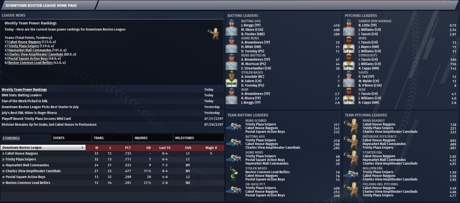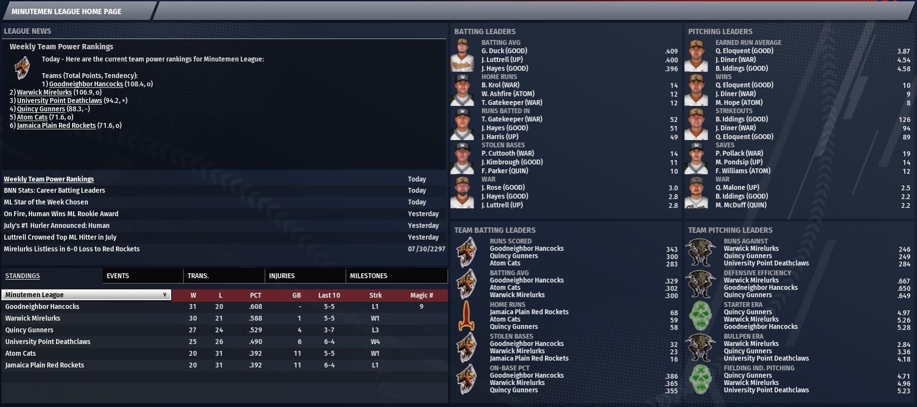 Today in the CBO News and Notes - Reports from around the Commonwealth by Nat Wright-Kowalski 22 July 2297 - BL: Party Boys Pull Off Thrilling 6-5 Win in Extras Finch Farm left fielder Danny Honeycutt had a good game, even if his team did not. The Four Leafs dropped a 6-5 decision in 10 innings to Nordhagen Beach at Slocum's Joe Seaside Stadium. Honeycutt was 2 for 3 with 2 home runs and 2 walks, while adding 3 RBI and scoring twice. The 5th-place Party Boys have won 5 straight. The game was decided with two out in the bottom of the tenth. With Nordhagen Beach trailing 5-4, Clux Oldstreet hit a fastball from Steve Warwar to left-center for a 2-run double. Just like that, the Party Boys had a walk-off win. "This place was jumping at the end," Oldstreet said. The Party Boys jumped out to a 4-0 lead in the 2nd inning when SS Taboo Richardson took a Matt Pageturner deep for a three-run bomb. Finch Farm answered with their first three runs in the 3rd inning to make it a close game. Peter Tatoeater hit an RBI double off Boys' ace Julian Shed. Honeycutt then followed with his first home run, a two-run blast to cut the lead to 4-3. In the 5th inning, Honeycutt struck again, tying the game at 4-4, where it remained heading into the 10th inning. After Tommy Junkman hit a solo home run in the top of the 10th off Nordhagen Beach closer Sia Abber, the Boys struck hard in the bottom of the inning for their fifth-straight victory. C3-88 Puppetboy led off the inning with a pinch-hit single. After Ryan Combs walked off Steve Warwar, the next two batters struck out, leaving the Boys with one out left. That is when Oldtreet put a first-pitch fastball off the left field wall, just missing a three-run jack but good enough to score both Puppetboy and Combs for the walk-off. "This was excitement," Nordhagen Beach manager Craig Robinson said. "This felt like a playoff game. Our guys were intense. I think they like winning ball games." With the win earlier in the day, County Crossing moved into sole possession of second place. The Party Boys now trail both the Four Leafs and Easy Town Assaultrons by a game. The Assaultrons were shutout by Salem. Other Scores: County Crossing 11 at The Slog 3 The County Crossing Bloodbugs trumped the slumping The Slog Ghouls, 11-3, at Tarberry Field Forever. County Crossing first baseman Josh Noggin was terrific. He went 3 for 4 with a home run, a double, and a walk, while scoring 3 runs and driving in 4. Bad Company Grognak got the win, improving to 9-4. He pitched 9 innings, giving up 8 hits and 3 runs, while striking out 4 and walking 2. The first-place Ghouls have lost 4 straight games. County Crossing grabbed the momentum in the top of the fifth, when Noggin, who leads the BL in doubles with 27, hit a 2-run home run. His 9th home run of the season put the Bloodbugs out in front, 4-2. Easy Town 0 at Salem 1 The Salem Witch Hats did little to support starter Mike Cartrette against the Easy Town Assaultrons, but it turned out he didn't need the help. The left-hander spun a complete-game shutout against the Assaultrons, striking out 10 and surrendering 2 hits. The performance from Cartrette allowed Salem to escape with the 1-0 win despite an anemic offense. There were a total of eight hits in the game, all singles. Chris Treestump's RBI single in the 6th inning led to the game's only run. 22 July 2297 - IL: Adamantium Fall Short, 2-1, at Fort Hagen In a low-scoring game between the Fort Hagen Silver Shroud and the Abernathy Adamantium, pitcher Brent Hooker was masterful on the mound. The Fort Hagen left-hander spearheaded his team's 2-1 win. Hooker went 8.2 innings to notch the win. He scattered 5 hits, walked 3, and struck out 6. His record improves to 4-8. The Silver Shroud sit in 4th place in the Institute League with a record of 22-24. In the bottom of the second, Tiger King hit a run-scoring double. The 13th double of the season for the Fort Hagen catcher put the Silver Shroud on top, 1-0. King called the win "a lesson in teamwork." After the Adamantium tied the game in the top of the 6th on Chris Hirshfield's solo home run, the Shroud retook the lead in the bottom of the inning in an unlikely way. Jim Tiller hit a one-out double and moved to third on a Mark Miller groundout. With Sam Noob up to bat, Abernathy ace Chris Woods threw a wild pitch to score Tiller. That run proved to be the winning run. Hooker was pulled in the 9th after he walked Canbed McMurty with two outs. Curtis Thriceshot then came in to get the final out and earn his 10th save of the season. "It's an unconventional way to win," Fort Hagen manager Mark Andersen said, "but we'll take it. Wins are like perfectly preserved pies. They don't always come out the machine, but you enjoy them when they do." Other Scores: Sunshine Tidings 5 at Concord 8 Behind the hitting of Jason Robinson, the Concord Radstags stopped the Sunshine Tidings Chemists, 8-5. Robinson was 2 for 3 with a home run, a double, and was hit by a pitch, while scoring 3 runs and driving in 4 for the Radstags. The win was credited to Burt Oldshoe in relief. His record improves to 3-0. Tony Bertha took the loss. Bell Franklin earned save number 7 this season. Robinson contributed in the bottom of the first. With the bases loaded, he hit a bases-clearing double. It was one at-bat among others that helped Concord get the win. Lexington 6 at Starlight 7, 11 inn. The Starlight Lady Killers took Lexington pitcher Pete Pembroke's best shot and still were able to claim a win at Valentine Detective Agency Field. The final score had Starlight getting past the Synths, 7-6. Pembroke went 7 innings and allowed 1 run, striking out 7. Starlight is now 26-20, 2 games up in the Institute League. A defensive lapse proved costly in the contest. With the game tied in the bottom of the 11th, an error by the Synths' shortstop Swift Hendrix, his second of the game, allowed the Lady Killers to score the winning run. 22 July 2297 - ML: Hancocks Deal Red Rockets 5-3 Defe