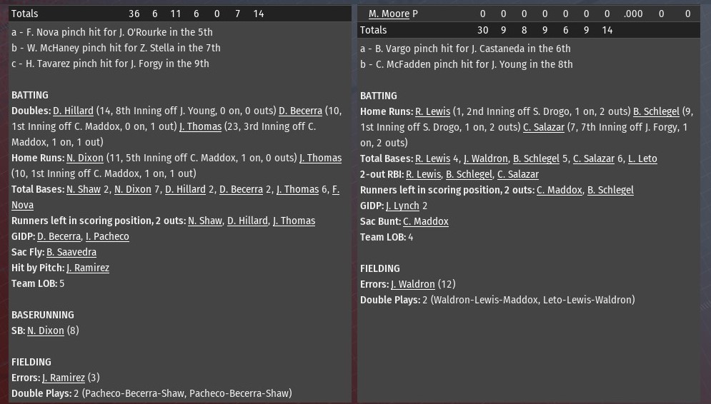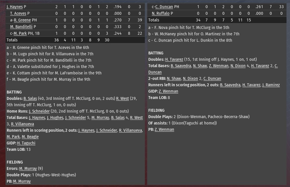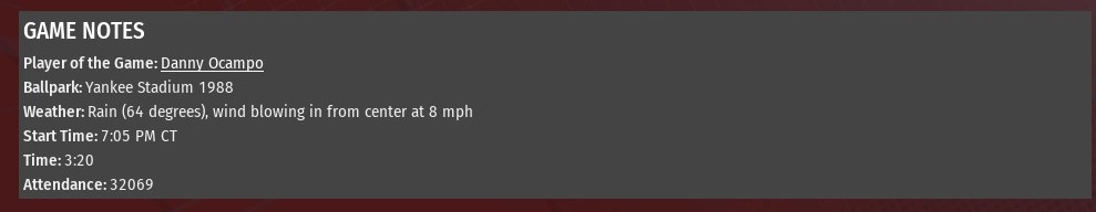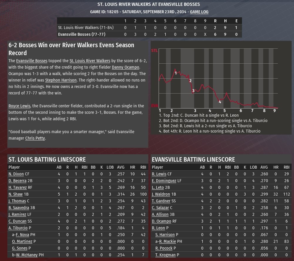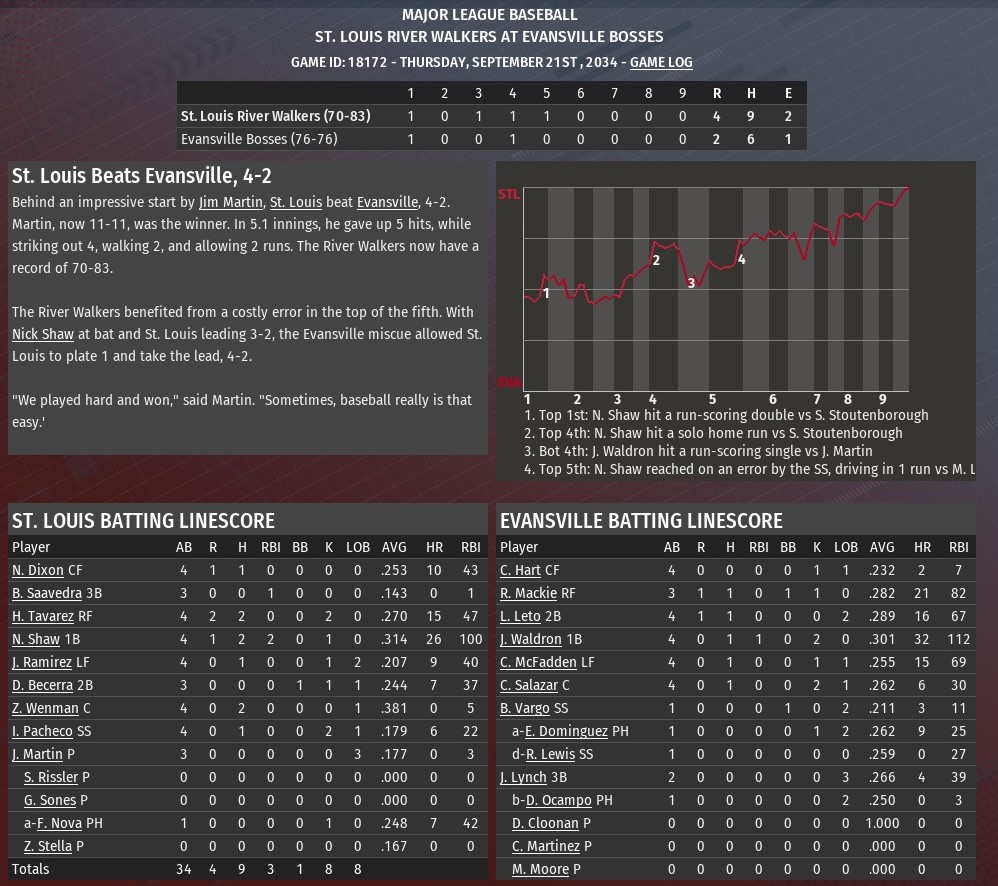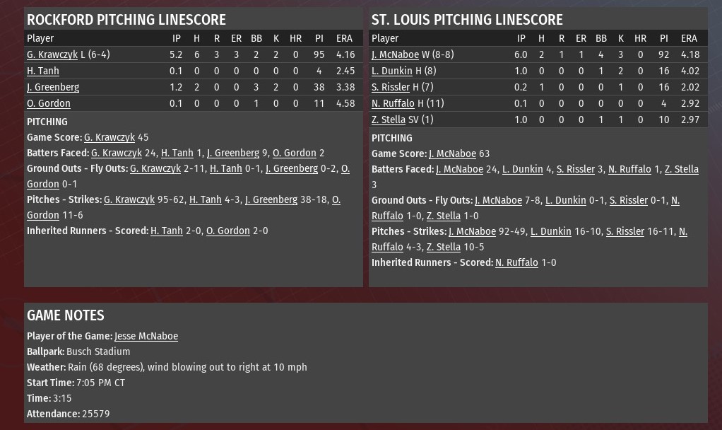 Jim Martin allowed two runs on five hits over the opening 5.1 innings, and that was enough to help St. Louis defeat Evansville 4-2 at Yankee Stadium (1968). Tied 1-1, the River Walkers actually took the lead for good in the top of the third inning against Bosses starting pitching Sam Stoutenborough. Nathaniel Dixon tripled with one out and scored on a fly ball by Bob Saavedra, as the rookie collected his first RBI at the major league level. St. Louis increased its lead to 3-1 in the fourth, Nick Shaw hitting his 26th homer of the season, this one off Stoutenborough, while also collecting his 100th RBI of the season. The Bosses' Jeff Waldron had an RBI single off Martin in the fourth, making it 3-2. The Walkers completed the scoring in the fifth. It all happened with two outs after reliever Matthew Liberatore entered the game. Hector Tavarez greeted him with a single. Tavarez stole second, and scored when Evansville shortstop Brian Vargo misplayed a ball hit by Shaw. Martin (11-11) allowed two runs on five hits in 5.1 innings. He struck out four and walked two. Scott Rissler worked out of a jam in the sixth, recording to outs and keeping the score 4-2. Rookie Greg Sones retired all six batters he faced in the seventh and eighth. Zachary Stella pitched a perfect ninth for his second save. Last edited by rink23; 08-18-2021 at 04:45 AM. |