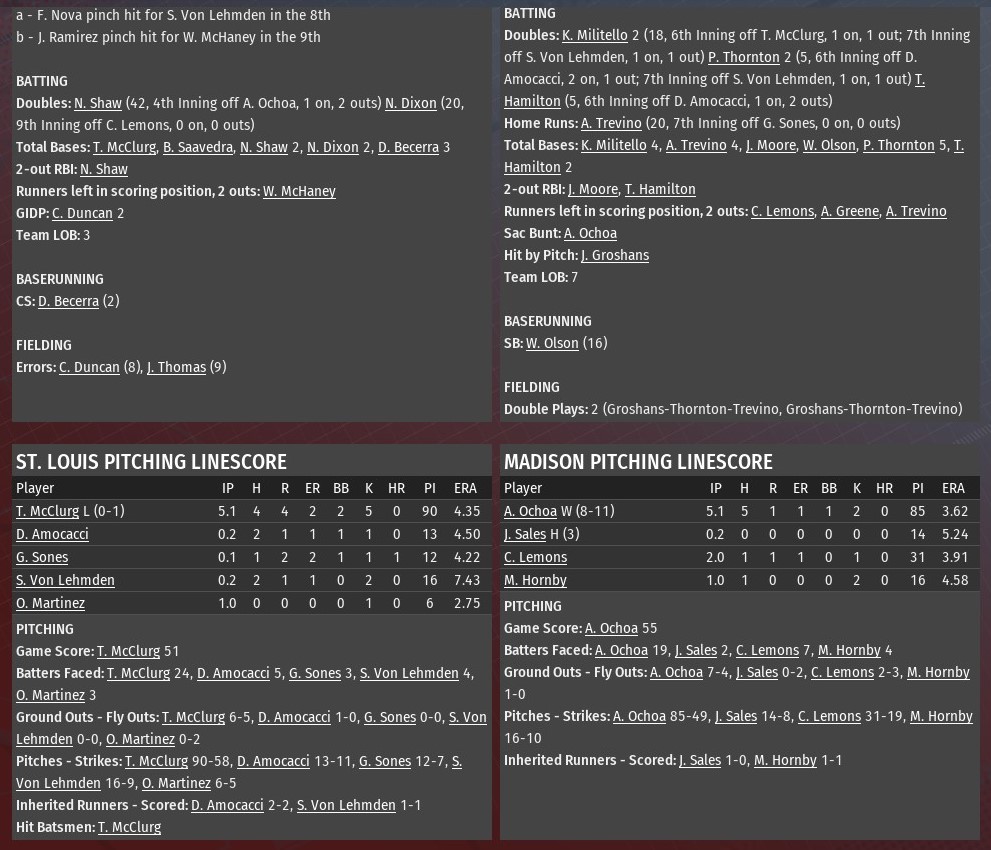 Trailing 4-3, St. Louis scored four times in the bottom of the eighth inning to defeat Springfield 7-4 and avoid getting swept in a three-game series at Busch Stadium (2006). A pair of walks -- one-out passes to Nick Shaw and Jose Ramirez from relief pitcher Carlos Aguirre -- got things rolling for the River Walkers in the bottom of the eighth. After the walk to Ramirez, Mike LaFramboise took over for the Railers. He was greeted by a pair of singles. The first, from rookie Bob Saavedra, the first of his career in the majors, loaded the bases. Zach Wenman then tied it with his single. Izaac Pacheco attempted to get a bunt down, only to have Ramirez thrown out at home. Pinch-hitter Chris Duncan, however, got things moving again with a two-run single. Nathaniel Dixon capped the outburst with another RBI single. Making his first start in the majors since 2033, Tom McClurg did all right allowing three runs on seven hits in five innings. He struck out six and walked four. David Amocaci, Oscar Martinez. Luke Dunkin and Nick Ruffalo all pitched an inning of relief. Dunkin (2-2) earned the win. Ruffalo collected his 13th save. |