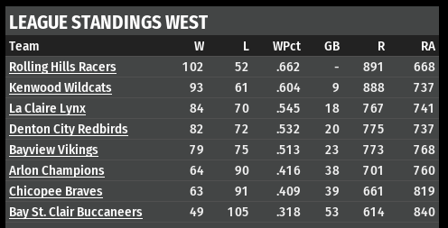 Thursday, April 5, 2063 DONE DEAL IN TU WEST! REPEAT FLAG FOR RACERS The best in the west just got better... The Islandian Times Preseason Poll has predicted that the Rolling Hills Racers will again steamroller everybody in the Tycobbian West Division and garner their fourth straight flag and they are also the favorite to win their third Pro Cup trophy in the last four seasons... the Islandian baseball experts and connoisseurs are picking the Racers to rampage to another easy TU West division title... and they will win it by double digits... Bayview, Kenwood, La Claire and Denton City are no match and will finish far behind Rolling Hills... and the other three clubs Arlon, Chicopee and Bay St. Clair will wind up deep in the depths of the division... they could trail Rolling Hills by 40 or more games. Are the Rolling Hills Racers that good?... yessiree, they are that good... the Racers have outstanding hitting and scoring, plus they have now added several quality pitchers, too... they traded two talented backup first sackers and a fine backup center fielder for three starting pitchers and a second baseman... Rolling Hills got pitchers Charley Clutterbuck (14-15/3.05) and Marty Yaden (8-14/3.48) from East Point for Mark Carmickle (.300/18 HR/83 RBI) and pitcher Jordy Wales (15-5/3.10) from Southport for Dayton Mayfield (.364/0 HR/12 RBI)... Mayfield only made 10 starts last year for the Racers, but in 2060, his only full season, he batted .307 with 12 homers and 67 runs batted in... Mayfield is also a standout defender at first base... the Racers added a good second baseman Clayton Claiborne (.327/2 HR/54 RBI/52 R) from North Hill for center fielder Gil Arthur (.340/10 HR/58 RBI/51 R/10 SB)... Clutterbuck and Yaden will join starters Vance Dillaway (17-5/3.15) and Brownie Ashmore (14-5/3.34) in the starting rotation... Claiborne will be the regular second sacker this season... Rolling Hills has only one shortcoming... they could use some help in the bullpen... Rob Gates (12-6/3.66 ERA/14 saves/48 games) is just a fair-to-middling closer... Jordy Wales could be a big help there and also as a solid spot starter... and now we take a look at the Rolling Hills batting order... it's really scary... almost entirely .300 hitters, led by Teddy Stonich (.345/31 HR/134 RBI), Jean-Luc Roubique (.331/18 HR/87 RBI), Hugo Sutton (.329/16 HR/83 RBI), Jameson Mulbert (.299/2 HR/74 RBI/103 R/14 SB), Jimmy Brandini (.318/12 HR/60 RBI), Lee Fountain (.299/13 HR/8I RBI) and Clayton Claiborne (.327/2 HR/54 RBI)... and almost all of the backups are .300 hitters, too... add into the lineup, first baseman Luca Palazzi (.303/2 HR/22 RBI/41 R/6 SB)... he will be the fulltime first baseman this season... he didn't get to play much last year... Palazzi is highly-touted player and has much potential: .300 batter, 20 homers, 80 RBIs, 100 runs, 25 stolen bases are reasonable expectations according to the baseball scouts... the Rolling Hills Racers could win 110 games this year... they are that good... could be 115, too. The Bayview Vikings are rated the second-best club in the Tycobbian West... mainly because they have the second-best pitching staff... plus some good, solid hitters with some power... '57 (84-70) and '60 (82-72) were good years for the Viks, at least record-wise, but they haven't won a TU West pennant since 2016... they are not a very successful IPA franchise... Bayview has only appeared in the postseason playoffs 6 times with no Pro Cup trophies yet... but the Vikings are certainly not in the class of Rolling Hills... not on the hill and not at the plate... last season Bayview came in fifth, just 4 games over .500... but they have two quality starters in Ivar Rasmussen (16-9/2.90) and James Farnham (16-6/3.23)... the starters need help... and the bullpen really needs help... but the Bayview bats are pretty good with Gunnar Lindberg (.349/17 HR/72 RBI/102 R), Lou Fairhead (.283/25 HR/93 RBI), Goldy O'Toole (.287/19 HR/93 RBI), Yazzy Ricks (.244/22 HR/103 RBI), Vern Woodcock (.271/24 HR/67 RBI/87 R), Jonas Stephens (.283/16 HR/59 RBI) and Noel Connors (.300/10 HR/60 RBI). According to the baseball scribes and sportcasters the third-best team in the TU West will be the Kenwood Wildcats... they had a fine season last year, winding up 93-61... but not good enough to compete with Rolling Hills... the Wildcats trailed that powerhouse by 9 games... they had the offense to hang with the Racers (.287 BA), but didn't have the pitching (4.24 ERA)... same thing this year, except the pitching appears to be worse... Dennis Tarrant (19-7/3.66) is the best starter... the rest are just mediocre: Red Bradford (16-8/4.12) and Mickey Maughan (13-9/4.28)... the bullpen is not so good, either, with closer Pee Wee Windham (6-11/4.35 ERA/29 saves/58 games)... but Kenwood can hit... leading the attack are Bralen Connally (.307/27 HR/102 RBI), John Michael Lansdell (.342/24 HR/96 RBI), Gabriel Macedo (.304/29 HR/88 RBI), Joe Kellogg (.305/8 HR/77 RBI), Bailey Brumley (.309/6 HR/69 RBI), Lorne Latimer (.313/5 HR/55 RBI), Esra McCluskey (.345/5 HR/36 RBI) and Eliot Epperson (.318/3 HR/29 RBI)... down through its IPA history the Wildcats have fared well with an overall winning record (.514)... with 10 playoff appearances and one Pro Cup (2014)... Kenwood did well last year with a high-octane attack... may be they can do it again... second place in the Tycobbian West sounds good... methinks, on paper the Wildcats are better than Bayview. The La Claire Lynx are pretty much in the same boat as Kenwood... good offense, lackluster pitching... last year they did well with an 84-70 mark, good enough for the third spot in the standings, but that was still 18 games behind TU West champion and Pro Cup winner Rolling Hills... they are picked to finish fourth in the race this season... heading up the offensive attack are Jonny Bacon (.285/23 HR/100 RBI), Derek Winchester (.320/12 HR/100 RBI), Taro Lansing (.277/17 HR/94 RBI), Sean McEwen (.277/1