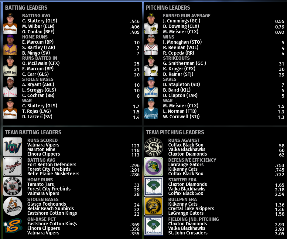 Tuesday, May 1, 2063 GATORS, DIAMONDS, RACCOONS, BLACK SOX TOP RU In Ruthlandian Union play the first month of the 2063 Islandian Pro Alliance season, the contenders are doing well and a few lesser lights may be playing over their heads... the LaGrange Gators jumped out into the lead in the Ruthlandian North, the Claxton Diamonds head up the Ruthlandian South, the Cold Creek Raccoons are sitting atop of the Ruthlandian East and the Colfax Black Sox took the early lead in the Ruthlandian West... only the Raccoons raised any eyebrows... the other three leaders were forecast to be contenders. Several other unlikely challengers made a little noise in April... The Taranto Tars are tied for second in the RU North... the Crystal Lake Skippers are third in the RU South... and the Stoner Stars are running second in the RU West... Cold Creek, Taranto, Crystal Lake and Stoner were not highly touted in the preseason polls... there were several well-rated teams that started off the year slowly... in the RU North, Kilkenny and Glasgo had poor months... Grand City slumped in the RU South... and Volusia had a bad first month of play in the RU West. 2063 Ruthlandian Union Standings Tuesday, May 1, 2063 Last edited by Eugene Church; 03-05-2020 at 06:11 PM. |