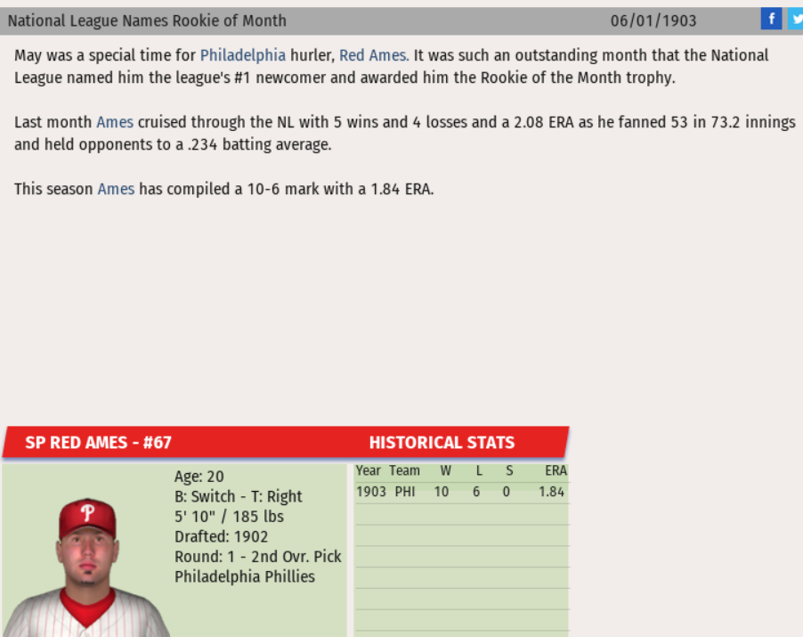 For the 2nd time in his young career, Philadelphia Phillies pitcher Red Ames earned National League Rookie of the Month honors. In order to receive the selection, Ames posted a record of 5-4 and a 2.08 ERA in 73 2/3 innings, and generated 2.7 WAR and 2.3 WPA.