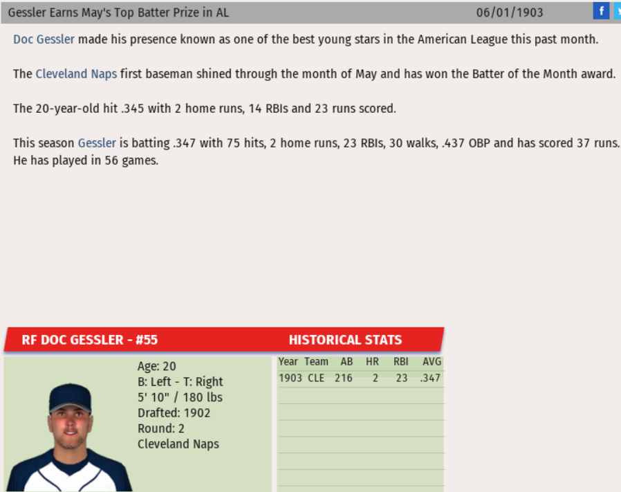 While his Cleveland Naps may not be playing up to expectations, Doc Gessler is putting together a great season. In picking up the American League Batter of the Month award, Gessler went 39 for 113 (.345 batting average) with 9 Doubles, 2 Triples, 2 Homeruns, 23 Runs, 14 RBIs, 15 Walks, and 8 Stolen Bases which was good for a slash line of .345/.439/.513 and generated 2.2 WAR and 1.38 WPA.