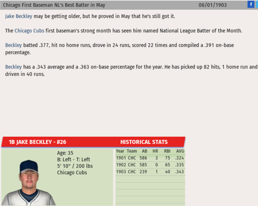 As the "Old Man" in the clubhouse, Jake Beckley has heard it all from his Chicago Cub teammates. While they may not let up on his age, the fact that Beckley took home National League Batter of the Month honors will get him some well-deserved praise from his team. In picking up the award, Beckley batted .377 (46 for 122) with 8 Doubles, 1 Triple, 22 Runs, 24 RBIs, and 3 Walks to finish with a slash line of .377/.391/.459 that resulted in 1.4 WAR and 0.87 WPA. This is Beckley's second PofM honor.