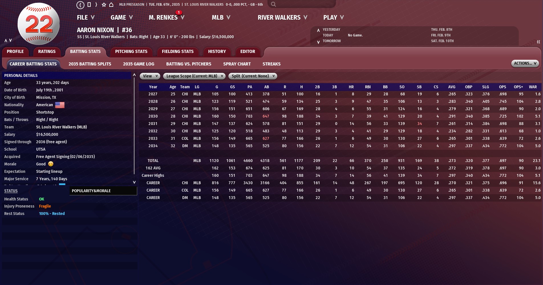 Strother has spent the past four seasons as the closer for Toledo. He recorded a career-high 40 saves in 2031. Last season, Strother got into 64 games and went 8-6 with 29 saves and a 3.00 ERA. He blew eight saves. Going to Toledo will be right-hander Kyle Smarr. Smarr made nine starts in the majors for the Walkers in 2034, going 4-4 with a 4.85 ERA. Smarr went 6-6 for AAA Memphis, posting a 3.81 ERA. |
